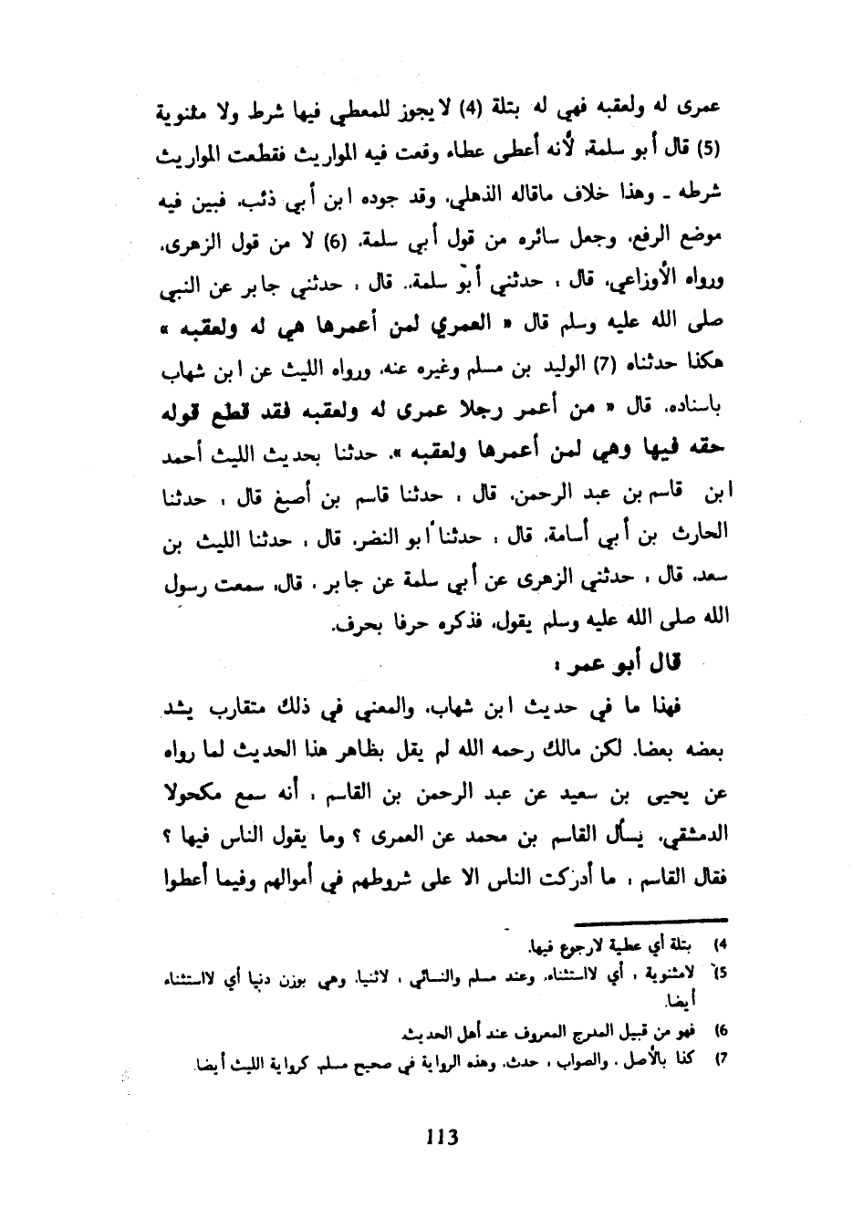 عُمْرَى لَهُ وَلِعَقِبِهِ فَهِيَ لَهُ بَتْلَةٌ لَا يَجُوزُ لِلْمُعْطِي فِيهَا شَرْطٌ وَلَا مَثْنَوِيَّةٌ قَالَ أَبُو سَلَمَةَ لِأَنَّهُ أَعْطَى عَطَاءً وَقَعَتْ فِيهِ الْمَوَارِيثُ فَقَطَعَتِ الْمَوَارِيثُ شَرْطَهُ وَهَذَا خِلَافَ مَا قَالَهُ الذُّهْلِيُّ وَقَدْ جَوَّدَهُ ابْنُ أَبِي ذِئْبٍ فَبَيَّنَ فِيهِ مَوْضِعَ الرَّفْعِ وَجَعَلَ سَائِرَهُ مِنْ قَوْلِ أَبِي سَلَمَةَ لَا مِنْ قَوْلِ الزُّهْرِيِّ وَرَوَاهُ الْأَوْزَاعِيُّ قَالَ حَدَّثَنِي أَبُو سَلَمَةَ قَالَ حَدَّثَنِي جَابِرٍ عَنِ النَّبِيِّ صَلَّى اللَّهُ عَلَيْهِ وَسَلَّمَ قَالَ الْعُمْرَى لِمَنْ أَعْمَرَهَا هِيَ لَهُ وَلِعَقِبِهِ هَكَذَا حَدَّثَنَاهُ الْوَلِيدُ بْنُ مُسْلِمٍ وَغَيْرُهُ عَنْهُ وَرَوَاهُ اللَّيْثُ عَنِ ابْنِ شِهَابٍ بِإِسْنَادِهِ قَالَ مَنْ أَعْمَرَ رَجُلًا عُمْرَى لَهُ وَلِعَقِبِهِ فَقَدْ قَطَعَ قَوْلُهُ حَقَّهُ فِيهَا وَهِيَ لِمَنْ أَعْمَرَهَا وَلِعَقِبِهِ حَدَّثَنَا بِحَدِيثِ اللَّيْثِ أَحْمَدُ بْنُ قَاسِمِ بْنِ عَبْدِ الرَّحْمَنِ قَالَ حَدَّثَنَا قَاسِمُ بْنُ أَصْبَغَ قَالَ حَدَّثَنَا الْحَارِثُ بْنُ أَبِي أُسَامَةَ قَالَ حَدَّثَنَا أَبُو النَّضْرِ قَالَ حَدَّثَنَا اللَّيْثُ بْنُ سَعْدٍ قَالَ حَدَّثَنِي الزُّهْرِيُّ عَنْ أَبِي سَلَمَةَ عَنْ جَابِرٍ قَالَ سَمِعْتُ رَسُولَ اللَّهِ صَلَّى اللَّهُ عَلَيْهِ وَسَلَّمَ يَقُولُ فَذَكَرَهُ حَرْفًا بِحَرْفٍ - قَالَ أَبُو عُمَرَ فَهَذَا مَا فِي حَدِيثِ ابْنِ شِهَابٍ وَالْمَعْنَى فِي ذَلِكَ متقارب يشد بعضه بعضا لكن مالك رَحِمَهُ اللَّهُ لَمْ يَقُلْ بِظَاهِرِ هَذَا الْحَدِيثِ لِمَا رَوَاهُ عَنْ يَحْيَى بْنِ سَعِيدٍ عَنْ عَبْدِ الرَّحْمَنِ بْنِ الْقَاسِمِ أَنَّهُ سَمِعَ مَكْحُولًا الدِّمَشْقِيَّ يَسْأَلُ الْقَاسِمَ بْنَ مُحَمَّدٍ عَنْ الْعُمْرَى وَمَا يَقُولُ النَّاسُ فِيهَا فَقَالَ الْقَاسِمُ مَا أَدْرَكْتُ النَّاسَ إِلَّا عَلَى شُرُوطِهِمْ فِي أَمْوَالِهِمْ وفيما أعطوا