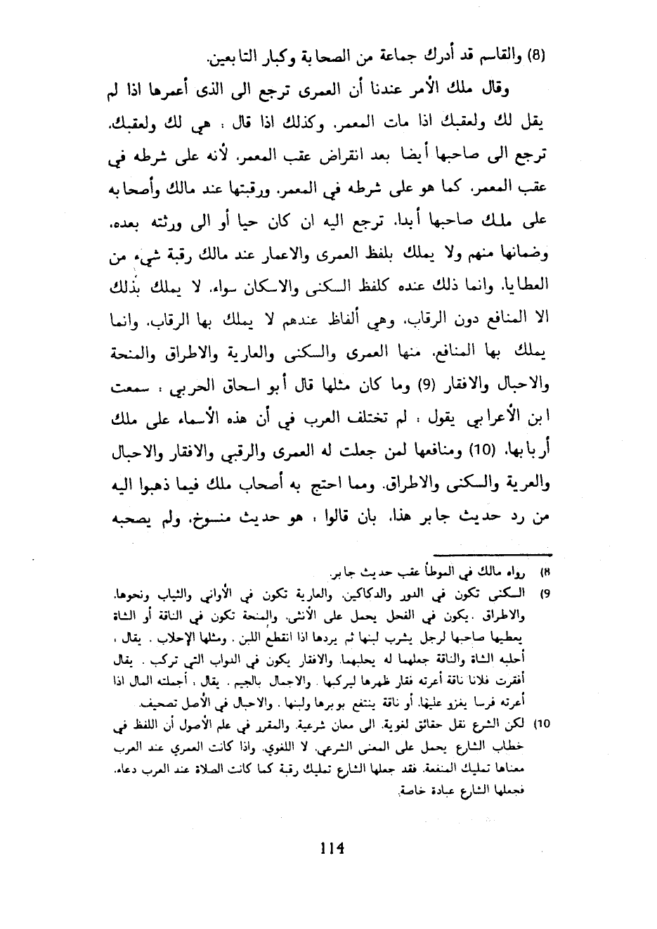 وَالْقَاسِمُ قَدْ أَدْرَكَ جَمَاعَةً مِنَ الصَّحَابَةِ وَكِبَارِ التابعين وقال ملك الْأَمْرُ عِنْدَنَا أَنَّ الْعُمْرَى تَرْجِعُ إِلَى الَّذِي أَعْمَرَهَا إِذَا لَمْ يَقُلْ لَكَ وَلِعَقِبِكَ إِذَا مَاتَ الْمُعْمِرُ وَكَذَلِكَ إِذَا قَالَ هِيَ لَكَ وَلِعَقِبِكَ تَرْجِعُ إِلَى صَاحِبِهَا أَيْضًا بَعْدَ انْقِرَاضِ عَقِبِ الْمُعْمِرِ لِأَنَّهُ عَلَى شَرْطِهِ فِي عَقِبِ الْمُعْمِرِ كَمَا هُوَ عَلَى شَرْطِهِ فِي الْمُعْمِرِ وَرَقَبَتُهَا عِنْدَ مَالِكٍ وَأَصْحَابِهِ عَلَى مِلْكِ صَاحِبِهَا أَبَدًا تَرْجِعُ إِلَيْهِ إِنْ كَانَ حَيًّا أَوْ إِلَى وَرَثَتِهِ بَعْدَهُ وَضَمَانُهَا مِنْهُمْ وَلَا يَمْلِكُ بِلَفْظِ الْعُمْرَى وَالْأَعْمَارُ عِنْدَ مَالِكٍ رَقَبَةُ شَيْءٍ مِنَ الْعَطَايَا وَإِنَّمَا ذَلِكَ عِنْدَهُ كَلَفْظِ السُّكْنَى وَالْإِسْكَانِ سَوَاءً لَا يَمْلِكُ بِذَلِكَ إِلَّا الْمَنَافِعَ دُونَ الرِّقَابِ وَهِيَ أَلْفَاظٌ عِنْدَهُمْ لَا يُمْلَكُ بِهَا الرِّقَابُ وَإِنَّمَا يُمْلَكُ بِهَا الْمَنَافِعُ مِنْهَا الْعُمْرَى وَالسُّكْنَى وَالْعَارِيَةُ وَالْأَطْرَاقُ وَالْمِنْحَةُ وَالْأَحْبَالُ وَالْأَفْقَارُ وَمَا كَانَ مِثْلُهَا قَالَ أَبُو إِسْحَاقَ الْحَرْبِيُّ سَمِعْتُ ابْنَ الْأَعْرَابِيِّ يَقُولُ لَمْ تَخْتَلِفِ الْعَرَبُ فِي أَنَّ هَذِهِ الْأَسْمَاءَ عَلَى مِلْكِ أَرْبَابِهَا وَمَنَافِعِهَا لِمَنْ جُعِلَتْ لَهُ الْعُمْرَى وَالرُّقْبَى وَالْأَفْقَارُ وَالْأَحْبَالُ وَالْعَرِيَّةُ وَالسُّكْنَى وَالْأَطْرَاقُ وَمِمَّا احْتَجَّ بِهِ أصحاب ملك فِيمَا ذَهَبُوا إِلَيْهِ مِنْ رَدِّ حَدِيثِ جَابِرٍ هَذَا بِأَنْ قَالُوا هُوَ حَدِيثٌ مَنْسُوخٌ وَلَمْ يصحبه
