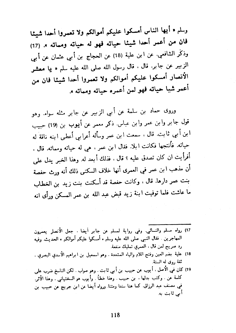 أَيُّهَا النَّاسُ أَمْسِكُوا عَلَيْكُمْ أَمْوَالَكُمْ وَلَا تُعْمِرُوا أَحَدًا شَيْئًا فَإِنَّ مَنْ أَعْمَرَ أَحَدًا شَيْئًا حَيَاتَهُ فَهُوَ لَهُ حَيَاتَهُ وَمَمَاتَهُ وَذَكَرَ الشَّافِعِيُّ عَنِ ابْنِ عُلَيَّةَ عَنِ الْحَجَّاجِ بْنِ أَبِي عُثْمَانَ عَنْ أَبِي الزُّبَيْرِ عَنْ جَابِرٍ قَالَ قَالَ رَسُولُ اللَّهِ صَلَّى اللَّهُ عَلَيْهِ وَسَلَّمَ يَا مَعْشَرَ الْأَنْصَارِ أَمْسِكُوا عَلَيْكُمْ أَمْوَالَكُمْ وَلَا تُعْمِرُوا أَحَدًا شَيْئًا فَإِنَّ مَنْ أَعْمَرَ شَيْئًا حَيَاتَهُ فَهُوَ لِمَنْ أَعْمَرَهُ حَيَاتَهُ وَمَمَاتَهُ وَرَوَى حَمَّادُ بْنُ سَلَمَةَ عَنْ أَبِي الزُّبَيْرِ عَنْ جَابِرٍ مِثْلَهُ سَوَاءً وَهُوَ قَوْلُ جَابِرٍ وَابْنِ عُمَرَ وَابْنِ عَبَّاسٍ ذَكَرَ مَعْمَرٌ عَنْ أَيُّوبَ بْنِ حَبِيبِ بْنِ أَبِي ثَابِتٍ قَالَ سَمِعْتُ ابْنَ عُمَرَ وَسَأَلَهُ أَعْرَابِيٌّ أَعْطَى ابْنَهُ نَاقَةً لَهُ حَيَاتَهُ فَأَنْتَجَهَا فَكَانَتْ إِبِلًا فَقَالَ ابْنُ عُمَرَ هِيَ لَهُ حَيَاتَهُ وَمَمَاتَهُ قَالَ أَفَرَأَيْتَ إِنْ كَانَ تَصَدَّقَ عَلَيْهِ قَالَ فَذَلِكَ أَبْعَدُ لَهُ وَهَذَا الْخَبَرُ يَدُلُّ عَلَى أَنَّ مَذْهَبَ ابْنِ عُمَرَ فِي الْعُمْرَى أَنَّهَا خِلَافُ السُّكْنَى ذَلِكَ أَنَّهُ وَرَّثَ حَفْصَةَ بِنْتَ عُمَرَ دَارَهَا قَالَ وَكَانَتْ حَفْصَةُ قَدْ أَسْكَنَتْ بِنْتَ زَيْدِ بْنِ الْخَطَّابِ مَا عَاشَتْ فَلَمَّا تُوُفِّيَتِ ابْنَةُ زَيْدٍ قَبَضَ عَبْدُ اللَّهِ بْنُ عُمَرَ الْمَسْكَنَ ورأى أنه