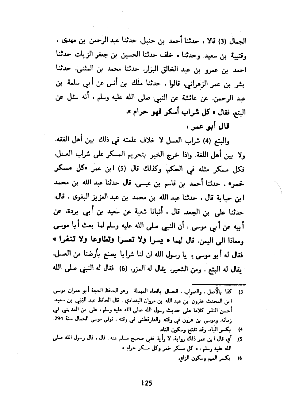 الْجَمَّالُ قَالَا حَدَّثَنَا أَحْمَدُ بْنُ حَنْبَلٍ حَدَّثَنَا عَبْدُ الرَّحْمَنِ بْنُ مَهْدِيٍّ وَقُتَيْبَةُ بْنُ سَعِيدٍ وَحَدَّثَنَاهُ خَلَفٌ حَدَّثَنَا الْحُسَيْنُ بْنُ جَعْفَرٍ الزَّيَّاتُ حَدَّثَنَا أَحْمَدُ بْنُ عَمْرِو بْنِ عَبْدِ الْخَالِقِ الْبَزَّارُ حَدَّثَنَا مُحَمَّدُ بْنُ الْمُثَنَّى حَدَّثَنَا بِشْرُ بن عمر الزهراني قالوا حدثنا ملك بْنُ أَنَسٍ عَنْ أَبِي سَلَمَةَ بْنِ عَبْدِ الرَّحْمَنِ عَنْ عَائِشَةَ عَنِ النَّبِيِّ صَلَّى اللَّهُ عَلَيْهِ وَسَلَّمَ أَنَّهُ سُئِلَ عَنِ الْبِتْعِ فَقَالَ كُلُّ شَرَابٍ أَسْكَرَ فَهُوَ حَرَامٌ - قَالَ أَبُو عُمَرَ وَالْبِتْعُ شَرَابُ الْعَسَلِ لَا خِلَافَ عَلِمْتُهُ فِي ذَلِكَ بَيْنَ أَهْلِ الْفِقْهِ وَلَا بَيْنَ أَهْلِ اللُّغَةِ وَإِذَا خَرَجَ الْخَبَرُ بِتَحْرِيمِ الْمُسْكِرِ عَلَى شَرَابِ الْعَسَلِ فَكُلُّ مُسْكِرٍ مِثْلُهُ فِي الْحُكْمِ وَكَذَلِكَ قَالَ ابْنُ عُمَرَ كُلُّ مُسْكِرٍ خَمْرٌ حَدَّثَنَا أَحْمَدُ بْنُ قَاسِمِ بْنِ عِيسَى قَالَ حَدَّثَنَا عبد اللَّهِ بْنُ مُحَمَّدِ بْنِ حَبَابَةَ قَالَ حَدَّثَنَا عَبْدُ اللَّهِ بْنُ مُحَمَّدِ بْنِ عَبْدِ الْعَزِيزِ الْبَغَوِيُّ قَالَ حَدَّثَنَا عَلِيُّ بْنُ الْجَعْدِ قَالَ أَنْبَأَنَا شُعْبَةُ عَنْ سَعِيدِ بْنِ أَبِي بُرْدَةَ عَنْ أَبِيهِ عَنْ أَبِي مُوسَى أَنَّ النَّبِيَّ صَلَّى اللَّهُ عَلَيْهِ وَسَلَّمَ لَمَّا بَعَثَ أَبَا مُوسَى وَمُعَاذًا إِلَى الْيَمَنِ قَالَ لَهُمَا يَسِّرَا وَلَا تُعَسِّرَا وَتَطَاوَعَا وَلَا تُنَفِّرَا فَقَالَ لَهُ أَبُو مُوسَى يَا رَسُولَ اللَّهِ إِنَّ لَنَا شَرَابًا يُصْنَعُ بِأَرْضِنَا مِنَ الْعَسَلِ يُقَالُ لَهُ الْبِتْعُ وَمِنَ الشَّعِيرِ يُقَالُ لَهُ الْمِزْرُ فَقَالَ لَهُ النَّبِيُّ صَلَّى اللَّهُ