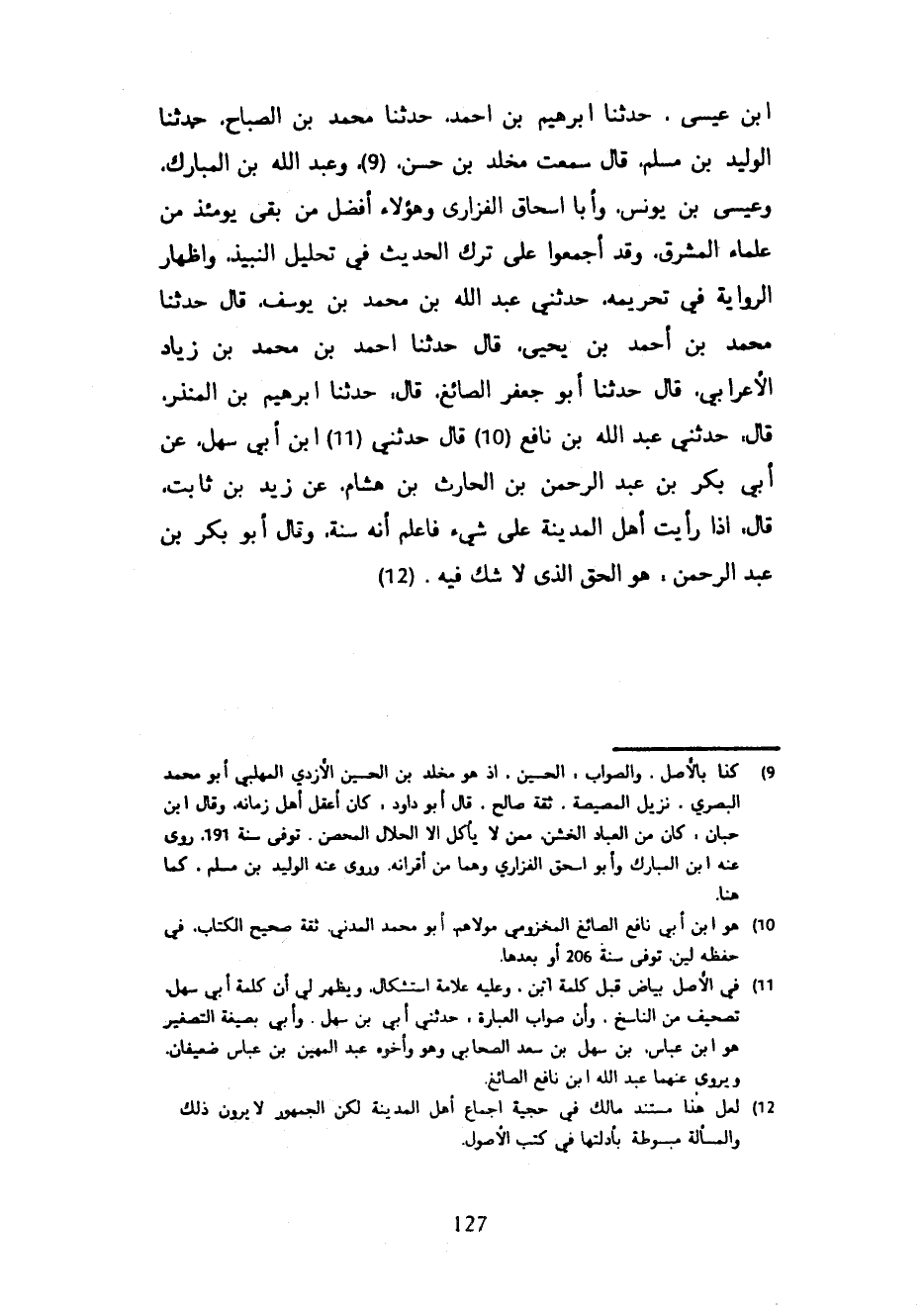 ابن عِيسَى حَدَّثَنَا إِبْرَاهِيمُ بْنُ أَحْمَدَ حَدَّثَنَا مُحَمَّدٌ بن الصباح حَدَّثَنَا الْوَلِيدُ بْنُ مُسْلِمٍ قَالَ سَمِعْتُ مَخْلَدَ بْنَ حَسَنٍ وَعَبْدَ اللَّهِ بْنَ الْمُبَارَكِ وَعِيسَى بْنَ يُونُسَ وَأَبَا إِسْحَاقَ الْفَزَارِيَّ وَهَؤُلَاءِ أَفْضَلُ مَنْ بَقِيَ يَوْمَئِذٍ مِنْ عُلَمَاءِ الْمَشْرِقِ وَقَدْ أَجْمَعُوا عَلَى تَرْكِ الْحَدِيثِ فِي تَحْلِيلِ النَّبِيذِ واظهار الرواية في تحريمه حَدَّثَنِي عَبْدُ اللَّهِ بْنُ مُحَمَّدِ بْنِ يُوسُفَ قَالَ حَدَّثَنَا مُحَمَّدُ بْنُ أَحْمَدَ بْنِ يَحْيَى قَالَ حَدَّثَنَا أَحْمَدُ بْنُ مُحَمَّدِ بْنِ زِيَادٍ الْأَعْرَابِيُّ قَالَ حَدَّثَنَا أَبُو جَعْفَرٍ الصَّائِغُ قَالَ حَدَّثَنَا إِبْرَاهِيمُ بْنُ الْمُنْذِرِ قَالَ حَدَّثَنِي عَبْدُ اللَّهِ بْنُ نَافِعٍ قَالَ حَدَّثَنِي ابْنُ أَبِي سَهْلٍ عَنْ أَبِي بَكْرِ بْنِ عَبْدِ الرَّحْمَنِ بْنِ الْحَارِثِ بْنِ هِشَامٍ عَنْ زَيْدِ بْنِ ثَابِتٍ قَالَ إِذَا رَأَيْتَ أَهْلَ الْمَدِينَةِ عَلَى شَيْءٍ فَاعْلَمْ أَنَّهُ سُنَّةٌ وَقَالَ أَبُو بَكْرِ بْنُ عَبْدِ الرَّحْمَنِ هُوَ الْحَقُّ الَّذِي لَا شك فيه