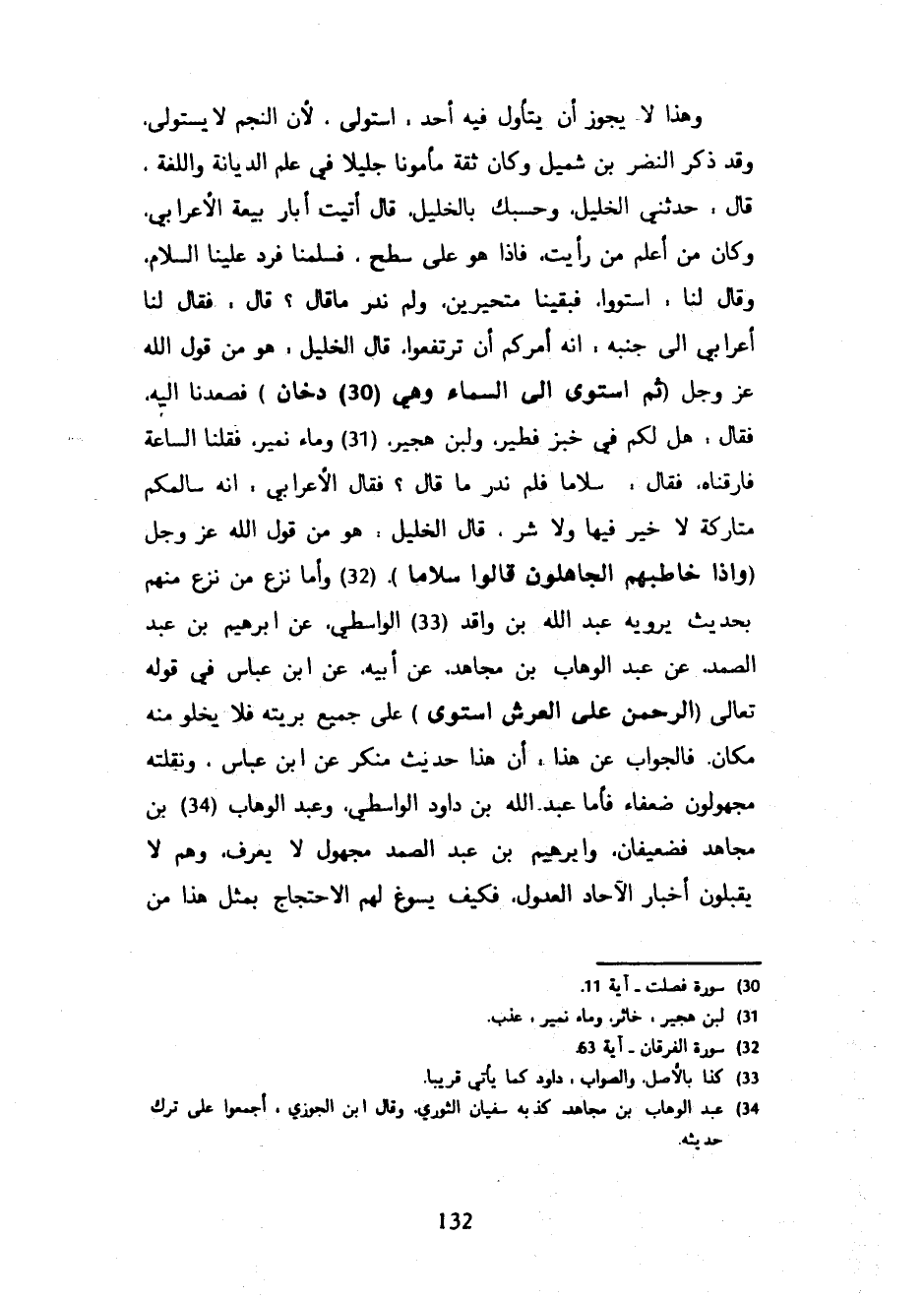 وَهَذَا لَا يَجُوزُ أَنْ يَتَأَوَّلَ فِيهِ أَحَدٌ اسْتَوْلَى لِأَنَّ النَّجْمَ لَا يَسْتَوْلِي وَقَدْ ذَكَرَ النَّضْرُ بْنُ شُمَيْلٍ وَكَانَ ثِقَةً مَأْمُونًا جَلِيلًا فِي عِلْمِ الدِّيَانَةِ وَاللُّغَةِ قَالَ حَدَّثَنِي الْخَلِيلُ وَحَسْبُكَ بِالْخَلِيلِ قَالَ أَتَيْتُ أَبَا رَبِيعَةَ الْأَعْرَابِيَّ وَكَانَ مِنْ أَعْلَمِ مَنْ رَأَيْتُ فَإِذَا هُوَ عَلَى سَطْحٍ فَسَلَّمْنَا فَرَدَّ عَلَيْنَا السَّلَامَ وَقَالَ لَنَا اسْتَوُوا فَبَقِينَا مُتَحَيِّرِينَ وَلَمْ نَدْرِ مَا قَالَ قَالَ فَقَالَ لَنَا أَعْرَابِيٌّ إِلَى جَنْبِهِ إِنَّهُ أَمَرَكُمْ أَنْ تَرْتَفِعُوا قَالَ الْخَلِيلُ هُوَ مِنْ قَوْلِ اللَّهِ عَزَّ وَجَلَّ ثُمَّ اسْتَوَى إِلَى السَّمَاءِ وَهِيَ دُخَانٌ فَصَعِدْنَا إِلَيْهِ فَقَالَ هَلْ لَكُمْ فِي خُبْزٍ فَطَيْرٍ وَلَبَنٍ هَجِيرٍ وَمَاءٍ نَمِيرٍ فَقُلْنَا السَّاعَةَ فَارَقْنَاهُ فَقَالَ سَلَامًا فَلَمْ نَدْرِ مَا قَالَ فَقَالَ الْأَعْرَابِيُّ إِنَّهُ سَالَمَكُمْ مُتَارَكَةً لَا خَيْرَ فِيهَا وَلَا شَرَّ قَالَ الْخَلِيلُ هُوَ مِنْ قَوْلِ اللَّهِ عَزَّ وَجَلَّ وَإِذَا خَاطَبَهُمُ الْجَاهِلُونَ قَالُوا سَلَامًا وَأَمَّا نَزْعُ مَنْ نَزَعَ مِنْهُمْ بِحَدِيثٍ يَرْوِيهِ عَبْدُ الله بن واقد الواسطي عن إبرهيم بْنِ عَبْدِ الصَّمَدِ عَنْ عَبْدِ الْوَهَّابِ بْنِ مُجَاهِدٍ عَنْ أَبِيهِ عَنِ ابْنِ عَبَّاسٍ فِي قَوْلِهِ تَعَالَى الرَّحْمَنُ عَلَى الْعَرْشِ اسْتَوَى عَلَى جَمِيعِ بَرِيَّتِهِ فَلَا يَخْلُو مِنْهُ مَكَانٌ فَالْجَوَابُ عَنْ هَذَا أَنَّ هَذَا حَدِيثٌ مُنْكَرٌ عَنِ ابْنِ عَبَّاسٍ وَنَقَلَتُهُ مَجْهُولُونَ ضُعَفَاءُ فَأَمَّا عَبْدُ اللَّهِ بْنُ دَاوُدَ الْوَاسِطِيُّ وَعَبْدُ الْوَهَّابِ بْنُ مجاهد فضعيفان وإبرهيم بْنُ عَبْدِ الصَّمَدِ مَجْهُولٌ لَا يُعْرَفُ وَهُمْ لَا يَقْبَلُونَ أَخْبَارَ الْآحَادِ الْعُدُولَ فَكَيْفَ يَسُوغُ لَهُمُ الِاحْتِجَاجُ بِمِثْلِ هَذَا مِنَ