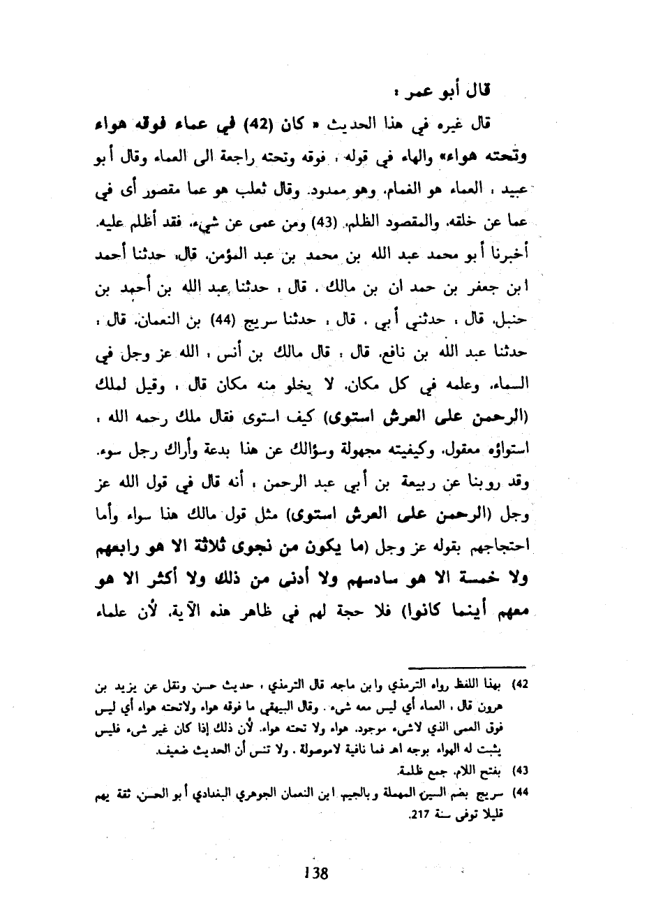قَالَ أَبُو عُمَرَ قَالَ غَيْرُهُ فِي هَذَا الْحَدِيثِ كَانَ فِي عَمَاءٍ فَوْقَهُ هَوَاءٌ وَتَحْتَهُ هَوَاءٌ وَالْهَاءُ فِي قَوْلِهِ فَوْقَهُ وَتَحْتَهُ رَاجِعَةٌ إِلَى الْعَمَاءِ وَقَالَ أَبُو عُبَيْدٍ الْعَمَاءُ هُوَ الْغَمَامُ وَهُوَ مَمْدُودٌ وَقَالَ ثَعْلَبٌ هُوَ عَمَا مَقْصُورٌ أَيْ فِي عَمًا عَنْ خَلْقِهِ وَالْمَقْصُودُ الظُّلْمُ وَمَنْ عَمِيَ عَنْ شَيْءٍ فَقَدْ أَظْلَمَ عَلَيْهِ أَخْبَرَنَا أَبُو مُحَمَّدٍ عَبْدُ اللَّهِ بْنُ مُحَمَّدِ بْنِ عَبْدِ الْمُؤْمِنِ قَالَ حَدَّثَنَا أَحْمَدُ ابن جَعْفَرِ بْنِ حَمْدَانَ بْنِ مَالِكٍ قَالَ حَدَّثَنَا عَبْدُ اللَّهِ بْنُ أَحْمَدَ بْنِ حَنْبَلٍ قَالَ حَدَّثَنِي أَبِي قَالَ حَدَّثَنَا سُرَيْجُ بْنُ النُّعْمَانِ قَالَ حَدَّثَنَا عَبْدُ اللَّهِ بْنُ نَافِعٍ قَالَ قَالَ مَالِكُ بْنُ أَنَسٍ اللَّهُ عَزَّ وَجَلَّ فِي السَّمَاءِ وَعِلْمُهُ فِي كُلِّ مَكَانٍ لَا يخلو منه مكان قال وقيل لملك الرَّحْمَنُ عَلَى الْعَرْشِ اسْتَوَى كَيْفَ اسْتَوَى فَقَالَ ملك رَحِمَهُ اللَّهُ اسْتِوَاؤُهُ مَعْقُولٌ وَكَيْفِيَّتُهُ مَجْهُولَةٌ وَسُؤَالُكَ عَنْ هَذَا بِدْعَةٌ وَأَرَاكَ رَجُلَ سُوءٍ وَقَدْ رُوِّينَا عَنْ رَبِيعَةَ بْنِ أَبِي عَبْدِ الرَّحْمَنِ أَنَّهُ قَالَ فِي قَوْلِ اللَّهِ عَزَّ وَجَلَّ الرَّحْمَنُ عَلَى الْعَرْشِ اسْتَوَى مِثْلَ قَوْلِ مَالِكٍ هَذَا سَوَاءً وَأَمَّا احْتِجَاجُهُمْ بِقَوْلِهِ عَزَّ وَجَلَّ مَا يَكُونُ مِنْ نَجْوَى ثَلَاثَةٍ إِلَّا هُوَ رَابِعُهُمْ وَلَا خَمْسَةٍ إِلَّا هُوَ سَادِسُهُمْ وَلَا أَدْنَى مِنْ ذَلِكَ وَلَا أَكْثَرَ إِلَّا هُوَ معهم أينما كَانُوا فَلَا حُجَّةَ لَهُمْ فِي ظَاهِرِ هَذِهِ الْآيَةِ لِأَنَّ عُلَمَاءَ