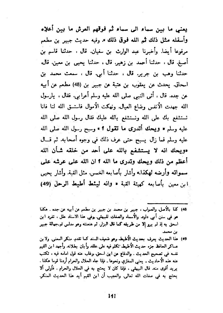 يَعْنِي مَا بَيْنَ سَمَاءٍ إِلَى سَمَاءٍ ثُمَّ فَوْقَهُمُ الْعَرْشُ مَا بَيْنَ أَعْلَاهُ وَأَسْفَلِهِ مِثْلُ ذَلِكَ ثُمَّ اللَّهُ فَوْقَ ذَلِكَ وَفِيهِ حَدِيثُ جُبَيْرِ بْنِ مُطْعِمٍ مَرْفُوعًا أَيْضًا وَأَخْبَرَنَا عَبْدُ الْوَارِثِ بْنُ سُفْيَانَ قَالَ حَدَّثَنَا قَاسِمُ بْنُ أَصْبَغَ قَالَ حَدَّثَنَا أَحْمَدُ بْنُ زُهَيْرٍ قَالَ حَدَّثَنَا يَحْيَى بْنُ مَعِينٍ قَالَ حَدَّثَنَا وَهْبُ بْنُ جَرِيرٍ قَالَ حَدَّثَنَا أَبِي قَالَ سَمِعْتُ مُحَمَّدَ بْنَ إِسْحَاقَ يُحَدِّثُ عَنْ يَعْقُوبَ بْنِ عُتْبَةَ عَنْ جُبَيْرِ بْنِ مُطْعِمٍ عَنْ أَبِيهِ عَنْ جَدِّهِ قَالَ أَتَى النَّبِيَّ صَلَّى اللَّهُ عَلَيْهِ وَسَلَّمَ أَعْرَابِيٌّ فَقَالَ يَا رَسُولَ اللَّهِ جُهِدَتِ الْأَنْفُسُ وَضَاعَ الْعِيَالُ وَنُهِكَتِ الْأَمْوَالُ فَاسْتَسْقِ اللَّهَ لَنَا فَإِنَّا نَسْتَشْفِعُ بِكَ عَلَى اللَّهِ وَنَسْتَشْفِعُ بِاللَّهِ عَلَيْكَ فَقَالَ رَسُولُ اللَّهِ صَلَّى اللَّهُ عَلَيْهِ وَسَلَّمَ وَيْحَكَ أَتَدْرِي مَا تَقُولُ وَسَبَّحَ رَسُولُ اللَّهِ صَلَّى اللَّهُ عَلَيْهِ وَسَلَّمَ فَمَا زَالَ يُسَبِّحُ حَتَّى عُرِفَ ذَلِكَ فِي وُجُوهِ أَصْحَابِهِ ثُمَّ قَالَ وَيْحَكَ إِنَّهُ لَا يُسْتَشْفَعُ بِاللَّهِ عَلَى أَحَدٍ مِنْ خَلْقِهِ شَأْنُ اللَّهِ أَعْظَمُ مِنْ ذَلِكَ وَيْحَكَ وَتَدْرِي مَا الله إن الله على عرشه على سمواته وَأَرْضِهِ لَهَكَذَا وَأَشَارَ بِأَصَابِعِهِ الْخَمْسِ مِثْلِ الْقُبَّةِ وَأَشَارَ يَحْيَى بْنُ مَعِينٍ بِأَصَابِعِهِ كَهَيْئَةِ الْقُبَّةِ وَإِنَّهُ لَيَئِطُّ أَطِيطَ الرَّحْلِ