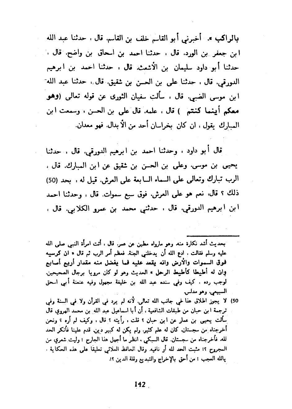 بِالرَّاكِبِ أَخْبَرَنِي أَبُو الْقَاسِمِ خَلَفُ بْنُ الْقَاسِمِ قَالَ حَدَّثَنَا عَبْدُ اللَّهِ بْنُ جَعْفَرِ بْنِ الْوَرْدِ قَالَ حَدَّثَنَا أَحْمَدُ بْنُ إِسْحَاقَ بْنِ وَاضِحٍ قَالَ حَدَّثَنَا أَبُو دَاوُدَ سُلَيْمَانُ بْنُ الْأَشْعَثِ قَالَ حَدَّثَنَا أَحْمَدُ بْنُ إِبْرَاهِيمَ الدَّوْرَقِيُّ قَالَ حَدَّثَنَا عَلِيُّ بْنُ الْحَسَنِ بْنِ شَقِيقٍ قَالَ حَدَّثَنَا عَبْدُ اللَّهِ بْنُ مُوسَى الضَّبِّيُّ قَالَ سَأَلْتُ سُفْيَانَ الثَّوْرِيَّ عَنْ قَوْلِهِ تَعَالَى وهو معكم أينما كُنْتُمْ قَالَ عِلْمُهُ قَالَ عَلِيُّ بْنُ الْحَسَنِ وَسَمِعْتُ ابْنَ الْمُبَارَكِ يَقُولُ إِنْ كَانَ بِخُرَاسَانَ أَحَدٌ مِنَ الْأَبْدَالِ فَهُوَ مَعْدَانُ قَالَ أَبُو دَاوُدَ وَحَدَّثَنَا أَحْمَدُ بْنُ إِبْرَاهِيمَ الدَّوْرَقِيُّ قَالَ حَدَّثَنَا يَحْيَى بْنُ مُوسَى وَعَلِيُّ بْنُ الْحَسَنِ بْنِ شَقِيقٍ عَنِ ابْنِ الْمُبَارَكِ قَالَ الرَّبُّ تَبَارَكَ وَتَعَالَى عَلَى السَّمَاءِ السَّابِعَةِ عَلَى الْعَرْشِ قِيلَ لَهُ بِحَدِّ ذَلِكَ قَالَ نَعَمْ هُوَ على العرش فوق سبع سموات قَالَ وَحَدَّثَنَا أَحْمَدُ بْنُ إِبْرَاهِيمَ الدَّوْرَقِيُّ قَالَ حَدَّثَنِي مُحَمَّدُ بْنُ عَمْرٍو الْكِلَابِيُّ قَالَ