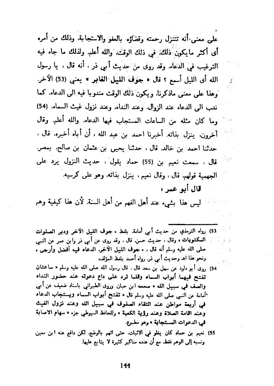 عَلَى مَعْنَى أَنَّهُ تَتَنَزَّلُ رَحْمَتُهُ وَقَضَاؤُهُ بِالْعَفْوِ وَالِاسْتِجَابَةِ وَذَلِكَ مِنْ أَمْرِهِ أَيْ أَكْثَرُ مَا يَكُونُ ذَلِكَ فِي ذَلِكَ الْوَقْتِ وَاللَّهُ أَعْلَمُ وَلِذَلِكَ مَا جَاءَ فِيهِ التَّرْغِيبُ فِي الدُّعَاءِ وَقَدْ رَوَى مِنْ حَدِيثِ أَبِي ذَرٍّ أَنَّهُ قَالَ يَا رَسُولَ اللَّهِ أَيُّ اللَّيْلِ أَسْمَعُ قَالَ جَوْفُ اللَّيْلِ الْغَابِرُ يَعْنِي الْآخِرَ وَهَذَا عَلَى مَعْنَى مَا ذَكَرْنَا وَيَكُونُ ذَلِكَ الْوَقْتُ مَنْدُوبًا فِيهِ إِلَى الدُّعَاءِ كَمَا نُدِبَ إِلَى الدُّعَاءِ عِنْدَ الزَّوَالِ وَعِنْدَ النِّدَاءِ وَعِنْدَ نُزُولِ غَيْثِ السَّمَاءِ وَمَا كَانَ مِثْلَهُ مِنَ السَّاعَاتِ الْمُسْتَجَابِ فِيهَا الدُّعَاءُ وَاللَّهُ أَعْلَمُ وَقَالَ آخَرُونَ يَنْزِلُ بِذَاتِهِ أَخْبَرَنَا أَحْمَدُ بْنُ عَبْدِ اللَّهِ أَنَّ أَبَاهُ أَخْبَرَهُ قَالَ حَدَّثَنَا أَحْمَدُ بْنُ خَالِدٍ قَالَ حَدَّثَنَا يَحْيَى بْنُ عُثْمَانَ بْنِ صَالِحٍ بِمِصْرَ قَالَ سَمِعْتُ نُعَيْمَ بْنَ حَمَّادٍ يَقُولُ حَدِيثُ النُّزُولِ يَرُدُّ عَلَى الْجَهْمِيَّةِ قَوْلَهُمْ قَالَ وَقَالَ نُعَيْمٌ يَنْزِلُ بِذَاتِهِ وَهُوَ عَلَى كُرْسِيِّهِ - قَالَ أَبُو عُمَرَ لَيْسَ هَذَا بِشَيْءٍ عِنْدَ أَهْلِ الْفَهْمِ مِنْ أَهْلِ السُّنَّةِ لِأَنَّ هَذَا كَيْفِيَّةٌ وَهُمْ