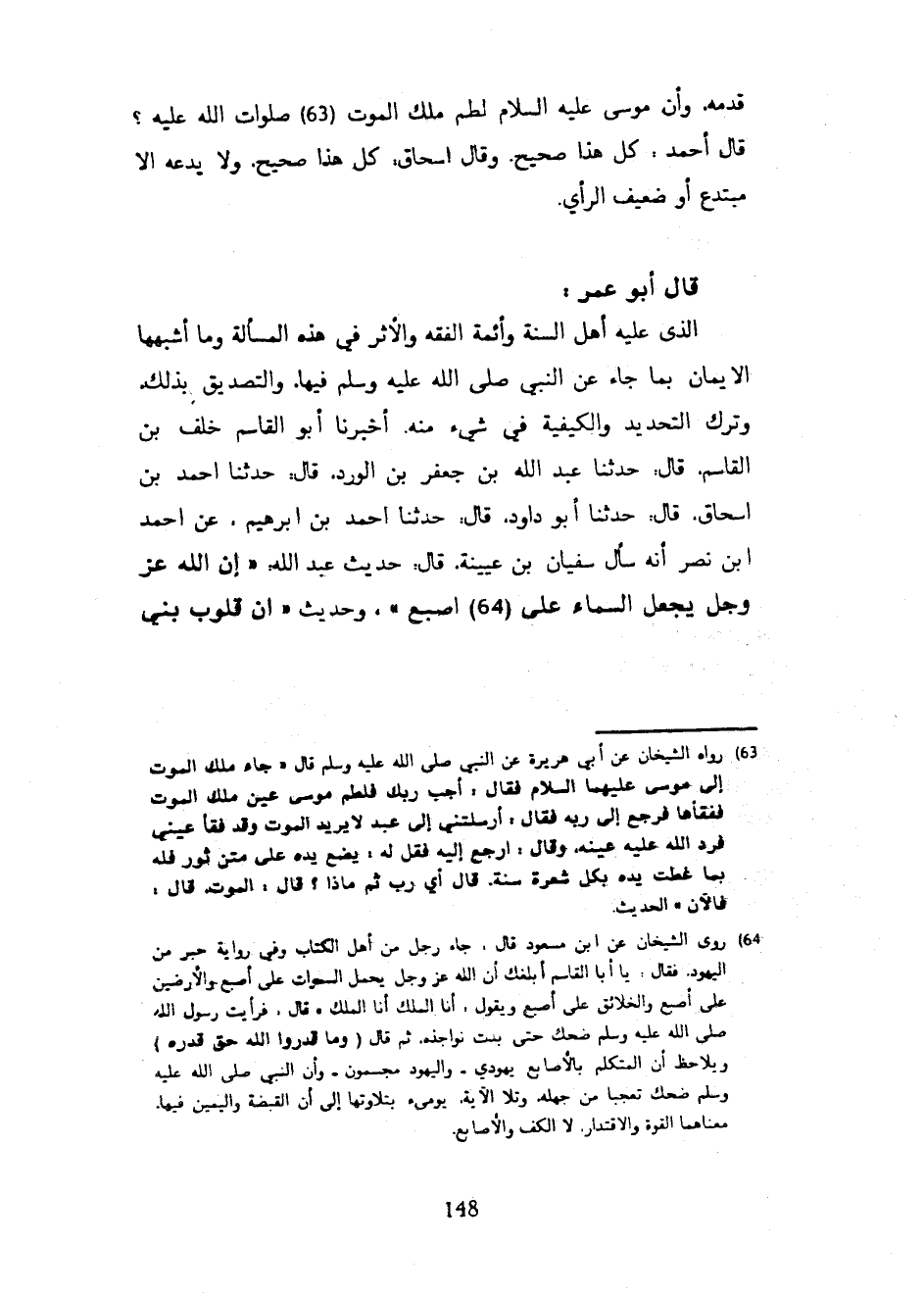 قَدَمَهُ وَأَنَّ مُوسَى عَلَيْهِ السَّلَامُ لَطَمَ مَلَكَ الْمَوْتِ صَلَوَاتُ اللَّهِ عَلَيْهِ قَالَ أَحْمَدُ كُلُّ هَذَا صَحِيحٌ وَقَالَ إِسْحَاقُ كُلُّ هَذَا صَحِيحٌ وَلَا يَدَعُهُ إِلَّا مُبْتَدِعٌ أَوْ ضَعِيفُ الرَّأْيِ - قَالَ أَبُو عُمَرَ الَّذِي عَلَيْهِ أَهْلُ السُّنَّةِ وَأَئِمَّةُ الْفِقْهِ وَالْأَثَرِ فِي هَذِهِ الْمَسْأَلَةِ وَمَا أَشْبَهَهَا الْإِيمَانُ بِمَا جَاءَ عَنِ النَّبِيِّ صَلَّى اللَّهُ عَلَيْهِ وَسَلَّمَ فِيهَا وَالتَّصْدِيقُ بِذَلِكَ وَتَرْكُ التَّحْدِيدِ وَالْكَيْفِيَّةِ فِي شَيْءٍ مِنْهُ أَخْبَرَنَا أَبُو الْقَاسِمِ خَلَفُ بْنُ الْقَاسِمِ قَالَ حَدَّثَنَا عَبْدُ اللَّهِ بْنُ جَعْفَرِ بْنِ الْوَرْدِ قَالَ حَدَّثَنَا أَحْمَدُ بْنُ إِسْحَاقَ قَالَ حَدَّثَنَا أَبُو دَاوُدَ قَالَ حَدَّثَنَا أَحْمَدُ بْنُ إِبْرَاهِيمَ عَنْ أَحْمَدَ بْنِ نَصْرٍ أَنَّهُ سَأَلَ سُفْيَانَ بْنَ عُيَيْنَةَ قَالَ حَدِيثُ عَبْدِ اللَّهِ إِنَّ اللَّهَ عَزَّ وَجَلَّ يَجْعَلُ السَّمَاءَ عَلَى أُصْبُعٍ وَحَدِيثُ إِنَّ قلوب بني