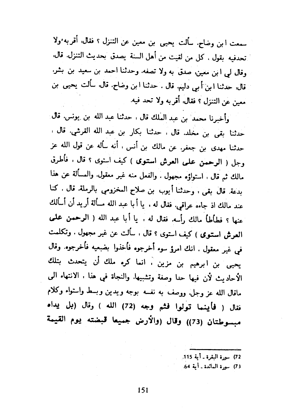 سَمِعْتُ ابْنَ وَضَّاحٍ سَأَلْتُ يَحْيَى بْنَ مَعِينٍ عَنِ التَّنَزُّلِ فَقَالَ أَقِرَّ بِهِ وَلَا تُحِدَّ فِيهِ بِقَوْلٍ كُلُّ مَنْ لَقِيتُ مِنْ أَهْلِ السُّنَّةِ يُصَدِّقُ بِحَدِيثِ التَّنَزُّلِ قَالَ وَقَالَ لِيَ ابْنُ مَعِينٍ صَدِّقْ بِهِ وَلَا تَصِفْهُ وَحَدَّثَنَا أَحْمَدُ بْنُ سَعِيدِ بْنِ بِشْرٍ قَالَ حَدَّثَنَا ابْنُ أَبِي دُلَيْمٍ قَالَ حَدَّثَنَا ابْنُ وَضَّاحٍ قَالَ سَأَلْتُ يَحْيَى بْنَ مَعِينٍ عَنِ التَّنَزُّلِ فَقَالَ أَقِرَّ بِهِ وَلَا تُحِدَّ فِيهِ وَأَخْبَرَنَا مُحَمَّدُ بْنُ عَبْدِ الْمَلِكِ قَالَ حَدَّثَنَا عَبْدُ اللَّهِ بْنُ يُونُسَ قَالَ حَدَّثَنَا بَقِيُّ بْنُ مَخْلَدٍ قَالَ حَدَّثَنَا بَكَّارُ بْنُ عَبْدِ اللَّهِ القرشي قَالَ حَدَّثَنَا مَهْدِيُّ بْنُ جَعْفَرٍ عَنْ مَالِكِ بْنِ أَنَسٍ أَنَّهُ سَأَلَهُ عَنْ قَوْلِ اللَّهِ عَزَّ وَجَلَّ الرَّحْمَنُ عَلَى الْعَرْشِ اسْتَوَى كَيْفَ اسْتَوَى قَالَ فَأَطْرَقَ مَالِكٌ ثُمَّ قَالَ اسْتِوَاؤُهُ مَجْهُولٌ وَالْفِعْلُ مِنْهُ غَيْرُ مَعْقُولٍ وَالْمَسْأَلَةُ عَنْ هَذَا بِدَعَةٌ قَالَ بَقِيٌّ وَحَدَّثَنَا أَيُّوبُ بْنُ صَلَاحٍ الْمَخْزُومِيُّ بِالرَّمْلَةِ قَالَ كُنَّا عِنْدَ مَالِكٍ إِذْ جَاءَهُ عِرَاقِيٌّ فَقَالَ لَهُ يَا أَبَا عَبْدِ اللَّهِ مَسْأَلَةٌ أُرِيدُ أَنْ أَسْأَلَكَ عَنْهَا فَطَأْطَأَ مَالِكٌ رَأْسَهُ فَقَالَ لَهُ يَا أَبَا عَبْدِ اللَّهِ الرَّحْمَنُ عَلَى الْعَرْشِ اسْتَوَى كَيْفَ استوى قال سألت عن غير مجهول وتكلمت في غير مَعْقُولٌ إِنَّكَ امْرُؤُ سَوْءٍ أَخْرِجُوهُ فَأَخَذُوا بِضَبْعَيْهِ فأخرجوه وقال يحيى بن إبرهيم بن مزين إنما كره ملك أَنْ يَتَحَدَّثَ بِتِلْكَ الْأَحَادِيثِ لِأَنَّ فِيهَا حَدًّا وَصِفَةً وَتَشْبِيهًا وَالنَّجَاةُ فِي هَذَا الِانْتِهَاءُ إِلَى مَا قَالَ اللَّهُ عَزَّ وَجَلَّ وَوَصَفَ بِهِ نَفْسَهُ بِوَجْهٍ وَيَدَيْنِ وَبَسْطٍ وَاسْتِوَاءٍ وَكَلَامٍ فَقَالَ فَأَيْنَمَا تُوَلُّوا فَثَمَّ وَجْهُ اللَّهِ وَقَالَ بَلْ يَدَاهُ مَبْسُوطَتَانِ وَقَالَ وَالْأَرْضُ جَمِيعًا قَبْضَتُهُ يَوْمَ القيامة