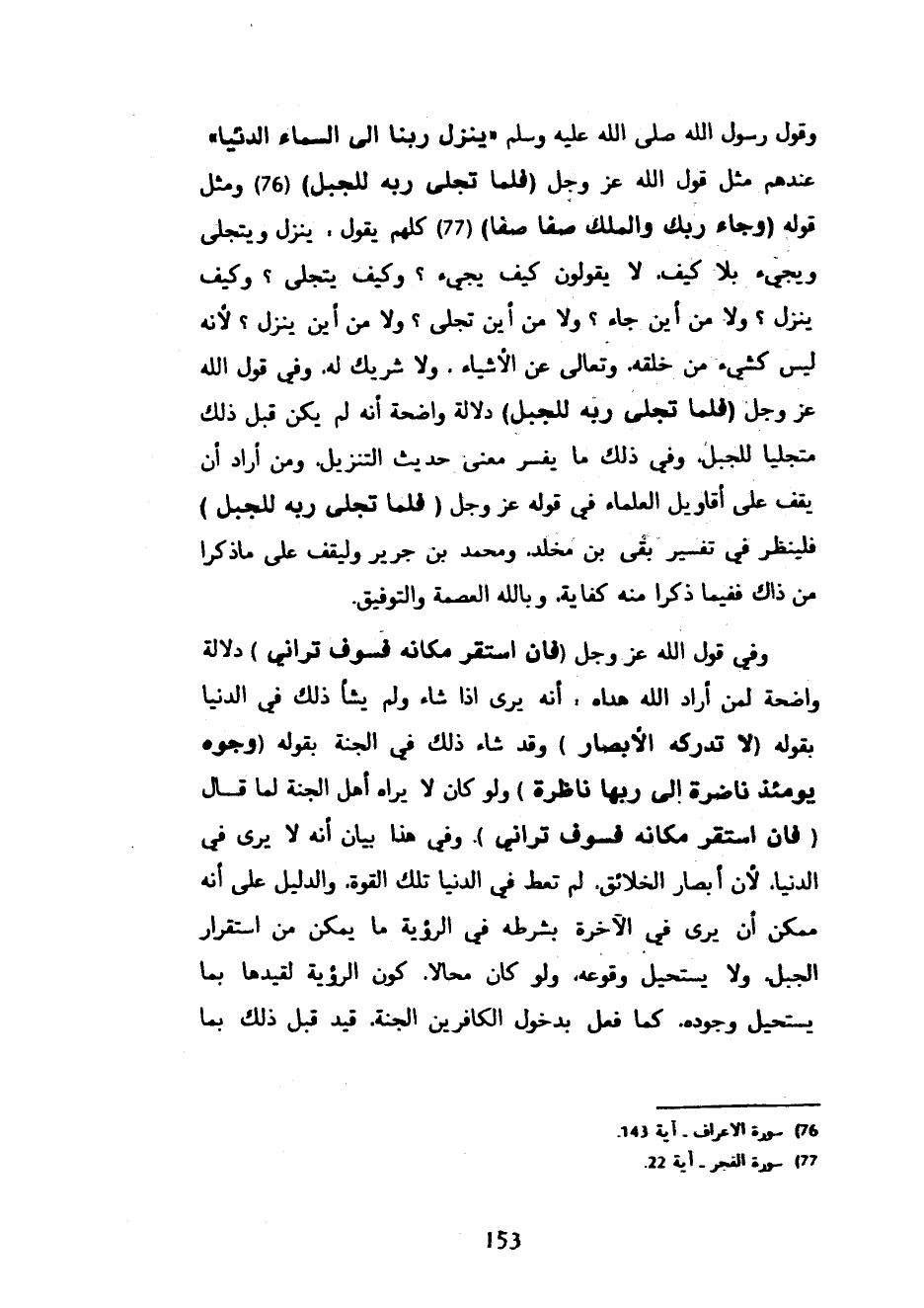 وَقَوْلُ رَسُولِ اللَّهِ صَلَّى اللَّهُ عَلَيْهِ وَسَلَّمَ يَنْزِلُ رَبُّنَا إِلَى السَّمَاءِ الدُّنْيَا عِنْدَهُمْ مِثْلُ قَوْلِ اللَّهِ عَزَّ وَجَلَّ فَلَمَّا تَجَلَّى رَبُّهُ لِلْجَبَلِ وَمِثْلُ قَوْلِهِ وَجَاءَ رَبُّكَ وَالْمَلَكُ صَفًّا صَفًّا كُلُّهُمْ يَقُولُ يَنْزِلُ وَيَتَجَلَّى وَيَجِيءُ بِلَا كَيْفٍ لَا يَقُولُونَ كَيْفَ يَجِيءُ وَكَيْفَ يَتَجَلَّى وَكَيْفَ يَنْزِلُ وَلَا مِنْ أَيْنَ جَاءَ وَلَا مِنْ أَيْنَ تَجَلَّى وَلَا مِنْ أَيْنَ يَنْزِلُ لِأَنَّهُ لَيْسَ كَشَيْءٍ مِنْ خَلْقِهِ وَتَعَالَى عَنِ الْأَشْيَاءِ وَلَا شَرِيكَ لَهُ وَفِي قَوْلِ اللَّهِ عَزَّ وَجَلَّ فَلَمَّا تَجَلَّى رَبُّهُ لِلْجَبَلِ دَلَالَةٌ وَاضِحَةٌ أَنَّهُ لَمْ يَكُنْ قَبْلَ ذَلِكَ مُتَجَلِّيًا لِلْجَبَلِ وَفِي ذَلِكَ مَا يُفَسِّرُ مَعْنَى حَدِيثِ التَّنْزِيلِ وَمَنْ أَرَادَ أَنْ يَقِفَ عَلَى أَقَاوِيلِ الْعُلَمَاءِ فِي قَوْلِهِ عَزَّ وَجَلَّ فَلَمَّا تَجَلَّى رَبُّهُ لِلْجَبَلِ فَلْيَنْظُرْ فِي تَفْسِيرِ بَقِيِّ بْنِ مَخْلَدٍ وَمُحَمَّدِ بْنِ جَرِيرٍ وَلِيَقِفْ عَلَى مَا ذَكَرَا مِنْ ذَاكَ فَفِيمَا ذَكَرَا مِنْهُ كِفَايَةٌ وَبِاللَّهِ الْعِصْمَةُ وَالتَّوْفِيقُ وَفِي قَوْلِ اللَّهِ عَزَّ وَجَلَّ فَإِنِ اسْتَقَرَّ مَكَانَهُ فَسَوْفَ تَرَانِي دَلَالَةٌ وَاضِحَةٌ لِمَنْ أَرَادَ اللَّهُ هُدَاهُ أَنَّهُ يَرَى إِذَا شَاءَ وَلَمْ يَشَأْ ذَلِكَ فِي الدُّنْيَا بِقَوْلِهِ لَا تُدْرِكُهُ الْأَبْصَارُ وَقَدْ شَاءَ ذَلِكَ فِي الْجَنَّةِ بِقَوْلِهِ وُجُوهٌ يَوْمَئِذٍ نَاضِرَةٌ إِلَى رَبِّهَا نَاظِرَةٌ وَلَوْ كَانَ لَا يَرَاهُ أَهْلُ الْجَنَّةِ لَمَا قَالَ فَإِنِ اسْتَقَرَّ مَكَانَهُ فَسَوْفَ تَرَانِي وَفِي هَذَا بَيَانُ أَنَّهُ لَا يُرَى فِي الدُّنْيَا لِأَنَّ أَبْصَارَ الْخَلَائِقِ لَمْ تُعْطَ فِي الدُّنْيَا تِلْكَ الْقُوَّةَ وَالدَّلِيلُ عَلَى أَنَّهُ مُمْكِنٌ أَنْ يُرَى فِي الْآخِرَةِ بِشَرْطِهِ فِي الرُّؤْيَةِ مَا يُمَكِنُ مِنِ اسْتِقْرَارِ الْجَبَلِ وَلَا يَسْتَحِيلُ وُقُوعُهُ وَلَوْ كَانَ مُحَالًا كَوْنُ الرُّؤْيَةِ لَقَيَّدَهَا بِمَا يَسْتَحِيلُ وُجُودُهُ كَمَا فَعَلَ بِدُخُولِ الْكَافِرِينَ الْجَنَّةَ قَيَّدَ قَبْلَ ذَلِكَ بِمَا