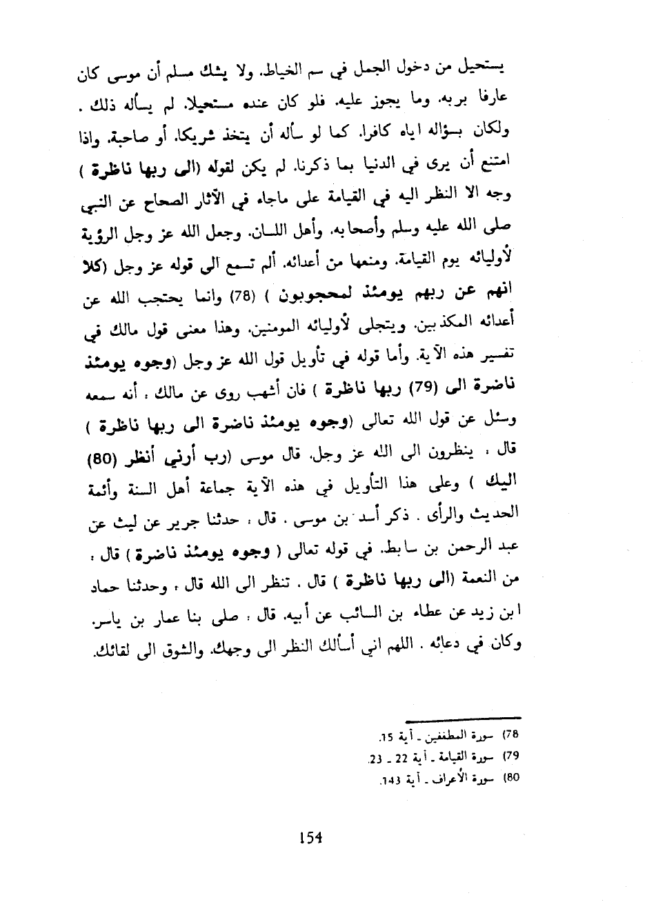 يَسْتَحِيلُ مِنْ دُخُولِ الْجَمَلِ سَمَّ الْخِيَاطِ وَلَا يَشُكُّ مُسْلِمٌ أَنَّ مُوسَى كَانَ عَارِفًا بِرَبِّهِ وَمَا يَجُوزُ عَلَيْهِ فَلَوْ كَانَ عِنْدَهُ مُسْتَحِيلًا لم يسأله ذَلِكَ وَلَكَانَ بِسُؤَالِهِ إِيَّاهُ كَافِرًا كَمَا لَوْ سَأَلَهُ أَنْ يَتَّخِذَ شَرِيكًا أَوْ صَاحِبَةً وَإِذَا امْتَنَعَ أَنْ يُرَى فِي الدُّنْيَا بِمَا ذَكَرْنَا لَمْ يَكُنْ لِقَوْلِهِ إِلَى رَبِّهَا نَاظِرَةٌ وَجْهٌ إِلَّا النَّظَرُ إِلَيْهِ فِي الْقِيَامَةِ عَلَى مَا جَاءَ فِي الْآثَارِ الصِّحَاحِ عَنِ النَّبِيِّ صَلَّى اللَّهُ عَلَيْهِ وَسَلَّمَ وَأَصْحَابِهِ وَأَهْلِ اللِّسَانِ وَجَعَلَ اللَّهُ عَزَّ وَجَلَّ الرُّؤْيَةَ لِأَوْلِيَائِهِ يَوْمَ الْقِيَامَةِ وَمَنَعَهَا مِنْ أَعْدَائِهِ أَلَمْ تَسْمَعْ إِلَى قَوْلِهِ عَزَّ وَجَلَّ كَلَّا إِنَّهُمْ عَنْ رَبِّهِمْ يَوْمَئِذٍ لَمَحْجُوبُونَ وَإِنَّمَا يَحْتَجِبُ اللَّهُ عَنْ أَعْدَائِهِ الْمُكَذِّبِينَ وَيَتَجَلَّى لِأَوْلِيَائِهِ الْمُؤْمِنِينَ وَهَذَا مَعْنَى قَوْلِ مَالِكٍ فِي تَفْسِيرِ هَذِهِ الْآيَةِ وَأَمَّا قَوْلُهُ فِي تَأْوِيلِ قَوْلِ اللَّهِ عَزَّ وَجَلَّ وُجُوهٌ يَوْمَئِذٍ نَاضِرَةٌ إِلَى رَبِّهَا نَاظِرَةٌ فَإِنَّ أَشْهَبَ رَوَى عَنْ مَالِكٍ أَنَّهُ سَمِعَهُ وَسُئِلَ عَنْ قَوْلِ اللَّهِ تَعَالَى وُجُوهٌ يَوْمَئِذٍ نَاضِرَةٌ إِلَى رَبِّهَا نَاظِرَةٌ قَالَ يَنْظُرُونَ إِلَى اللَّهِ عَزَّ وَجَلَّ قَالَ مُوسَى رَبِّ أَرِنِي أَنْظُرْ إِلَيْكَ وَعَلَى هَذَا التَّأْوِيلِ فِي هَذِهِ الْآيَةِ جَمَاعَةُ أَهْلِ السُّنَّةِ وَأَئِمَّةِ الْحَدِيثِ وَالرَّأْيِ ذَكَرَ أَسَدُ بْنُ مُوسَى قَالَ حَدَّثَنَا جَرِيرٌ عَنْ لَيْثٍ عَنْ عَبْدِ الرَّحْمَنِ بْنِ سَابِطٍ فِي قَوْلِهِ تَعَالَى وُجُوهٌ يَوْمَئِذٍ نَاضِرَةٌ قَالَ مِنَ النِّعْمَةِ إِلَى رَبِّهَا نَاظِرَةٌ قَالَ تَنْظُرُ إِلَى اللَّهِ قَالَ وَحَدَّثَنَا حَمَّادُ بْنُ زَيْدٍ عَنْ عَطَاءِ بْنِ السَّائِبِ عَنْ أَبِيهِ قَالَ صَلَّى بِنَا عَمَّارُ بْنُ يَاسِرٍ وَكَانَ فِي دُعَائِهِ اللَّهُمَّ إِنِّي أَسْأَلُكَ النَّظَرَ إِلَى وَجْهِكَ وَالشَّوْقَ إِلَى لِقَائِكَ