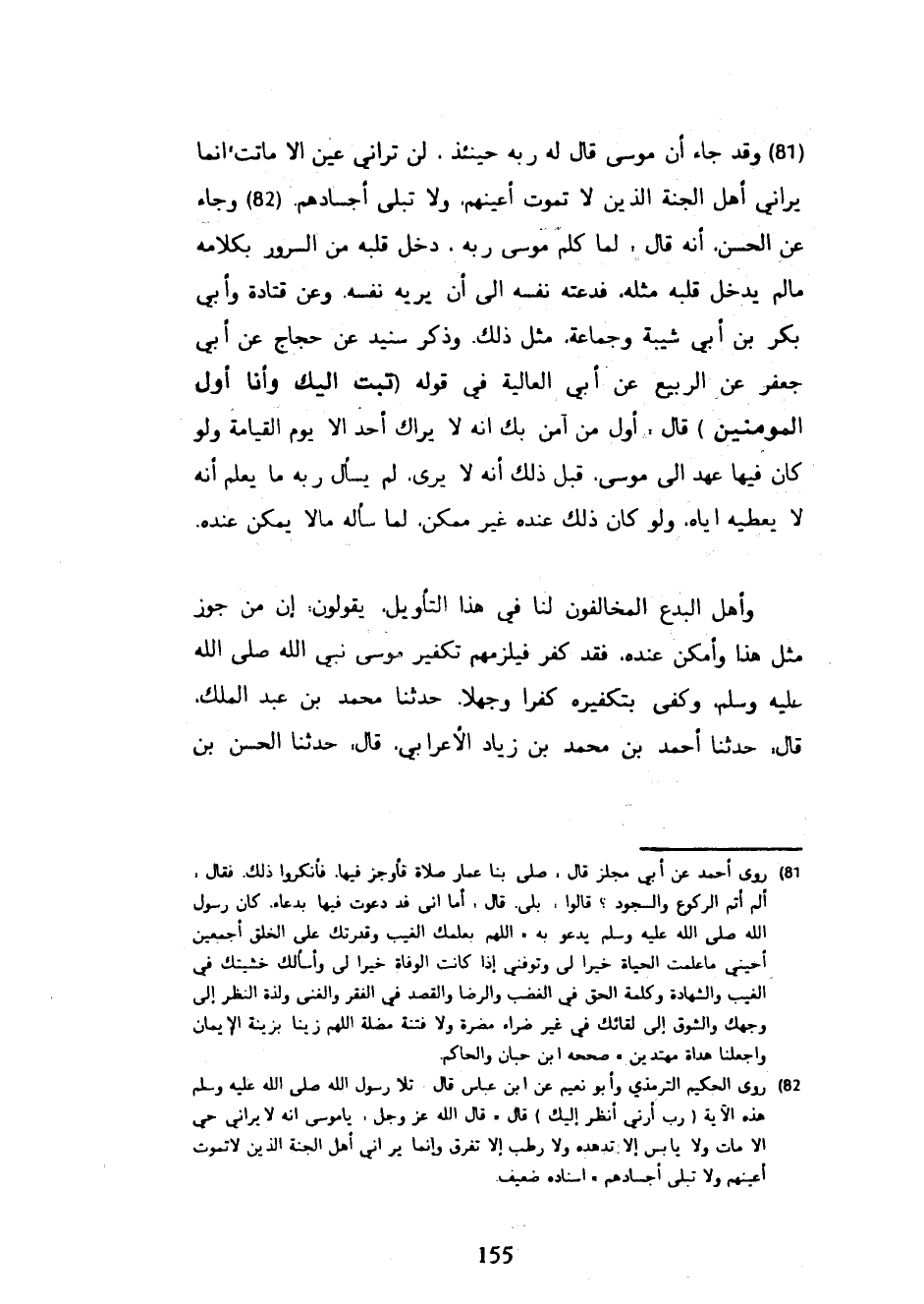 وَقَدْ جَاءَ أَنَّ مُوسَى قَالَ لَهُ رَبُّهُ حِينَئِذٍ لَنْ تَرَانِي عَيْنٌ إِلَّا مَاتَتْ إِنَّمَا يَرَانِي أَهْلُ الْجَنَّةِ الَّذِينَ لَا تَمُوتُ أَعْيُنُهُمْ وَلَا تَبْلَى أَجْسَادُهُمْ وَجَاءَ عَنِ الْحَسَنِ أَنَّهُ قَالَ لَمَّا كَلَّمَ مُوسَى رَبَّهُ دَخَلَ قَلْبَهُ مِنَ السُّرُورِ بِكَلَامِهِ مَا لَمْ يَدْخُلْ قَلْبَهُ مِثْلُهُ فَدَعَتْهُ نَفْسُهُ إِلَى أَنْ يُرِيَهُ نَفْسَهُ وَعَنْ قَتَادَةَ وَأَبِي بَكْرِ بْنِ أَبِي شَيْبَةَ وَجَمَاعَةٍ مِثْلِ ذَلِكَ وَذَكَرَ سَنِيدٌ عَنْ حَجَّاجٍ عَنْ أَبِي جَعْفَرٍ عَنِ الرَّبِيعِ عَنْ أَبِي الْعَالِيَةِ فِي قَوْلِهِ تُبْتُ إِلَيْكَ وَأَنَا أَوَّلُ الْمُؤْمِنِينَ قَالَ أَوَّلُ مَنْ آمَنَ بِكَ أَنَّهُ لَا يَرَاكَ أَحَدٌ إِلَّا يَوْمَ الْقِيَامَةِ وَلَوْ كَانَ فِيهَا عَهْدٌ إِلَى مُوسَى قَبْلَ ذَلِكَ أَنَّهُ لَا يَرَى لَمْ يَسْأَلْ رَبَّهُ مَا يَعْلَمُ أَنَّهُ لَا يُعْطِيهِ إِيَّاهُ وَلَوْ كَانَ ذلك عنده غير مُمْكِنٌ لَمَا سَأَلَهُ مَا لَا يُمْكِنُ عِنْدَهُ وَأَهْلُ الْبِدَعِ الْمُخَالِفُونَ لَنَا فِي هَذَا التَّأْوِيلِ يَقُولُونَ إِنَّ مَنْ جَوَّزَ مِثْلَ هَذَا وَأَمْكَنَ عِنْدَهُ فَقَدْ كَفَرَ فَيَلْزَمُهُمْ تَكْفِيرُ مُوسَى نَبِيِّ اللَّهِ صَلَّى اللَّهُ عَلَيْهِ وَسَلَّمَ وَكَفَى بِتَكْفِيرِهِ كُفْرًا وَجَهْلًا حَدَّثَنَا مُحَمَّدُ بْنُ عَبْدِ الْمَلِكِ قَالَ حَدَّثَنَا أَحْمَدُ بْنُ مُحَمَّدِ بْنِ زِيَادٍ الْأَعْرَابِيُّ قَالَ حَدَّثَنَا الْحَسَنُ بْنُ