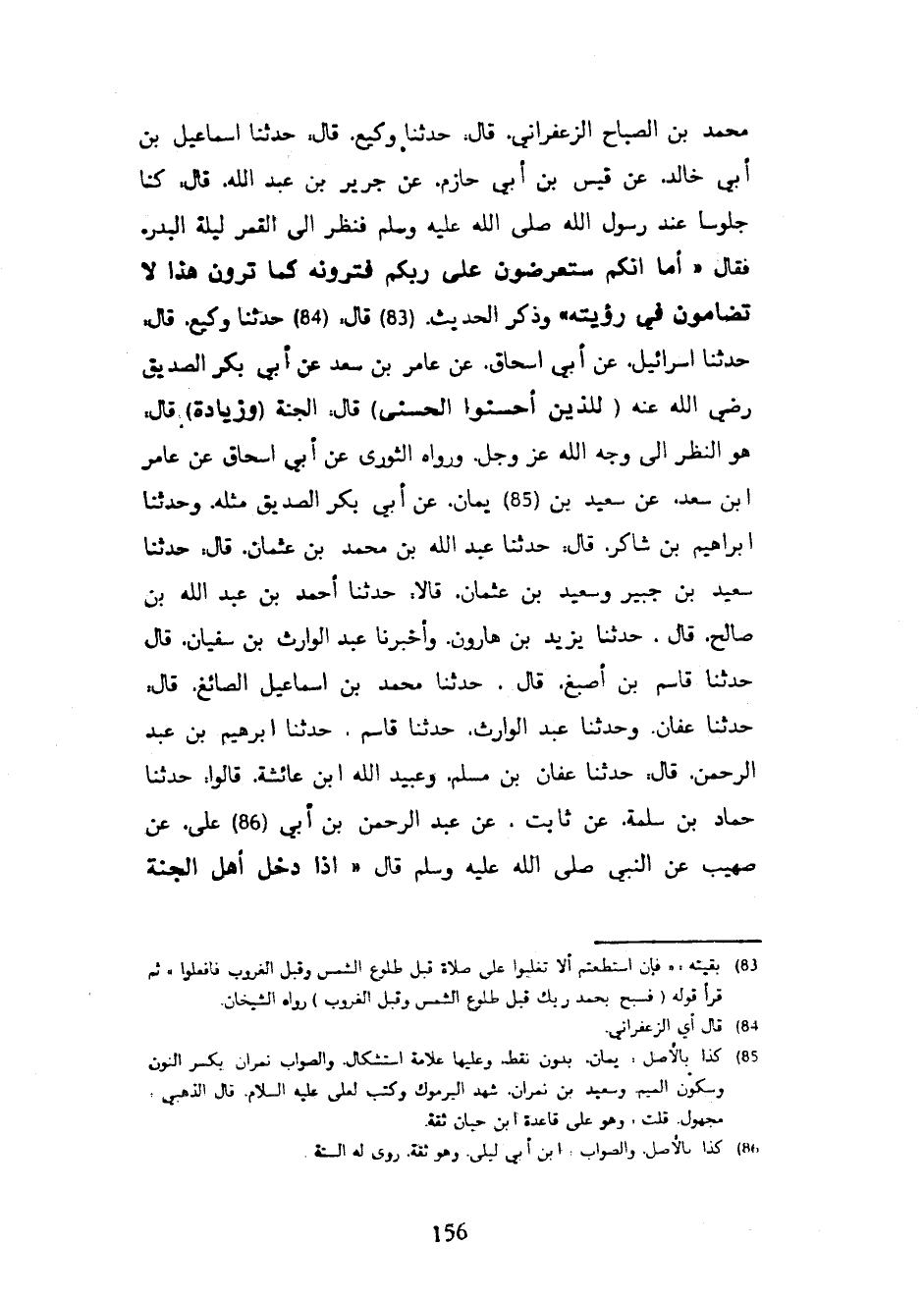 مُحَمَّدِ بْنِ الصَّبَاحِ الزَّعْفَرَانِيُّ قَالَ حَدَّثَنَا وَكِيعٌ قَالَ حَدَّثَنَا إِسْمَاعِيلُ بْنُ أَبِي خَالِدٍ عَنْ قَيْسِ بْنِ أَبِي حَازِمٍ عَنْ جَرِيرِ بْنِ عَبْدِ اللَّهِ قَالَ كُنَّا جُلُوسًا عِنْدَ رَسُولِ اللَّهِ صَلَّى اللَّهُ عَلَيْهِ وَسَلَّمَ فَنَظَرَ إِلَى الْقَمَرِ لَيْلَةَ الْبَدْرِ فَقَالَ أَمَا إِنَّكُمْ سَتُعْرَضُونَ عَلَى رَبِّكُمْ فَتَرَوْنَهُ كَمَا تَرَوْنَ هَذَا لَا تُضَامُونَ فِي رُؤْيَتِهِ وَذَكَرَ الْحَدِيثَ قَالَ حَدَّثَنَا وَكِيعٌ قَالَ حَدَّثَنَا إِسْرَائِيلُ عَنْ أَبِي إِسْحَاقَ عَنْ عَامِرِ بْنِ سَعْدٍ عَنْ أَبِي بَكْرٍ الصَّدِيقِ رَضِيَ اللَّهُ عَنْهُ لِلَّذِينَ أَحْسَنُوا الْحُسْنَى قَالَ الْجَنَّةُ (وَزِيَادَةٌ) قَالَ هُوَ النَّظَرُ إِلَى وَجْهِ اللَّهِ عَزَّ وَجَلَّ وَرَوَاهُ الثَّوْرِيُّ عَنْ أَبِي إِسْحَاقَ عَنْ عَامِرِ بْنِ سَعْدٍ عَنْ سَعِيدِ بْنِ يَمَانٍ عَنْ أَبِي بَكْرٍ الصَّدِيقِ مِثْلَهُ وَحَدَّثَنَا إِبْرَاهِيمُ بْنُ شَاكِرٍ قَالَ حَدَّثَنَا عَبْدُ اللَّهِ بْنُ مُحَمَّدِ بْنِ عُثْمَانَ قَالَ حَدَّثَنَا سَعِيدُ بْنُ جُبَيْرٍ وَسَعِيدُ بْنُ عُثْمَانَ قَالَا حَدَّثَنَا أَحْمَدُ بْنُ عَبْدِ اللَّهِ بْنِ صَالِحٍ قَالَ حَدَّثَنَا يَزِيدُ بْنُ هَارُونَ وَأَخْبَرَنَا عَبْدُ الْوَارِثِ بْنُ سُفْيَانَ قَالَ حَدَّثَنَا قَاسِمُ بْنُ أَصْبَغَ قَالَ حَدَّثَنَا مُحَمَّدُ بْنُ إِسْمَاعِيلَ الصَّائِغُ قَالَ حَدَّثَنَا عَفَّانُ وَحَدَّثَنَا عَبْدُ الْوَارِثِ حدثنا قاسم حدثنا إبرهيم بْنُ عَبْدِ الرَّحْمَنِ قَالَ حَدَّثَنَا عَفَّانُ بْنُ مُسْلِمٍ وَعُبَيْدُ اللَّهِ بْنُ عَائِشَةَ قَالُوا حَدَّثَنَا حَمَّادُ بْنُ سَلَمَةَ عَنْ ثَابِتٍ عَنْ عَبْدِ الرَّحْمَنِ بْنِ أَبِي عَلِيٍّ عَنْ صُهَيْبٍ عَنِ النَّبِيِّ صَلَّى اللَّهُ عَلَيْهِ وَسَلَّمَ قَالَ إذا دَخَلَ أَهْلُ الْجَنَّةِ