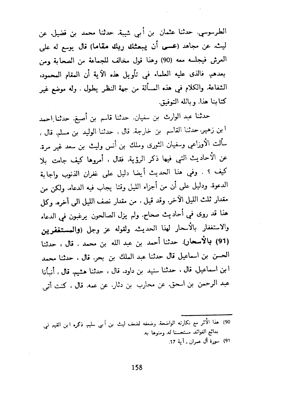 الطَّرَسُوسِيُّ حَدَّثَنَا عُثْمَانُ بْنُ أَبِي شَيْبَةَ حَدَّثَنَا مُحَمَّدُ بْنُ فُضَيْلٍ عَنْ لَيْثٍ عَنْ مُجَاهِدٍ عَسَى أَنْ يَبْعَثَكَ رَبُّكَ مَقَامًا قَالَ يُوسِعَ لَهُ عَلَى الْعَرْشِ فَيُجْلِسَهُ مَعَهُ وَهَذَا قَوْلٌ مُخَالِفٌ لِلْجَمَاعَةِ مِنَ الصَّحَابَةِ وَمَنْ بَعْدَهُمْ فَالَّذِي عَلَيْهِ الْعُلَمَاءُ فِي تَأْوِيلِ هَذِهِ الْآيَةِ أَنَّ المقام المحمود الشفاعة والكلام في هذه المسألة من جهة النظر يطول وله موضع غير كِتَابُنَا هَذَا وَبِاللَّهِ التَّوْفِيقُ حَدَّثَنَا عَبْدُ الْوَارِثِ بْنُ سُفْيَانَ حَدَّثَنَا قَاسِمُ بْنُ أَصْبَغَ حَدَّثَنَا أَحْمَدُ بْنُ زُهَيْرٍ حَدَّثَنَا الْقَاسِمُ بْنُ خَارِجَةَ قَالَ حَدَّثَنَا الْوَلِيدُ بْنُ مُسْلِمٍ قَالَ سَأَلْتُ الأوزاعي وسفيان الثوري وملك بن أنس وليث بن سعد غير مُرَّةَ عَنِ الْأَحَادِيثِ الَّتِي فِيهَا ذِكْرُ الرُّؤْيَةِ فَقَالَ أَمِرُّوهَا كَيْفَ جَاءَتْ بِلَا كَيْفٍ وَفِي هَذَا الْحَدِيثِ أَيْضًا دَلِيلٌ عَلَى غُفْرَانِ الذُّنُوبِ وَإِجَابَةِ الدَّعْوَةِ وَدَلِيلٌ عَلَى أَنَّ مِنْ أَجْزَاءِ اللَّيْلِ وَقْتًا يُجَابُ فِيهِ الدُّعَاءُ وَلَكِنْ مِنْ مِقْدَارِ ثُلُثِ اللَّيْلِ الْآخِرِ وَقَدْ قِيلَ مِنْ مِقْدَارِ نِصْفِ اللَّيْلِ إِلَى آخِرِهِ وَكُلُّ هَذَا قَدْ رُوِيَ فِي أَحَادِيثَ صِحَاحٍ وَلَمْ يَزَلِ الصَّالِحُونَ يَرْغَبُونَ فِي الدُّعَاءِ وَالِاسْتِغْفَارِ بِالْأَسْحَارِ لِهَذَا الحديث ولقوله عز وجل والمستغفرون بِالْأَسْحَارِ حَدَّثَنَا أَحْمَدُ بْنُ عَبْدِ اللَّهِ بْنِ مُحَمَّدٍ قَالَ حَدَّثَنَا الْحَسَنُ بْنُ إِسْمَاعِيلَ قَالَ حَدَّثَنَا عَبْدُ الْمَلِكِ بْنُ بَحْرٍ قَالَ حَدَّثَنَا مُحَمَّدُ بْنُ إِسْمَاعِيلَ قَالَ حَدَّثَنَا سُنَيْدُ بْنُ دَاوُدَ قَالَ حَدَّثَنَا هُشَيْمٌ قَالَ أَنْبَأَنَا عَبْدُ الرحمن بن إسحق عَنْ مُحَارِبِ بْنِ دِثَارٍ عَنْ عَمِّهِ قَالَ كنت آتي