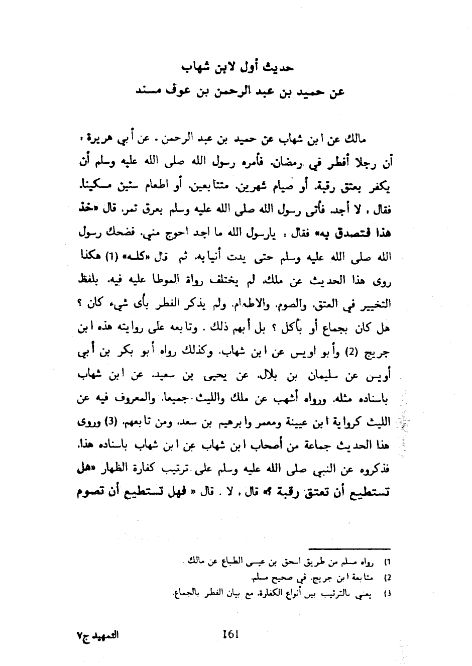 حَدِيثٌ أَوَّلٌ لِابْنِ شِهَابٍ عَنْ حُمَيْدِ بْنِ عَبْدِ الرَّحْمَنِ بْنِ عَوْفٍ مُسْنَدٌ مَالِكٌ عَنِ ابْنِ شِهَابٍ عَنْ حُمَيْدِ بْنِ عَبْدِ الرَّحْمَنِ عَنْ أَبِي هُرَيْرَةَ أَنَّ رَجُلًا أَفْطَرَ فِي رَمَضَانَ فَأَمَرَهُ رَسُولُ اللَّهِ صَلَّى اللَّهُ عَلَيْهِ وَسَلَّمَ أَنْ يُكَفِّرَ بِعِتْقِ رَقَبَةٍ أَوْ صِيَامِ شَهْرَيْنِ مُتَتَابِعَيْنِ أَوْ إِطْعَامِ سِتِّينَ مِسْكِينًا فَقَالَ لَا أَجِدُ فَأُتِيَ رَسُولُ اللَّهِ صَلَّى اللَّهُ عَلَيْهِ وَسَلَّمَ بِعَرَقِ تَمْرٍ قَالَ خُذْ هَذَا فَتَصَدَّقْ بِهِ فَقَالَ يَا رَسُولَ اللَّهِ مَا أَجِدُ أَحْوَجَ مِنِّي فَضَحِكَ رَسُولُ اللَّهِ صَلَّى اللَّهُ عَلَيْهِ وَسَلَّمَ حَتَّى بَدَتْ أَنْيَابُهُ ثُمَّ قَالَ كُلْهُ - هَكَذَا رُوِيَ هَذَا الْحَدِيثُ عَنْ ملك لَمْ يَخْتَلِفْ رُوَاةُ الْمُوَطَّأِ عَلَيْهِ فِيهِ بِلَفْظِ التَّخْيِيرِ فِي الْعِتْقِ وَالصَّوْمِ وَالْإِطْعَامِ وَلَمْ يَذْكُرِ الْفِطْرَ بِأَيِّ شَيْءٍ كَانَ هَلْ كَانَ بِجِمَاعٍ أَوْ بِأَكْلٍ بَلْ أَبْهَمَ ذَلِكَ وَتَابَعَهُ عَلَى رِوَايَتِهِ هَذِهِ ابْنُ جُرَيْجٍ وَأَبُو أُوَيْسٍ عَنِ ابْنِ شِهَابٍ وَكَذَلِكَ رَوَاهُ أَبُو بَكْرِ بْنُ أَبِي أُوَيْسٍ عَنْ سُلَيْمَانَ بْنِ بِلَالٍ عَنْ يَحْيَى بْنِ سَعِيدٍ عَنِ ابْنِ شِهَابٍ بِإِسْنَادِهِ مثله ورواه أشهب عن ملك والليث جَمِيعًا وَالْمَعْرُوفُ فِيهِ عَنِ اللَّيْثِ كَرِوَايَةِ ابْنِ عيينة ومعمر وإبرهيم بْنِ سَعْدٍ وَمَنْ تَابَعَهُمْ وَرَوَى هَذَا الْحَدِيثَ جَمَاعَةٌ مِنْ أَصْحَابِ ابْنِ شِهَابٍ عَنِ ابْنِ شِهَابٍ بِإِسْنَادِهِ هَذَا فَذَكَرُوهُ عَنِ النَّبِيِّ صَلَّى اللَّهُ عَلَيْهِ وَسَلَّمَ عَلَى تَرْتِيبِ كَفَّارَةِ الظِّهَارِ هَلْ تَسْتَطِيعُ أَنْ تَعْتِقَ رَقَبَةً قَالَ لَا قَالَ فَهَلْ تَسْتَطِيعُ أَنْ تَصُومَ