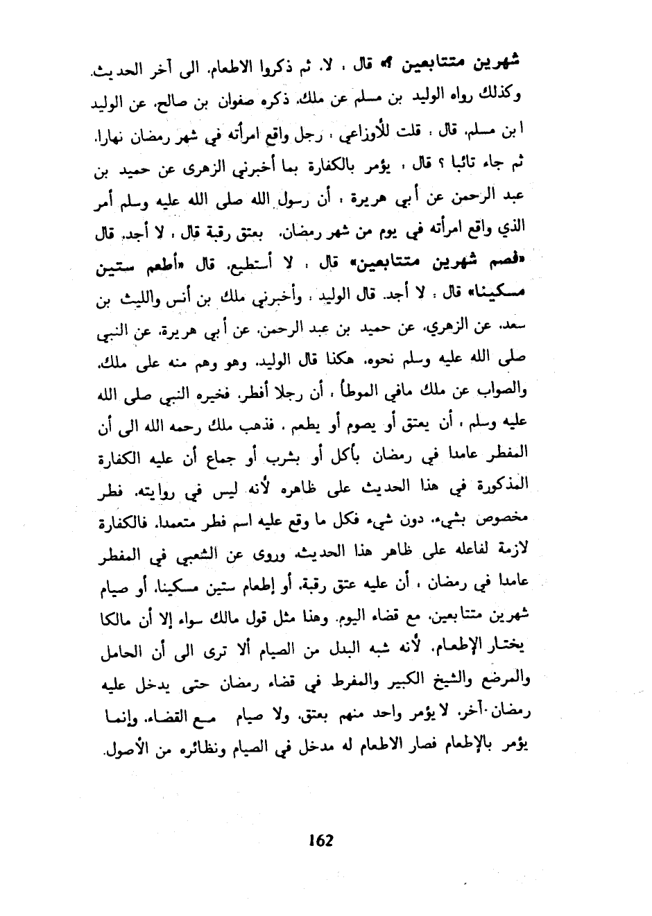 شَهْرَيْنِ مُتَتَابِعَيْنِ قَالَ لَا ثُمَّ ذَكَرُوا الْإِطْعَامَ إلى آخر الحديث وكذله رواه الوليد بن مسلم عن ملك ذَكَرَهُ صَفْوَانُ بْنُ صَالِحٍ عَنِ الْوَلِيدِ بْنِ مسلم قال قلت للأوزاعي رجل واقع امْرَأَتَهُ فِي شَهْرِ رَمَضَانَ نَهَارًا ثُمَّ جَاءَ تَائِبًا قَالَ يُؤْمَرُ بِالْكَفَّارَةِ بِمَا أَخْبَرَنِي الزُّهْرِيُّ عَنْ حُمَيْدِ بْنِ عَبْدِ الرَّحْمَنِ عَنْ أَبِي هُرَيْرَةَ أَنَّ رَسُولَ اللَّهِ صَلَّى اللَّهُ عَلَيْهِ وَسَلَّمَ أَمَرَ الَّذِي وَاقَعَ امْرَأَتَهُ فِي يَوْمٍ مِنْ شَهْرِ رَمَضَانَ بِعِتْقِ رَقَبَةٍ قَالَ لَا أَجِدُ قَالَ فَصُمْ شَهْرَيْنِ مُتَتَابِعَيْنِ قَالَ لَا أَسْتَطِيعُ قَالَ أَطْعِمْ سِتِّينَ مِسْكِينًا قَالَ لَا أجد قال الوليد وأخبرني ملك بْنُ أَنَسٍ وَاللَّيْثُ بْنُ سَعْدٍ عَنِ الزُّهْرِيُّ عَنْ حُمَيْدِ بْنِ عَبْدِ الرَّحْمَنِ عَنْ أَبِي هُرَيْرَةَ عَنِ النَّبِيِّ صَلَّى اللَّهُ عَلَيْهِ وَسَلَّمَ نَحْوَهُ هَكَذَا قَالَ الْوَلِيدُ وَهُوَ وَهْمٌ مِنْهُ على ملك والصواب عن ملك مَا فِي الْمُوَطَّأِ أَنَّ رَجُلًا أَفْطَرَ فَخَيَّرَهُ النَّبِيُّ صَلَّى اللَّهُ عَلَيْهِ وَسَلَّمَ أَنْ يُعْتِقَ أو يصوم أو يطعم فذهب ملك رَحِمَهُ اللَّهُ إِلَى أَنَّ الْمُفْطِرَ عَامِدًا فِي رَمَضَانَ بِأَكْلٍ أَوْ بِشُرْبٍ أَوْ جِمَاعٍ أَنَّ عَلَيْهِ الْكَفَّارَةَ الْمَذْكُورَةَ فِي هَذَا الْحَدِيثِ عَلَى ظَاهِرِهِ لِأَنَّهُ لَيْسَ فِي رِوَايَتِهِ فِطْرٌ مَخْصُوصٌ بِشَيْءٍ دُونَ شَيْءٍ فَكُلُّ مَا وَقَعَ عَلَيْهِ اسْمُ فَطَرَ مُتَعَمِّدًا فَالْكَفَّارَةُ لَازِمَةٌ لِفَاعِلِهِ عَلَى ظَاهِرِ هَذَا الْحَدِيثِ وَرُوِيَ عَنِ الشَّعْبِيِّ فِي الْمُفْطِرِ عَامِدًا فِي رَمَضَانَ أَنَّ عَلَيْهِ عِتْقَ رَقَبَةٍ أَوْ إِطْعَامَ سِتِّينَ مِسْكِينًا أَوْ صِيَامَ شَهْرَيْنِ مُتَتَابِعَيْنِ مَعَ قَضَاءِ الْيَوْمِ وَهَذَا مِثْلُ قَوْلِ مَالِكٍ سَوَاءٌ إِلَّا أَنَّ مَالِكًا يَخْتَارُ الْإِطْعَامَ لِأَنَّهُ شِبْهُ الْبَدَلِ مِنَ الصِّيَامِ أَلَا تَرَى إِلَى أَنَّ الْحَامِلَ وَالْمُرْضِعَ وَالشَّيْخَ الْكَبِيرَ وَالْمُفَرِّطَ فِي قَضَاءِ رَمَضَانَ حَتَّى يَدْخُلَ عَلَيْهِ رَمَضَانُ آخَرُ لَا يُؤْمَرُ وَاحِدٌ مِنْهُمْ بِعِتْقٍ وَلَا صِيَامٍ مَعَ الْقَضَاءِ وَإِنَّمَا يُؤْمَرُ بِالْإِطْعَامِ فَصَارَ الْإِطْعَامُ لَهُ مَدْخَلٌ فِي الصِّيَامِ وَنَظَائِرِهِ من الأصول