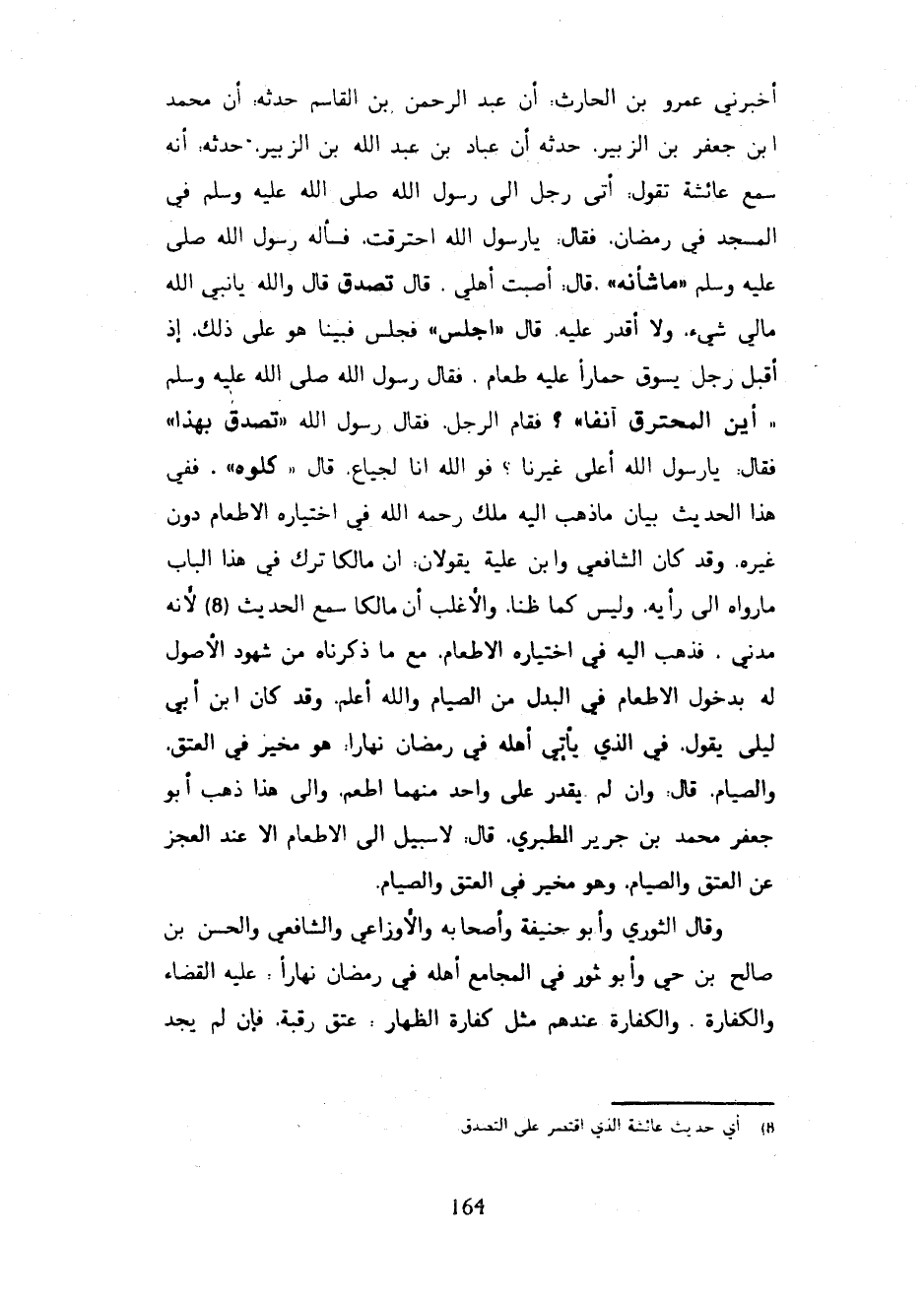 أَخْبَرَنِي عَمْرُو بْنُ الْحَارِثِ أَنَّ عَبْدَ الرَّحْمَنِ بْنَ الْقَاسِمِ حَدَّثَهُ أَنَّ مُحَمَّدَ بْنَ جَعْفَرِ بْنِ الزُّبَيْرِ حَدَّثَهُ أَنَّ عَبَّادَ بْنَ عَبْدِ اللَّهِ بْنِ الزُّبَيْرِ حَدَّثَهُ أَنَّهُ سَمِعَ عَائِشَةَ تَقُولُ أَتَى رَجُلٌ إِلَى رَسُولِ اللَّهِ صَلَّى اللَّهُ عَلَيْهِ وَسَلَّمَ فِي الْمَسْجِدِ فِي رَمَضَانَ فَقَالَ يَا رَسُولَ اللَّهِ احْتَرَقْتُ فَسَأَلَهُ رَسُولُ اللَّهِ صَلَّى اللَّهُ عَلَيْهِ وَسَلَّمَ مَا شَأْنُهُ قَالَ أَصَبْتُ أَهْلِي قَالَ تَصَدَّقْ قَالَ وَاللَّهِ يَا نَبِيَّ اللَّهِ مَا لِي شَيْءٌ وَلَا أَقْدِرُ عَلَيْهِ قَالَ اجْلِسْ فَجَلَسَ فَبَيْنَا هُوَ عَلَى ذَلِكَ إِذْ أَقْبَلَ رَجُلٌ يَسُوقُ حِمَارًا عَلَيْهِ طَعَامٌ فَقَالَ رَسُولُ اللَّهِ صَلَّى اللَّهُ عَلَيْهِ وَسَلَّمَ أَيْنَ الْمُحْتَرِقُ آنِفًا فَقَامَ الرَّجُلُ فَقَالَ رَسُولُ اللَّهِ تَصَدَّقْ بِهَذَا فَقَالَ يَا رَسُولَ اللَّهِ أَعَلَى غَيْرِنَا فَوَاللَّهِ إِنَّا لَجِيَاعٌ قَالَ كُلُوهُ فَفِي هَذَا الْحَدِيثِ بَيَانُ مَا ذهب إليه ملك رَحِمَهُ اللَّهُ فِي اخْتِيَارِهِ الْإِطْعَامَ دُونَ غَيْرِهِ وَقَدْ كَانَ الشَّافِعِيُّ وَابْنُ عُلَيَّةَ يَقُولَانِ إِنَّ مَالِكًا تَرَكَ فِي هَذَا الْبَابِ مَا رَوَاهُ إِلَى رَأْيِهِ وَلَيْسَ كَمَا ظَنَّا وَالْأَغْلَبُ أَنَّ مَالِكًا سَمِعَ الْحَدِيثَ لِأَنَّهُ مَدَنِيٌّ فَذَهَبَ إِلَيْهِ فِي اخْتِيَارِهِ الْإِطْعَامَ مَعَ مَا ذَكَرْنَاهُ مِنْ شُهُودِ الْأُصُولِ لَهُ بِدُخُولِ الْإِطْعَامِ فِي الْبَدَلِ مِنَ الصِّيَامِ وَاللَّهُ أَعْلَمُ وَقَدْ كَانَ ابْنُ أَبِي لَيْلَى يَقُولُ فِي الَّذِي يَأْتِي أَهْلَهُ فِي رَمَضَانَ نَهَارًا هُوَ مُخَيَّرٌ فِي الْعِتْقِ وَالصِّيَامِ قَالَ وَإِنْ لَمْ يَقْدِرْ عَلَى وَاحِدٍ مِنْهُمَا أَطْعَمَ وَإِلَى هَذَا ذَهَبَ أَبُو جَعْفَرٍ مُحَمَّدُ بْنُ جَرِيرٍ الطَّبَرِيُّ قَالَ لَا سَبِيلَ إِلَى الْإِطْعَامِ إِلَّا عِنْدَ الْعَجْزِ عَنِ الْعِتْقِ وَالصِّيَامِ وَهُوَ مُخَيَّرٌ فِي الْعِتْقِ وَالصِّيَامِ وَقَالَ الثَّوْرِيُّ وَأَبُو حَنِيفَةَ وَأَصْحَابُهُ وَالْأَوْزَاعِيُّ وَالشَّافِعِيُّ وَالْحَسَنُ بْنُ صَالِحِ بْنِ حَيٍّ وَأَبُو ثَوْرٍ فِي الْمُجَامِعِ أَهْلَهُ فِي رَمَضَانَ نَهَارًا عَلَيْهِ الْقَضَاءُ وَالْكَفَّارَةُ وَالْكَفَّارَةُ عِنْدَهُمْ مِثْلُ كَفَّارَةِ الظِّهَارِ عِتْقُ رَقَبَةٍ فَإِنْ لَمْ يَجِدْ
