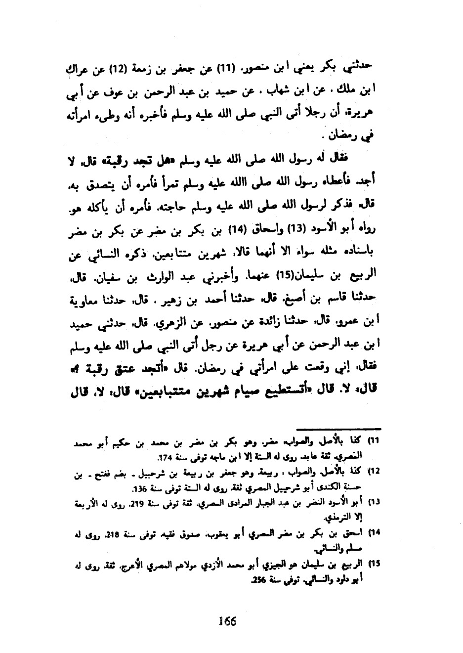 حَدَّثَنِي بَكْرٌ يَعْنِي ابْنَ مَنْصُورٍ عَنْ جَعْفَرِ بن زمعة عن عراك بن ملك عَنِ ابْنِ شِهَابٍ عَنْ حُمَيْدِ بْنِ عَبْدِ الرَّحْمَنِ بْنِ عَوْفٍ عَنْ أَبِي هُرَيْرَةَ أَنَّ رَجُلًا أَتَى النَّبِيَّ صَلَّى اللَّهُ عَلَيْهِ وَسَلَّمَ فأخبره أنه وطىء امْرَأَتَهُ فِي رَمَضَانَ فَقَالَ لَهُ رَسُولُ اللَّهِ صَلَّى اللَّهُ عَلَيْهِ وَسَلَّمَ هَلْ تَجِدُ رَقَبَةً قَالَ لَا أَجِدُ فَأَعْطَاهُ رَسُولُ اللَّهِ صَلَّى اللَّهُ عَلَيْهِ وَسَلَّمَ تَمْرًا فَأَمَرَهُ أَنْ يَتَصَدَّقَ بِهِ قَالَ فَذَكَرَ لِرَسُولِ اللَّهِ صَلَّى اللَّهُ عَلَيْهِ وَسَلَّمَ حَاجَتَهُ فَأَمَرَهُ أَنْ يَأْكُلَهُ هُوَ رَوَاهُ أَبُو الْأَسْوَدِ وَإِسْحَاقُ بْنُ بَكْرِ بْنِ مُضَرَ عَنْ بَكْرِ بْنِ مُضَرَ بِإِسْنَادِهِ مِثْلَهُ سَوَاءٌ إِلَّا أَنَّهُمَا قَالَا شَهْرَيْنِ مُتَتَابِعَيْنِ ذَكَرُهُ النَّسَائِيُّ عَنِ الرَّبِيعِ بْنِ سُلَيْمَانَ عَنْهُمَا وَأَخْبَرَنِي عبد الوارث بن سفيان قال حدثنا قاسم بْنُ أَصْبَغَ قَالَ حَدَّثَنَا أَحْمَدُ بْنُ زُهَيْرٍ قَالَ حَدَّثَنَا مُعَاوِيَةُ بْنُ عَمْرٍو قَالَ حَدَّثَنَا زَائِدَةُ عَنْ مَنْصُورٍ عَنِ الزُّهْرِيِّ قَالَ حَدَّثَنِي حُمَيْدِ بْنِ عَبْدِ الرَّحْمَنِ عَنْ أَبِي هُرَيْرَةَ عَنِ رَجُلٍ أَتَى النَّبِيَّ صَلَّى اللَّهُ عَلَيْهِ وَسَلَّمَ فَقَالَ إِنِّي وَقَعْتُ عَلَى امْرَأَتِي فِي رَمَضَانَ قَالَ أَتَجِدُ عِتْقَ رَقَبَةٍ قَالَ لَا قَالَ أَتَسْتَطِيعُ صِيَامَ شَهْرَيْنِ مُتَتَابِعَيْنِ قَالَ لَا قال