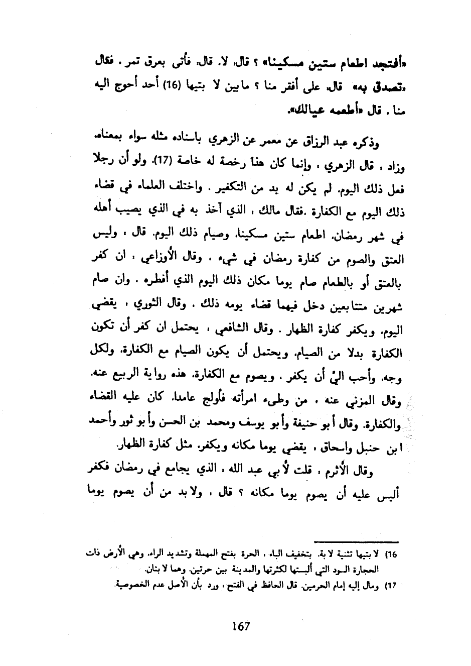 أَفَتَجِدُ إِطْعَامَ سِتِّينَ مِسْكِينًا قَالَ لَا قَالَ فَأُتِيَ بِعَرَقِ تَمْرٍ فَقَالَ تَصَدَّقْ بِهِ قَالَ عَلَى أَفْقَرِ مِنَّا مَا بَيْنَ لَابَتَيْهَا أَحَدٌ أَحْوَجُ إِلَيْهِ مِنَّا قَالَ أَطْعِمْهُ عِيَالَكَ وَذَكَرَهُ عَبْدُ الرَّزَّاقِ عَنْ مَعْمَرٍ عَنِ الزُّهْرِيِّ بِإِسْنَادِهِ مِثْلَهُ سَوَاءٌ بِمَعْنَاهُ وَزَادَ قَالَ الزُّهْرِيُّ وَإِنَّمَا كَانَ هَذَا رُخْصَةً لَهُ خَاصَّةً وَلَوْ أَنَّ رَجُلًا فَعَلَ ذَلِكَ الْيَوْمَ لَمْ يَكُنْ لَهُ بُدٌّ مِنَ التَّكْفِيرِ وَاخْتَلَفَ الْعُلَمَاءُ فِي قَضَاءِ ذَلِكَ الْيَوْمِ مَعَ الْكَفَّارَةِ فَقَالَ مَالِكٌ الَّذِي آخُذُ بِهِ فِي الَّذِي يُصِيبُ أَهْلَهُ فِي شَهْرِ رَمَضَانَ إِطْعَامُ سِتِّينَ مِسْكِينًا وَصِيَامُ ذَلِكَ الْيَوْمِ قَالَ وَلَيْسَ الْعِتْقُ وَالصَّوْمُ مِنْ كَفَّارَةِ رَمَضَانَ فِي شَيْءٍ وَقَالَ الْأَوْزَاعِيُّ إِنْ كَفَّرَ بِالْعِتْقِ أَوْ بِالطَّعَامِ صَامَ يَوْمًا مَكَانَ ذَلِكَ الْيَوْمِ الَّذِي أَفْطَرَهُ وَإِنْ صَامَ شَهْرَيْنِ مُتَتَابِعَيْنِ دَخَلَ فِيهِمَا قَضَاءُ يَوْمِهِ ذَلِكَ وَقَالَ الثَّوْرِيُّ يَقْضِي الْيَوْمَ وَيُكَفِّرُ كَفَّارَةَ الظِّهَارِ وَقَالَ الشَّافِعِيُّ يَحْتَمِلُ إِنْ كَفَّرَ أَنْ تَكُونَ الْكَفَّارَةُ بَدَلًا مِنَ الصِّيَامِ وَيُحْتَمَلُ أَنْ يَكُونَ الصِّيَامُ مَعَ الكفارة ولكل وَجْهٌ وَأَحَبُّ إِلَيَّ أَنْ يُكَفِّرَ وَيَصُومَ مَعَ الْكَفَّارَةِ هَذِهِ رِوَايَةُ الرَّبِيعِ عَنْهُ وَقَالَ الْمُزَنِيُّ عنه من وطىء امْرَأَتَهُ فَأَوْلَجَ عَامِدًا كَانَ عَلَيْهِ الْقَضَاءُ وَالْكَفَّارَةُ وَقَالَ أَبُو حَنِيفَةَ وَأَبُو يُوسُفَ وَمُحَمَّدُ بْنُ الْحَسَنِ وَأَبُو ثَوْرٍ وَأَحْمَدُ بْنُ حَنْبَلٍ وَإِسْحَاقُ يَقْضِي يَوْمًا مَكَانَهُ وَيُكَفِّرُ مِثْلَ كَفَّارَةِ الظِّهَارِ وَقَالَ الْأَثْرَمُ قُلْتُ لِأَبِي عَبْدِ اللَّهِ الَّذِي يُجَامِعُ فِي رَمَضَانَ فَكَفَّرَ أَلَيْسَ عَلَيْهِ أَنْ يَصُومَ يَوْمًا مَكَانَهُ قَالَ وَلَا بُدَّ مِنْ أَنْ يَصُومَ يَوْمًا