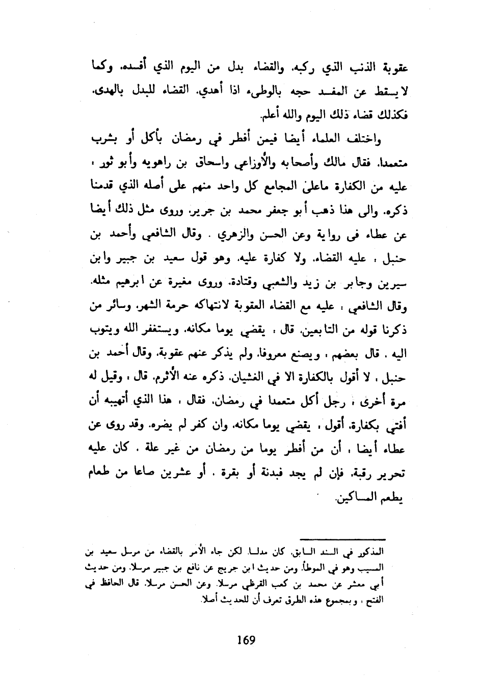 عُقُوبَةُ الذَّنْبِ الَّذِي رَكِبَهُ وَالْقَضَاءُ بَدَلٌ مِنَ الْيَوْمِ الَّذِي أَفْسَدَهُ وَكَمَا لَا يَسْقُطُ عَنِ المفسد حجه بالوطىء إِذَا أَهْدَى الْقَضَاءُ لِلْبَدَلِ بِالْهَدْيِ فَكَذَلِكَ قَضَاءُ ذَلِكَ الْيَوْمِ وَاللَّهُ أَعْلَمُ وَاخْتَلَفَ الْعُلَمَاءُ أَيْضًا فِيمَنْ أَفْطَرَ فِي رَمَضَانَ بِأَكْلٍ أَوْ بِشُرْبٍ مُتَعَمِّدًا فَقَالَ مَالِكٌ وَأَصْحَابُهُ وَالْأَوْزَاعِيُّ وَإِسْحَاقُ بْنُ رَاهَوَيْهِ وَأَبُو ثَوْرٍ عَلَيْهِ مِنَ الْكَفَّارَةِ مَا عَلَى الْمُجَامِعِ كُلُّ وَاحِدٍ مِنْهُمْ عَلَى أَصْلِهِ الَّذِي قَدَّمْنَا ذِكْرَهُ وَإِلَى هَذَا ذَهَبَ أَبُو جَعْفَرٍ مُحَمَّدُ بْنُ جَرِيرٍ وَرُوِيَ مِثْلُ ذَلِكَ أَيْضًا عَنْ عَطَاءٍ فِي رِوَايَةٍ وَعَنِ الْحَسَنِ وَالزُّهْرِيِّ وَقَالَ الشَّافِعِيُّ وَأَحْمَدُ بْنُ حَنْبَلٍ عَلَيْهِ الْقَضَاءُ وَلَا كَفَّارَةَ عَلَيْهِ وَهُوَ قَوْلُ سَعِيدِ بْنِ جُبَيْرٍ وَابْنِ سِيرِينَ وَجَابِرِ بْنِ زَيْدٍ والشعبي وقتادة وروى مغيرة عن إبرهيم مثله وقال الشافعي عليه مع القضاء العقوبة لِانْتِهَاكِهِ حُرْمَةَ الشَّهْرِ وَسَائِرُ مَنْ ذَكَرْنَا قَوْلَهُ مِنَ التَّابِعِينَ قَالَ يَقْضِي يَوْمًا مَكَانَهُ وَيَسْتَغْفِرُ اللَّهَ وَيَتُوبُ إِلَيْهِ قَالَ بَعْضُهُمْ وَيَصْنَعُ مَعْرُوفًا وَلَمْ يُذْكَرْ عَنْهُمْ عُقُوبَةٌ وَقَالَ أَحْمَدُ بْنُ حَنْبَلٍ لَا أَقُولُ بِالْكَفَّارَةِ إِلَّا فِي الْغَشَيَانِ ذَكَرَهُ عَنْهُ الْأَثْرَمُ قَالَ وَقِيلَ لَهُ مَرَّةً أُخْرَى رَجُلٌ أَكَلَ مُتَعَمِّدًا فِي رَمَضَانَ فَقَالَ هَذَا الَّذِي أَتَهَيَّبُهُ أَنْ أُفْتِيَ بِكَفَّارَةٍ أَقُولُ يَقْضِي يَوْمًا مَكَانَهُ وَإِنْ كَفَّرَ لَمْ يَضُرَّهُ وَقَدْ رُوِيَ عَنْ عَطَاءٍ أَيْضًا أَنَّ مَنْ أَفْطَرَ يَوْمًا مِنْ رَمَضَانَ مِنْ غَيْرِ عِلَّةٍ كَانَ عَلَيْهِ تَحْرِيرُ رَقَبَةٍ فَإِنْ لَمْ يَجِدْ فَبَدَنَةٌ أَوْ بَقَرَةٌ أَوْ عِشْرِينَ صَاعًا مِنْ طَعَامٍ يُطْعِمُ الْمَسَاكِينَ