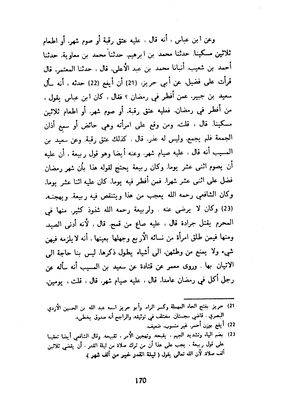 وَعَنِ ابْنِ عَبَّاسٍ أَنَّهُ قَالَ عَلَيْهِ عِتْقُ رَقَبَةٍ أَوْ صَوْمُ شَهْرٍ أَوْ إِطْعَامُ ثَلَاثِينَ مسكينا حدثنا محمد بن إبرهيم حَدَّثَنَا مُحَمَّدُ بْنُ مُعَاوِيَةَ حَدَّثَنَا أَحْمَدُ بْنُ شُعَيْبٍ أَنْبَأَنَا مُحَمَّدُ بْنُ عَبْدِ الْأَعْلَى قَالَ حَدَّثَنَا الْمُعْتَمِرُ قَالَ قَرَأْتُ عَلَى فُضَيْلٍ عَنْ أَبِي حَرِيزٍ أَنَّ أَيْفَعَ حَدَّثَهُ أَنَّهُ سَأَلَ سَعِيدَ بْنَ جُبَيْرٍ عَمَّنْ أَفْطَرَ فِي رَمَضَانَ فَقَالَ كَانَ ابْنُ عَبَّاسٍ يَقُولُ مَنْ أَفْطَرَ فِي رَمَضَانَ فَعَلَيْهِ عِتْقُ رَقَبَةٍ أَوْ صَوْمُ شَهْرٍ أَوْ إِطْعَامُ ثَلَاثِينَ مِسْكِينًا قَالَ قُلْتُ وَمَنْ وَقَعَ عَلَى امْرَأَتِهِ وَهِيَ حَائِضٌ أَوْ سَمِعَ أَذَانَ الْجُمُعَةِ فَلَمْ يَجْمَعْ وَلَيْسَ لَهُ عُذْرٌ قَالَ كَذَلِكَ عِتْقُ رَقَبَةٍ وَعَنْ سَعِيدِ بْنِ الْمُسَيَّبِ أَنَّهُ قَالَ عَلَيْهِ صِيَامُ شَهْرٍ وَعَنْهُ أَيْضًا وَهُوَ قَوْلُ رَبِيعَةَ أَنَّ عَلَيْهِ أَنْ يَصُومَ اثْنَيْ عَشَرَ يَوْمًا وَكَانَ رَبِيعَةُ يَحْتَجُّ لِقَوْلِهِ هَذَا بِأَنَّ شَهْرَ رَمَضَانَ فُضِّلَ عَلَى اثْنَيْ عَشَرَ شَهْرًا فَمَنْ أَفْطَرَ فِيهِ يَوْمًا كَانَ عَلَيْهِ اثْنَا عَشَرَ يَوْمًا وَكَانَ الشَّافِعِيُّ رَحِمَهُ اللَّهُ يَعْجَبُ مِنْ هَذَا وَيَتَنَقَّصُ فِيهِ رَبِيعَةَ وَيَهْجُنُهُ وَكَانَ لَا يَرْضَى عَنْهُ وَلِرَبِيعَةَ رَحِمَهُ اللَّهُ شُذُوذٌ كَثِيرٌ مِنْهَا فِي الْمُحْرِمِ يَقْتُلُ جَرَادَةً قَالَ عَلَيْهِ صَاعٌ مِنْ قَمْحٍ قَالَ لِأَنَّهُ أَدْنَى الصَّيْدِ وَمِنْهَا فِيمَنْ طَلَّقَ امْرَأَةً مِنْ نِسَائِهِ الْأَرْبَعِ وَجَهِلَهَا بِعَيْنِهَا أَنَّهُ لَا يَلْزَمُهُ فِيهِنَّ شَيْءٌ وَلَا يُمْنَعُ مِنْ وَطْئِهِنَّ إِلَى أَشْيَاءَ يَطُولُ ذِكْرُهَا لَيْسَ بِنَا حَاجَةٌ إِلَى الْإِتْيَانِ بِهَا وَرَوَى مَعْمَرٌ عَنْ قَتَادَةَ عَنْ سَعِيدِ بْنِ الْمُسَيَّبِ أَنَّهُ سَأَلَهُ عَنْ رَجُلٍ أَكَلَ فِي رَمَضَانَ عَامِدًا قَالَ عَلَيْهِ صِيَامُ شَهْرٍ قَالَ قُلْتُ يَوْمَيْنِ