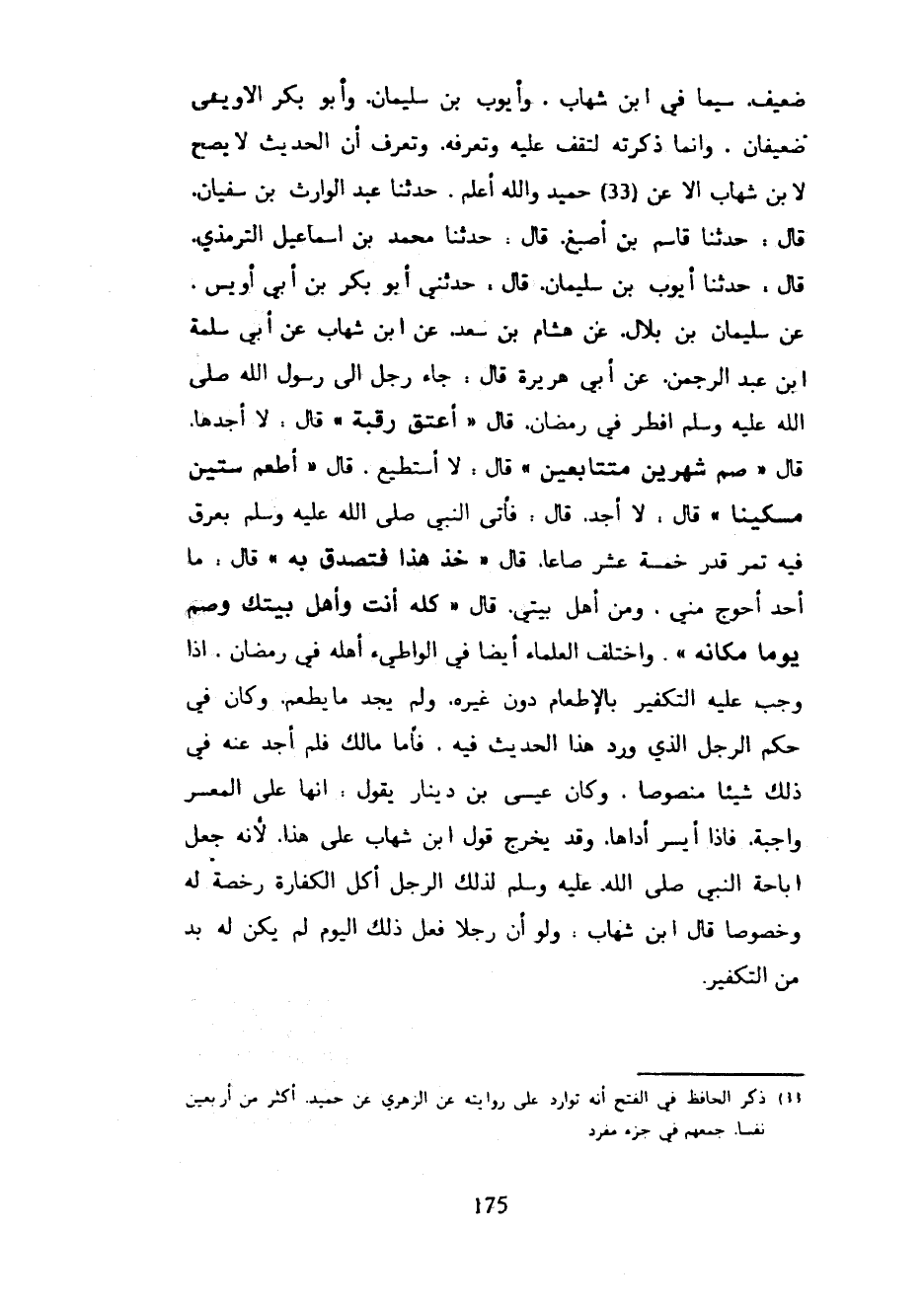 ضَعِيفٌ سِيَّمَا فِي ابْنِ شِهَابٍ وَأَيُّوبُ بْنُ سُلَيْمَانَ وَأَبُو بَكْرٍ الْأُوَيْسِيُّ! ضَعِيفَانِ وَإِنَّمَا ذَكَرْتُهُ لِتَقِفَ عَلَيْهِ وَتَعْرِفَهُ وَتَعْرِفَ أَنَّ الْحَدِيثَ لَا يَصِحُّ لِابْنِ شِهَابٍ إِلَّا عَنْ حُمَيْدٍ وَاللَّهُ أَعْلَمُ حَدَّثَنَا عَبْدُ الْوَارِثِ بْنُ سُفْيَانَ قَالَ حَدَّثَنَا قَاسِمُ بْنُ أَصْبَغَ قَالَ حَدَّثَنَا مُحَمَّدُ بْنُ إِسْمَاعِيلَ التِّرْمِذِيُّ قَالَ حَدَّثَنَا أَيُّوبُ بْنُ سُلَيْمَانَ قَالَ حَدَّثَنِي أَبُو بَكْرِ بْنُ أَبِي أُوَيْسٍ عَنْ سُلَيْمَانَ بْنِ بِلَالٍ عَنْ هِشَامِ بْنِ سَعْدٍ عَنِ ابْنِ شِهَابٍ عَنْ أَبِي سَلَمَةَ بْنِ عَبْدِ الرَّحْمَنِ عَنْ أَبِي هُرَيْرَةَ قَالَ جَاءَ رَجُلٌ إِلَى رَسُولِ اللَّهِ صَلَّى اللَّهُ عَلَيْهِ وَسَلَّمَ أَفْطَرَ فِي رَمَضَانَ قَالَ أَعْتِقْ رَقَبَةً قَالَ لَا أَجِدُهَا قَالَ صُمْ شَهْرَيْنِ مُتَتَابِعَيْنِ قَالَ لَا أَسْتَطِيعُ قَالَ أَطْعِمْ سِتِّينَ مِسْكِينًا قَالَ لَا أَجِدُ قَالَ فَأُتِيَ النَّبِيُّ صَلَّى اللَّهُ عَلَيْهِ وَسَلَّمَ بِعَرَقٍ فِيهِ تمر قدر خمسة عشر صاعا قال خذا هَذَا فَتَصَدَّقْ بِهِ قَالَ مَا أَحَدٌ أَحْوَجَ مِنِّي وَمِنْ أَهْلِ بَيْتِي قَالَ كُلْهُ أَنْتَ وَأَهْلُ بَيْتِكَ وَصُمْ يَوْمًا مَكَانَهُ وَاخْتَلَفَ الْعُلَمَاءُ أيضا في الواطيء أَهْلَهُ فِي رَمَضَانَ إِذَا وَجَبَ عَلَيْهِ التَّكْفِيرُ بِالْإِطْعَامِ دُونَ غَيْرِهِ وَلَمْ يَجِدْ مَا يُطْعِمُ وكان في حكم الرجل الذي ورد هذاالحديث فِيهِ فَأَمَّا مَالِكٌ فَلَمْ أَجِدْ عَنْهُ فِي ذَلِكَ شَيْئًا مَنْصُوصًا وَكَانَ عِيسَى بْنُ دِينَارٍ يَقُولُ إِنَّهَا عَلَى الْمُعْسِرِ وَاجِبَةٌ فَإِذَا أَيْسَرَ أَدَّاهَا وَقَدْ يُخَرَّجُ قَوْلُ ابْنِ شِهَابٍ عَلَى هَذَا لِأَنَّهُ جَعَلَ إِبَاحَةَ النَّبِيِّ صَلَّى اللَّهُ عَلَيْهِ وَسَلَّمَ لِذَلِكَ الرَّجُلِ أَكْلَ الْكَفَّارَةِ رُخْصَةً لَهُ وَخُصُوصًا قَالَ ابْنُ شِهَابٍ وَلَوْ أَنَّ رَجُلًا فَعَلَ ذَلِكَ الْيَوْمَ لَمْ يَكُنْ لَهُ بُدٌّ مِنَ التَّكْفِيرِ