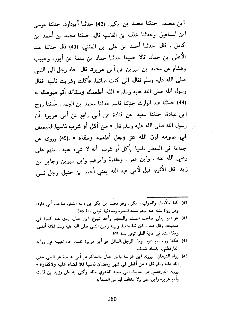 ابن مُحَمَّدٍ حَدَّثَنَا مُحَمَّدُ بْنُ بُكَيْرٍ حَدَّثَنَا أَبُو دَاوُدَ حَدَّثَنَا مُوسَى بْنُ إِسْمَاعِيلَ وَحَدَّثَنَا خَلَفُ بْنُ الْقَاسِمِ قَالَ حَدَّثَنَا مُحَمَّدُ بْنُ أَحْمَدَ بْنِ كَامِلٍ قَالَ حَدَّثَنَا أَحْمَدُ بْنُ عَلِيِّ بْنِ الْمُثَنَّى قَالَ حَدَّثَنَا عَبْدُ الْأَعْلَى بْنُ حَمَّادٍ قَالَا جَمِيعًا حَدَّثَنَا حَمَّادُ بْنُ سَلَمَةَ عَنْ أَيُّوبَ وَحَبِيبٍ وَهِشَامٍ عَنْ مُحَمَّدِ بْنِ سِيرِينَ عَنْ أَبِي هُرَيْرَةَ قَالَ جَاءَ رَجُلٌ إِلَى النَّبِيِّ صَلَّى اللَّهُ عَلَيْهِ وَسَلَّمَ فَقَالَ إِنِّي كُنْتُ صَائِمًا فَأَكَلْتُ وَشَرِبْتُ نَاسِيًا فَقَالَ رَسُولُ اللَّهِ صَلَّى اللَّهُ عَلَيْهِ وَسَلَّمَ اللَّهُ أَطْعَمَكَ وَسَقَاكَ أَتِمَّ صَوْمَكَ حَدَّثَنَا عَبْدُ الْوَارِثِ حَدَّثَنَا قَاسِمٌ حَدَّثَنَا مُحَمَّدُ بْنُ الْجَهْمِ حَدَّثَنَا رَوْحُ بْنُ عُبَادَةَ حَدَّثَنَا سَعِيدُ عَنْ قَتَادَةَ عَنْ أَبِي رَافِعٍ عَنْ أَبِي هُرَيْرَةَ أَنَّ رَسُولَ اللَّهِ صَلَّى الله عليه وسلم قال مَنْ أَكَلَ أَوْ شَرِبَ نَاسِيًا فَلْيَمْضِ فِي صَوْمِهِ فَإِنَّ اللَّهَ عَزَّ وَجَلَّ أَطْعَمَهُ وَسَقَاهُ وَرُوِيَ عَنْ جَمَاعَةٍ فِي الْمُفْطِرِ نَاسِيًا بِأَكْلٍ أَوْ شُرْبٍ أَنَّهُ لَا شَيْءَ عَلَيْهِ مِنْهُمْ عَلِيٌّ رَضِيَ اللَّهُ عَنْهُ وَابْنُ عُمَرَ وَعَلْقَمَةُ وإبرهيم وَابْنُ سِيرِينَ وَجَابِرُ بْنُ زَيْدٍ قَالَ الْأَثْرَمُ قِيلَ لِأَبِي عَبْدِ اللَّهِ يَعْنِي أَحْمَدَ بْنَ حَنْبَلٍ رَجُلٌ نَسِيَ