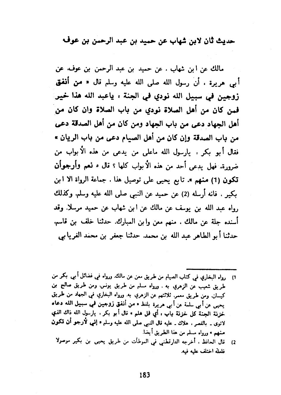 حَدِيثٌ ثَانٍ لِابْنِ شِهَابٍ عَنْ حُمَيْدِ بْنِ عَبْدِ الرَّحْمَنِ بْنِ عَوْفٍ مَالِكٌ عَنِ ابْنِ شِهَابٍ عَنْ حُمَيْدِ بْنِ عَبْدِ الرَّحْمَنِ بْنِ عَوْفٍ عَنْ أَبِي هُرَيْرَةَ أَنَّ رَسُولَ اللَّهِ صَلَّى اللَّهُ عَلَيْهِ وَسَلَّمَ قَالَ مَنْ أَنْفَقَ زَوْجَيْنِ فِي سَبِيلِ اللَّهِ نُودِيَ فِي الْجَنَّةِ يَا عَبْدَ اللَّهِ هَذَا خَيْرٌ فَمَنْ كَانَ مِنْ أَهْلِ الصَّلَاةِ نُودِيَ مِنْ بَابِ الصَّلَاةِ وَإِنْ كَانَ مِنْ أَهْلِ الْجِهَادِ دُعِيَ مِنْ بَابِ الْجِهَادِ وَمَنْ كَانَ مِنْ أَهْلِ الصَّدَقَةِ دُعِيَ مِنْ بَابِ الصَّدَقَةِ وَإِنْ كَانَ مِنْ أَهْلِ الصِّيَامِ دُعِيَ مِنْ بَابِ الرَّيَّانِ فَقَالَ أَبُو بَكْرٍ يَا رَسُولَ اللَّهِ مَا عَلَى مَنْ يُدْعَى مِنْ هَذِهِ الْأَبْوَابِ مِنْ ضَرُورَةٍ فَهَلْ يُدْعَى أَحَدٌ مِنْ هَذِهِ الْأَبْوَابِ كُلِّهَا قَالَ نَعَمْ وَأَرْجُو أَنْ تَكُونَ مِنْهُمْ - تَابَعَ يَحْيَى عَلَى تَوْصِيلِ هَذَا جَمَاعَةُ الرُّوَاةِ إِلَّا ابْنَ بُكَيْرٍ فَإِنَّهُ أَرْسَلَهُ عَنْ حُمَيْدٍ عَنِ النَّبِيِّ صَلَّى اللَّهُ عَلَيْهِ وَسَلَّمَ وَكَذَلِكَ رَوَاهُ عَبْدُ اللَّهِ بْنُ يُوسُفَ عَنْ مَالِكٍ عَنِ ابْنِ شِهَابٍ عَنْ حُمَيْدٍ مُرْسَلًا وَقَدْ أَسْنَدَهُ جِلَّةٌ عَنْ مَالِكٍ مِنْهُمْ مَعْنٌ وَابْنُ الْمُبَارَكِ حَدَّثَنَا خَلَفُ بْنُ قَاسِمٍ حَدَّثَنَا أَبُو الطَّاهِرِ عَبْدُ اللَّهِ بْنُ مُحَمَّدٍ حَدَّثَنَا جَعْفَرُ بْنُ محمد الفريابي