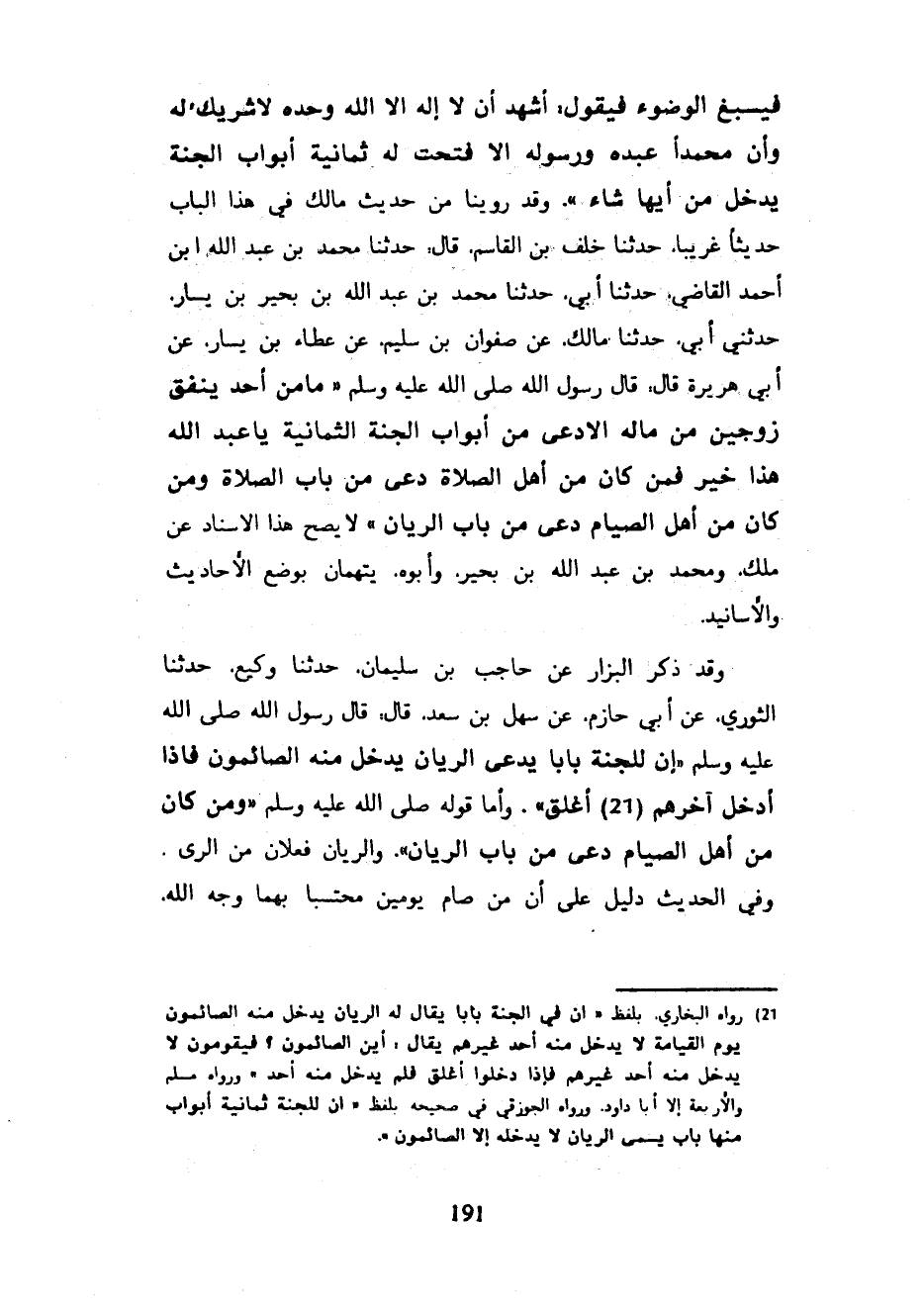 فَيُسْبِغُ الْوُضُوءَ فَيَقُولُ أَشْهَدُ أَنْ لَا إِلَهَ إِلَّا اللَّهُ وَحْدَهُ لَا شَرِيكَ لَهُ وَأَنَّ مُحَمَّدًا عَبْدُهُ وَرَسُولُهُ إِلَّا فُتِحَتْ لَهُ ثَمَانِيَةُ أَبْوَابِ الْجَنَّةِ يَدْخُلُ مِنْ أَيِّهَا شَاءَ وَقَدْ رَوَيْنَا مِنْ حَدِيثِ مَالِكٍ فِي هَذَا الْبَابِ حَدِيثًا غَرِيبًا حَدَّثَنَا خَلَفُ بْنُ الْقَاسِمِ قَالَ حَدَّثَنَا مُحَمَّدُ بْنُ عَبْدِ اللَّهِ بْنِ أَحْمَدَ الْقَاضِي حَدَّثَنَا أَبِي حَدَّثَنَا مُحَمَّدُ بْنُ عَبْدِ اللَّهِ بْنِ بَحِيرِ بْنِ يَسَارٍ حَدَّثَنِي أَبِي حَدَّثَنَا مَالِكٌ عَنْ صَفْوَانَ بْنِ سُلَيْمٍ عَنْ عَطَاءِ بْنِ يَسَارٍ عَنْ أَبِي هُرَيْرَةَ قَالَ قَالَ رَسُولُ اللَّهِ صَلَّى اللَّهُ عَلَيْهِ وَسَلَّمَ مَا مِنْ أَحَدٍ يُنْفِقُ زَوْجَيْنِ مِنْ مَالِهِ إِلَّا دُعِيَ مِنْ أَبْوَابِ الْجَنَّةِ الثَّمَانِيَةِ يَا عَبْدَ اللَّهِ هَذَا خَيْرٌ فَمَنْ كَانَ مِنْ أَهْلِ الصَّلَاةِ دُعِيَ مِنْ بَابِ الصَّلَاةِ وَمَنْ كَانَ مِنْ أَهْلِ الصِّيَامِ دُعِيَ مِنْ بَابِ الريان لا يصح هذا الإسناد عن ملك وَمُحَمَّدُ بْنُ عَبْدِ اللَّهِ بْنِ بَحِيرٍ وَأَبُوهُ يُتَّهَمَانِ بِوَضْعِ الْأَحَادِيثِ وَالْأَسَانِيدِ وَقَدْ ذَكَرَ الْبَزَّارُ عَنْ حَاجِبِ بْنِ سُلَيْمَانَ حَدَّثَنَا وَكِيعٌ حَدَّثَنَا الثَّوْرِيُّ عَنْ أَبِي حَازِمٍ عَنْ سَهْلِ بْنِ سَعْدٍ قَالَ قَالَ رَسُولُ اللَّهِ صَلَّى اللَّهُ عَلَيْهِ وَسَلَّمَ إِنَّ لِلْجَنَّةِ بَابًا يُدْعَى الرَّيَّانَ يَدْخُلُ مِنْهُ الصَّائِمُونَ فَإِذَا أُدْخِلَ آخِرُهُمْ أُغْلِقَ وَأَمَّا قَوْلُهُ صَلَّى اللَّهُ عَلَيْهِ وَسَلَّمَ وَمَنْ كَانَ مِنْ أَهْلِ الصِّيَامِ دُعِيَ مِنْ بَابِ الرَّيَّانِ وَالرَّيَّانُ فَعْلَانُ مِنَ الرِّيِّ وَفِي الْحَدِيثِ دَلِيلٌ عَلَى أَنَّ مَنْ صَامَ يَوْمَيْنِ مُحْتَسِبًا بِهِمَا وَجْهَ اللَّهِ