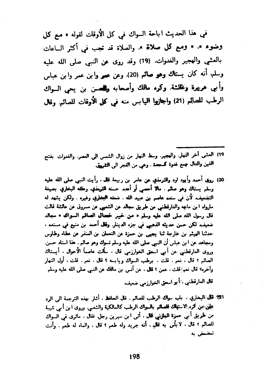 فِي هَذَا الْحَدِيثِ إِبَاحَةُ السِّوَاكِ فِي كُلِّ الْأَوْقَاتِ لِقَوْلِهِ مَعَ كُلِّ وُضُوءٍ وَمَعَ كُلِّ صَلَاةٍ وَالصَّلَاةُ قَدْ تَجِبُ فِي أَكْثَرِ السَّاعَاتِ بالعشيء وَالْهَجِيرِ وَالْغَدْوَاتِ وَقَدْ رُوِيَ عَنِ النَّبِيِّ صَلَّى اللَّهُ عَلَيْهِ وَسَلَّمَ أَنَّهُ كَانَ يَسْتَاكُ وَهُوَ صَائِمٌ وَعَنْ عُمَرَ وَابْنِ عُمَرَ وَابْنِ عَبَّاسٍ وَأَبِي هُرَيْرَةَ وَعَائِشَةَ وَكَرِهَ مَالِكٌ وَأَصْحَابُهُ وَالْحَسَنُ بْنُ يَحْيَى السِّوَاكُ الرَّطْبُ لِلصَّائِمِ وَأَجَازُوا الْيَابِسَ مِنْهُ فِي كُلِّ الْأَوْقَاتِ لِلصَّائِمِ وَقَالَ