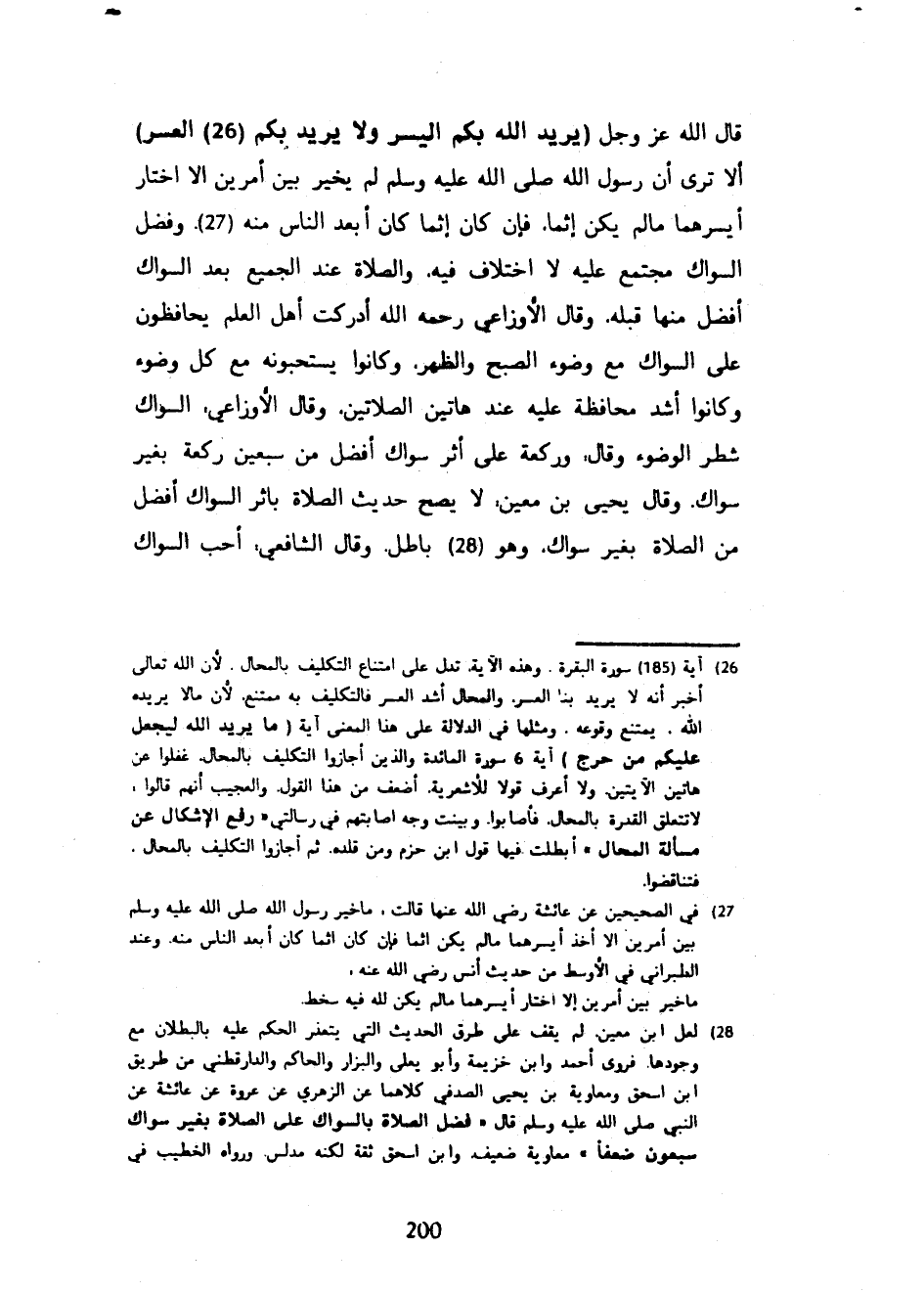 قَالَ اللَّهِ عَزَّ وَجَلَّ يُرِيدُ اللَّهُ بِكُمُ الْيُسْرَ وَلَا يُرِيدُ بِكُمُ الْعُسْرَ أَلَا تَرَى أَنَّ رَسُولَ اللَّهِ صَلَّى اللَّهُ عليه وسلم لَمْ يُخَيَّرْ بَيْنَ أَمْرَيْنِ إِلَّا اخْتَارَ أَيْسَرَهُمَا مَا لَمْ يَكُنْ إِثْمًا فَإِنْ كَانَ إِثْمًا كَانَ أَبْعَدَ النَّاسِ مِنْهُ وَفَضْلُ السِّوَاكِ مُجْتَمَعٌ عَلَيْهِ لَا اخْتِلَافَ فِيهِ وَالصَّلَاةُ عِنْدَ الْجَمِيعِ بَعْدَ السِّوَاكِ أَفْضَلُ مِنْهَا قَبْلَهُ وَقَالَ الْأَوْزَاعِيُّ رَحِمَهُ اللَّهُ أَدْرَكْتُ أَهْلَ الْعِلْمِ يُحَافِظُونَ عَلَى السِّوَاكِ مَعَ وُضُوءِ الصُّبْحِ وَالظُّهْرِ وَكَانُوا يَسْتَحِبُّونَهُ مَعَ كُلِّ وُضُوءٍ وَكَانُوا أَشَدَّ مُحَافَظَةً عَلَيْهِ عِنْدَ هَاتَيْنِ الصَّلَاتَيْنِ وَقَالَ الْأَوْزَاعِيُّ السِّوَاكُ شَطْرُ الْوُضُوءِ وَقَالَ وَرَكْعَةٌ عَلَى أَثَرِ سِوَاكٍ أَفْضَلُ مِنْ سَبْعِينَ رَكْعَةً بِغَيْرِ سِوَاكٍ وَقَالَ يَحْيَى بْنُ مَعِينٍ لَا يَصِحُّ حَدِيثُ الصَّلَاةُ بِأَثَرِ السِّوَاكِ أَفْضَلُ مِنَ الصَّلَاةِ بِغَيْرِ سِوَاكٍ وَهُوَ بَاطِلٌ وَقَالَ الشَّافِعِيُّ أُحِبُّ السِّوَاكَ
