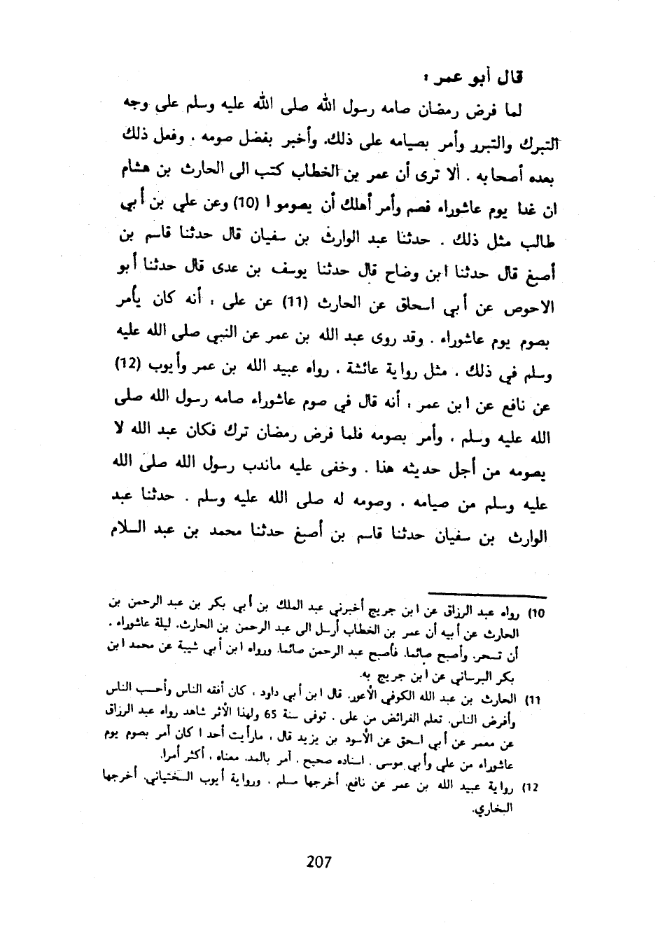 - قَالَ أَبُو عُمَرَ لَمَّا فُرِضَ رَمَضَانُ صَامَهُ رَسُولُ اللَّهِ صَلَّى اللَّهُ عَلَيْهِ وَسَلَّمَ على وَجْهِ التَّبَرُّكِ وَالتَّبَرُّرِ وَأَمَرَ بِصِيَامِهِ عَلَى ذَلِكَ وَأَخْبَرَ بِفَضْلِ صَوْمِهِ وَفَعَلَ ذَلِكَ بَعْدَهُ أَصْحَابُهُ أَلَا تَرَى أَنَّ عُمَرَ بْنَ الْخَطَّابِ كَتَبَ إِلَى الْحَارِثِ بْنِ هِشَامٍ أَنَّ غَدًا يَوْمُ عَاشُورَاءَ فَصُمْ وَأْمُرْ أَهْلَكَ أَنْ يَصُومُوا وَعَنْ عَلِيِّ بْنِ أَبِي طَالِبٍ مِثْلُ ذَلِكَ حَدَّثَنَا عَبْدُ الْوَارِثِ بْنُ سُفْيَانَ قَالَ حَدَّثَنَا قَاسِمُ بْنُ أَصْبَغَ قَالَ حَدَّثَنَا ابْنُ وَضَّاحٍ قَالَ حَدَّثَنَا يُوسُفُ بْنُ عَدِيٍّ قَالَ حَدَّثَنَا أَبُو الْأَحْوَصِ عَنْ أَبِي إِسْحَاقَ عَنْ الْحَارِثِ عَنْ عَلِيٍّ أَنَّهُ كَانَ يَأْمُرُ بِصَوْمِ يَوْمِ عَاشُورَاءَ وَقَدْ رَوَى عَبْدِ اللَّهِ بْنِ عُمَرَ عَنِ النَّبِيِّ صَلَّى اللَّهُ عَلَيْهِ وَسَلَّمَ فِي ذَلِكَ مِثْلَ رِوَايَةِ عَائِشَةَ رَوَاهُ عُبَيْدُ اللَّهِ بْنُ عُمَرَ وَأَيُّوبُ عَنْ نَافِعٍ عَنِ ابْنِ عُمَرَ أَنَّهُ قَالَ فِي صَوْمِ عَاشُورَاءَ صَامَهُ رَسُولُ اللَّهِ صَلَّى اللَّهُ عَلَيْهِ وَسَلَّمَ وَأَمَرَ بِصَوْمِهِ فَلَمَّا فُرِضَ رَمَضَانُ تُرِكَ فَكَانَ عَبْدُ اللَّهِ لَا يَصُومُهُ مِنْ أَجْلِ حَدِيثِهِ هَذَا وَخَفِيَ عَلَيْهِ مَا نَدَبَ رَسُولُ اللَّهِ صَلَّى اللَّهُ عَلَيْهِ وَسَلَّمَ مِنْ صِيَامِهِ وَصَوْمِهِ لَهُ صَلَّى اللَّهُ عَلَيْهِ وَسَلَّمَ حَدَّثَنَا عَبْدُ الْوَارِثِ بْنُ سُفْيَانَ حَدَّثَنَا قَاسِمُ بْنُ أَصْبَغَ حَدَّثَنَا مُحَمَّدُ بْنُ عَبْدِ السَّلَامِ
