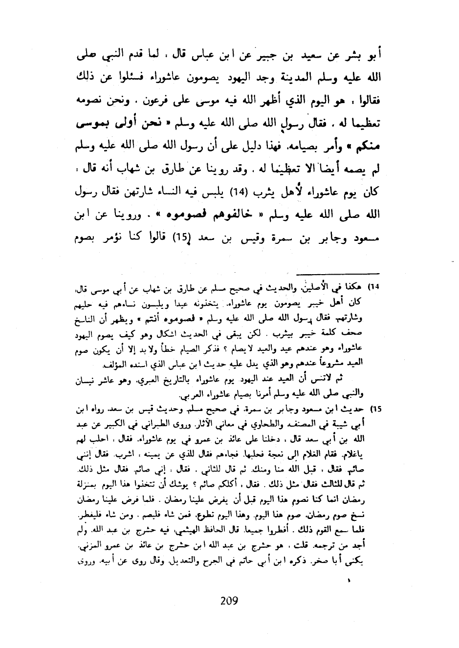 أَبُو بِشْرٍ عَنْ سَعِيدِ بْنِ جُبَيْرٍ عَنِ ابْنِ عَبَّاسٍ قَالَ لَمَّا قَدِمَ النَّبِيُّ صَلَّى اللَّهُ عَلَيْهِ وَسَلَّمَ الْمَدِينَةَ وَجَدَ الْيَهُودَ يَصُومُونَ عَاشُورَاءَ فَسُئِلُوا عَنْ ذَلِكَ فَقَالُوا هُوَ الْيَوْمُ الَّذِي أَظْهَرَ اللَّهُ فِيهِ مُوسَى عَلَى فِرْعَوْنَ وَنَحْنُ نَصُومُهُ تَعْظِيمًا لَهُ فَقَالَ رَسُولُ اللَّهِ صَلَّى اللَّهُ عَلَيْهِ وَسَلَّمَ نَحْنُ أَوْلَى بِمُوسَى مِنْكُمْ وَأَمَرَ بِصِيَامِهِ فَهَذَا دَلِيلٌ عَلَى أَنَّ رَسُولَ اللَّهِ صَلَّى اللَّهُ عَلَيْهِ وسلم لم يَصُمْهُ أَيْضًا إِلَّا تَعْظِيمًا لَهُ وَقَدْ رُوِّينَا عَنْ طَارِقِ بْنِ شِهَابٍ أَنَّهُ قَالَ كَانَ يَوْمُ عَاشُورَاءَ لِأَهْلِ يَثْرِبَ يَلْبَسُ فِيهِ النِّسَاءُ شَارَتَهُنَّ فَقَالَ رَسُولُ اللَّهِ صَلَّى اللَّهُ عَلَيْهِ وَسَلَّمَ خَالِفُوهُمْ فَصُومُوهُ وَرُوِّينَا عَنِ ابْنِ مَسْعُودٍ وَجَابِرِ بْنِ سَمُرَةَ وَقَيْسِ بْنِ سَعْدٍ قَالُوا كُنَّا نُؤْمَرُ بِصَوْمِ