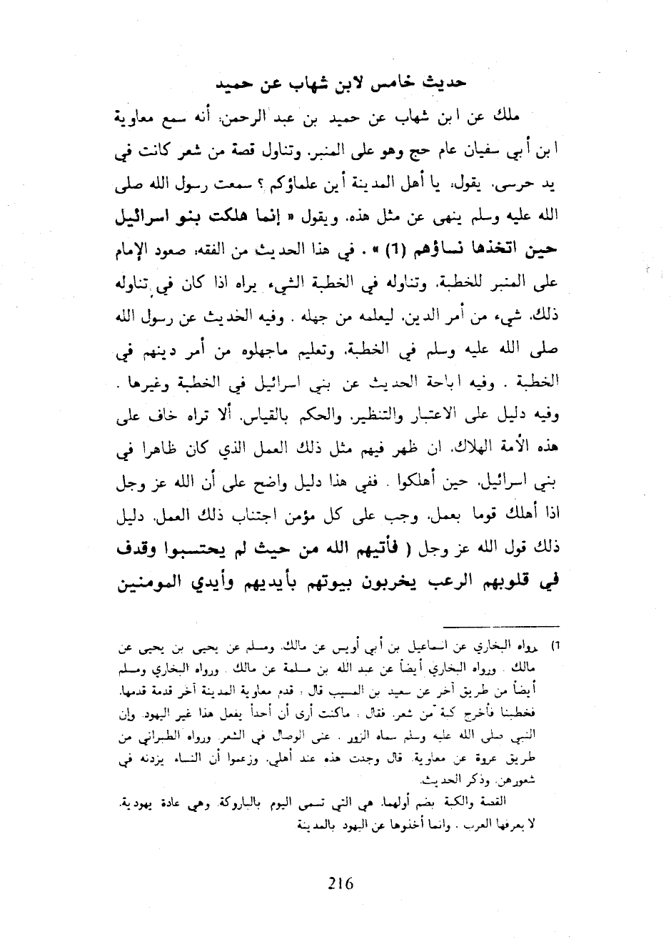 حديث خامس لابن شهاب عن حميد ملك عَنِ ابْنِ شِهَابٍ عَنْ حُمَيْدِ بْنِ عَبْدِ الرَّحْمَنِ أَنَّهُ سَمِعَ مُعَاوِيَةَ بْنَ أَبِي سُفْيَانَ عَامَ حَجٍّ وَهُوَ عَلَى الْمِنْبَرِ وَتَنَاوَلَ قَصَّةً مِنْ شَعْرٍ كَانَتْ فِي يَدِ حَرَسِيٍّ يَقُولُ يَا أَهْلَ الْمَدِينَةِ أَيْنَ عُلَمَاؤُكُمْ سَمِعْتُ رَسُولَ الله صلى الله عليه وسلم ينهى عن مِثْلِ هَذِهِ وَيَقُولُ إِنَّمَا هَلَكَتْ بَنُو إِسْرَائِيلَ حِينَ اتَّخَذَهَا نِسَاؤُهُمْ فِي هَذَا الْحَدِيثِ مِنَ الْفِقْهِ صُعُودُ الْإِمَامِ عَلَى الْمِنْبَرِ لِلْخُطْبَةِ وَتَنَاوُلُهُ فِي الْخُطْبَةِ الشَّيْءَ يَرَاهُ إِذَا كَانَ فِي تَنَاوُلِهِ ذَلِكَ شَيْءٌ مِنْ أَمْرِ الدِّينِ لِيُعَلِّمَهُ مَنْ جَهِلَهُ وَفِيهِ الْحَدِيثَ عَنْ رَسُولِ اللَّهِ صَلَّى اللَّهُ عَلَيْهِ وَسَلَّمَ فِي الْخُطْبَةِ وَتَعْلِيمُ مَا جَهِلُوهُ مِنْ أَمْرِ دِينِهِمْ فِي الْخُطْبَةِ وَفِيهِ إِبَاحَةُ الْحَدِيثِ عَنْ بَنِي إِسْرَائِيلَ فِي الْخُطْبَةِ وَغَيْرِهَا وَفِيهِ دَلِيلٌ عَلَى الِاعْتِبَارِ وَالتَّنْظِيرِ وَالْحُكْمِ بِالْقِيَاسِ أَلَا تَرَاهُ خَافَ عَلَى هَذِهِ الْأُمَّةِ الْهَلَاكَ إِنْ ظَهَرَ فِيهِمْ مِثْلُ ذَلِكَ الْعَمَلِ الَّذِي كَانَ ظَاهِرًا فِي بَنِي إِسْرَائِيلَ حِينَ أُهْلِكُوا فَفِي هَذَا دَلِيلٌ وَاضِحٌ عَلَى أَنَّ اللَّهَ عَزَّ وَجَلَّ إِذَا أَهْلَكَ قَوْمَا بِعَمَلٍ وَجَبَ عَلَى كُلِّ مُؤْمِنٍ اجْتِنَابُ ذَلِكَ الْعَمَلِ دَلِيلُ ذَلِكَ قَوْلُ اللَّهِ عَزَّ وَجَلَّ فَأَتَاهُمُ اللَّهُ مِنْ حَيْثُ لَمْ يَحْتَسِبُوا وَقَذَفَ فِي قُلُوبِهِمُ الرُّعْبَ يُخْرِبُونَ بُيُوتَهُمْ بِأَيْدِيهِمْ وَأَيْدِي المؤمنين فاعتبروا يا أولي الأبصار