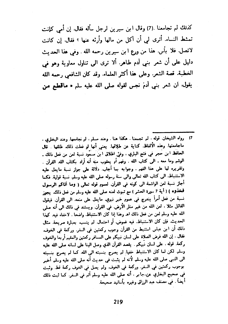 كَذَلِكَ لَمْ تُجَامِعْنَا وَقَالَ ابْنُ سِيرِينَ لِرَجُلٍ سَأَلَهُ فَقَالَ إِنْ أُمِّي كَانَتْ تَمْشُطُ النِّسَاءَ أَتُرَى لِي أَنْ آكُلَ مِنْ مَالِهَا وَأَرِثَهُ عَنْهَا فَقَالَ إِنْ كَانَتْ لَا تَصِلُ فَلَا بَأْسَ هَذَا مِنْ وَرَعِ ابْنِ سِيرِينَ رَحِمَهُ اللَّهُ وَفِي هَذَا الْحَدِيثِ دَلِيلٌ عَلَى أَنَّ شَعْرَ بَنِي آدَمَ طَاهِرٌ أَلَا تَرَى إِلَى تَنَاوُلِ مُعَاوِيَةَ وَهُوَ فِي الْخُطْبَةِ قَصَّةَ الشَّعْرِ وَعَلَى هَذَا أَكْثَرُ الْعُلَمَاءِ وَقَدْ كَانَ الشَّافِعِيُّ رَحِمَهُ اللَّهُ يَقُولُ إِنَّ شَعْرَ بَنِي آدَمَ نَجِسٌ لِقَوْلِهِ صَلَّى اللَّهُ عَلَيْهِ وَسَلَّمَ مَا قُطِعَ مِنْ