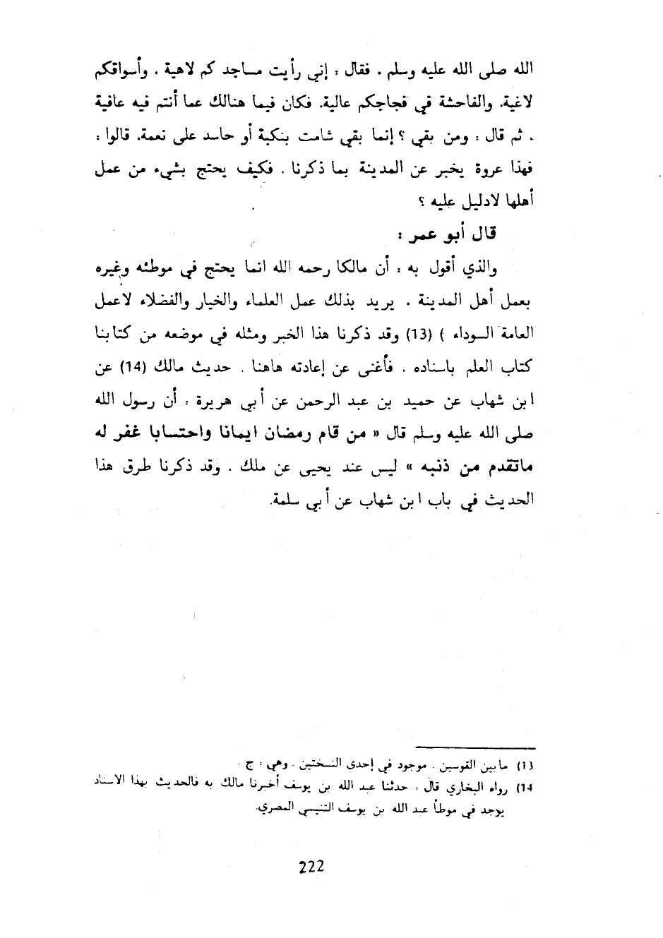 اللَّهِ صَلَّى اللَّهُ عَلَيْهِ وَسَلَّمَ فَقَالَ إِنِّي رَأَيْتُ مَسَاجِدَكُمْ لَاهِيَةً وَأَسْوَاقَكُمْ لَاغِيَةً وَالْفَاحِشَةَ فِي فِجَاجِكُمْ عَالِيَةً فَكَانَ فِيمَا هُنَالِكَ عَمَّا أَنْتُمْ فِيهِ عَافِيَةٌ ثُمَّ قَالَ وَمَنْ بَقِيَ إِنَّمَا بَقِيَ شَامِتٌ بِنَكْبَةٍ أَوْ حَاسِدٌ عَلَى نِعْمَةٍ قَالُوا فَهَذَا عُرْوَةُ يُخْبِرُ عَنِ الْمَدِينَةِ بِمَا ذَكَرْنَا فَكَيْفَ يُحْتَجُّ بِشَيْءٍ مِنْ عَمَلِ أَهْلِهَا لَا دَلِيلَ عَلَيْهِ قَالَ أَبُو عُمَرَ وَالَّذِي أَقُولُ بِهِ أَنَّ مَالِكًا رَحِمَهُ اللَّهُ إِنَّمَا يَحْتَجُّ فِي مُوَطَّئِهِ وَغَيْرِهِ بِعَمَلِ أَهْلِ الْمَدِينَةِ يُرِيدُ بِذَلِكَ عَمَلَ الْعُلَمَاءِ وَالْخِيَارِ وَالْفُضَلَاءِ لَا عَمَلَ الْعَامَّةِ السَّوْدَاءِ وَقَدْ ذَكَرْنَا هَذَا الْخَبَرَ وَمِثْلَهُ فِي مَوْضِعِهِ مِنْ كِتَابِنَا كِتَابِ الْعِلْمِ بِإِسْنَادِهِ فَأَغْنَى عَنْ إِعَادَتِهِ هَاهُنَا حَدِيثُ مَالِكٍ عَنِ ابْنِ شِهَابٍ عَنْ حُمَيْدِ بْنِ عَبْدِ الرَّحْمَنِ عَنْ أَبِي هُرَيْرَةَ أَنَّ رَسُولَ اللَّهِ صَلَّى اللَّهُ عَلَيْهِ وَسَلَّمَ قَالَ مَنْ قَامَ رَمَضَانَ إِيمَانًا وَاحْتِسَابًا غُفِرَ لَهُ مَا تَقَدَّمَ مِنْ ذنبه ليس عند يحيى عن ملك وَقَدْ ذَكَرْنَا طُرُقَ هَذَا الْحَدِيثِ فِي بَابِ ابْنِ شِهَابٍ عَنْ أَبِي سَلَمَةَ