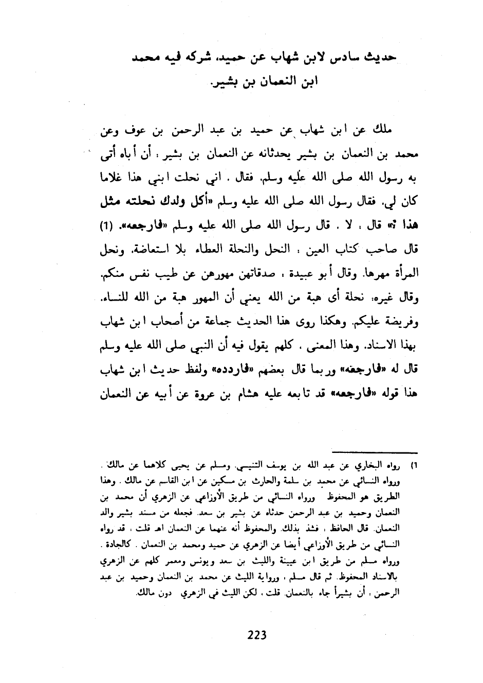 حَدِيثٌ سَادِسٌ لِابْنِ شِهَابٍ عَنْ حُمَيْدٍ! شَرَكَهُ فيه محمد بن النعمان بن بشير ملك عَنِ ابْنِ شِهَابٍ عَنْ حُمَيْدِ بْنِ عَبْدِ الرَّحْمَنِ بْنِ عَوْفٍ وَعَنْ مُحَمَّدِ بْنِ النُّعْمَانِ بْنِ بَشِيرٍ يُحَدِّثَانِهِ عَنِ النُّعْمَانِ بْنِ بَشِيرٍ أَنَّ أَبَاهُ أَتَى بِهِ رَسُولُ اللَّهِ صَلَّى اللَّهُ عَلَيْهِ وَسَلَّمَ فَقَالَ إِنِّي نَحَلْتُ ابْنِي هَذَا غُلَامًا كَانَ لِي فَقَالَ رَسُولُ اللَّهِ صَلَّى اللَّهُ عَلَيْهِ وَسَلَّمَ أَكُلَّ وَلَدِكَ نَحَلْتَهُ مِثْلَ هَذَا قَالَ لَا قَالَ رَسُولُ اللَّهِ صَلَّى اللَّهُ عَلَيْهِ وَسَلَّمَ فَارْجِعْهُ - قَالَ صَاحِبُ كِتَابِ الْعَيْنِ النَّحْلُ وَالنِّحْلَةُ الْعَطَاءُ بِلَا اسْتِعَاضَةٍ وَنَحَلَ الْمَرْأَةَ مَهْرَهَا وَقَالَ أَبُو عُبَيْدَةَ صَدَقَاتُهُنَّ مهورهن عن طيب نفس منك وَقَالَ غَيْرُهُ نِحْلَةٌ أَيْ هِبَةٌ مِنَ اللَّهِ يَعْنِي أَنَّ الْمُهُورَ هِبَةٌ مِنَ اللَّهِ لِلنِّسَاءِ وَفَرِيضَةٌ عَلَيْكُمْ وَهَكَذَا رَوَى هَذَا الْحَدِيثَ جَمَاعَةٌ مِنْ أَصْحَابِ ابْنِ شِهَابٍ بِهَذَا الْإِسْنَادِ وَهَذَا الْمَعْنَى كُلُّهُمْ يَقُولُ فِيهِ أَنَّ النَّبِيَّ صَلَّى اللَّهُ عَلَيْهِ وَسَلَّمَ قَالَ لَهُ فَارْجِعْهُ وَرُبَّمَا قَالَ بَعْضُهُمْ فَارْدُدْهُ وَلَفْظُ حَدِيثِ ابْنِ شِهَابٍ هَذَا قَوْلُهُ فَارْجِعْهُ قَدْ تَابَعَهُ عَلَيْهِ هِشَامُ بن عروة عن أبيه عن النعمان