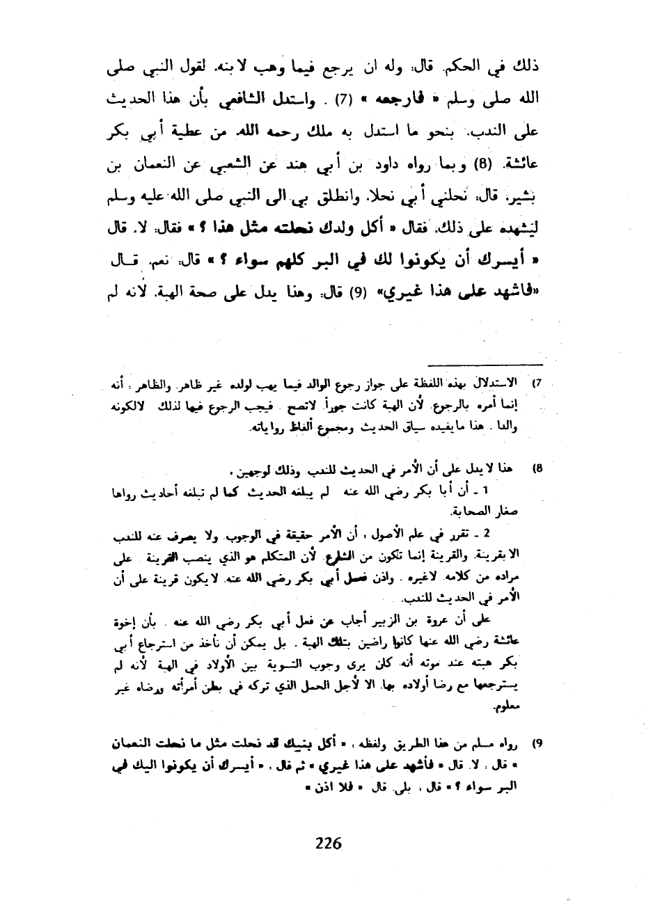 ذَلِكَ فِي الْحُكْمِ قَالَ وَلَهُ أَنْ يَرْجِعَ فِيمَا وَهَبَ لِابْنِهِ لِقَوْلِ النَّبِيِّ صَلَّى اللَّهُ عَلَيْهِ وَسَلَّمَ فَارْجِعْهُ وَاسْتَدَلَّ الشَّافِعِيُّ بِأَنَّ هَذَا الْحَدِيثَ عَلَى النَّدْبِ بِنَحْوِ مَا اسْتَدَلَّ بِهِ ملك رَحِمَهُ اللَّهُ مِنْ عَطِيَّةِ أَبِي بَكْرٍ عَائِشَةَ وَبِمَا رَوَاهُ دَاوُدُ بْنُ أَبِي هِنْدٍ عَنِ الشَّعْبِيِّ عَنِ النُّعْمَانِ بْنِ بَشِيرٍ قَالَ نَحَلَنِي أَبِي نُحْلًا وَانْطَلَقَ بِي إِلَى النَّبِيِّ صَلَّى اللَّهُ عَلَيْهِ وَسَلَّمَ لِيُشْهِدَهُ عَلَى ذَلِكَ فَقَالَ أَكُلَّ وَلَدِكَ نَحَلْتَهُ مِثْلَ هَذَا فَقَالَ لَا قَالَ أَيَسُرُّكَ أَنْ يَكُونُوا لَكَ فِي الْبِرِّ كُلُّهُمْ سَوَاءً قَالَ نَعَمْ قَالَ فَأَشْهِدْ عَلَى هَذَا غَيْرِي قَالَ وَهَذَا يَدُلُّ عَلَى صِحَّةِ الْهِبَةِ لِأَنَّهُ لَمْ