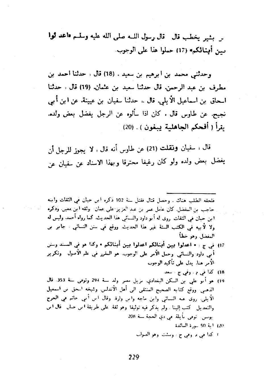 بْنَ بَشِيرٍ يَخْطُبُ قَالَ قَالَ رَسُولُ اللَّهِ صَلَّى اللَّهُ عَلَيْهِ وَسَلَّمَ اعْدِلُوا بَيْنَ أَبْنَائِكُمْ حَمَلُوا هَذَا عَلَى الْوُجُوبِ وَحَدَّثَنِي مُحَمَّدُ بْنُ إِبْرَاهِيمَ بْنِ سَعِيدٍ قَالَ حَدَّثَنَا أَحْمَدُ بْنُ مُطَرِّفِ بْنِ عَبْدِ الرَّحْمَنِ قَالَ حَدَّثَنَا سَعِيدُ بْنُ عُثْمَانَ قَالَ حَدَّثَنَا إِسْحَاقُ بْنُ إِسْمَاعِيلَ الْأَيْلِيُّ قَالَ حَدَّثَنَا سُفْيَانُ بْنُ عُيَيْنَةَ عَنِ ابْنِ أَبِي نَجِيحٍ عَنْ طَاوُسٍ قَالَ كَانَ إِذَا سَأَلُوهُ عَنِ الرَّجُلِ يُفَضِّلُ بَعْضَ وَلَدِهِ يَقْرَأُ أَفَحُكْمَ الْجَاهِلِيَّةِ يَبْغُونَ قَالَ سُفْيَانُ وَنَقَلْتُ عَنْ طَاوُسٍ أَنَّهُ قَالَ لَا يَجُوزُ لِلرَّجُلِ أَنْ يُفَضِّلَ بَعْضَ وَلَدِهِ وَلَوْ كَانَ رَغِيفًا محترقا وبهذا الإسناد عن سفيان عن