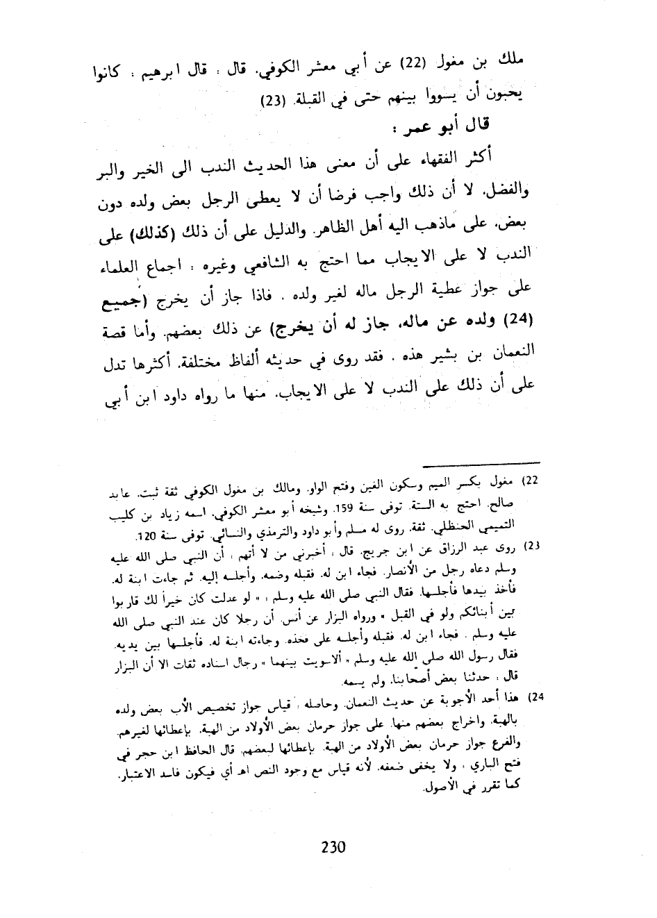 ملك بْنِ مِغْوَلٍ عَنْ أَبِي مَعْشَرٍ الْكُوفِيِّ قَالَ قال إبرهيم كَانُوا يُحِبُّونَ أَنْ يُسَوُّوا بَيْنَهُمْ حَتَّى فِي الْقُبْلَةِ - قَالَ أَبُو عُمَرَ أَكْثَرُ الْفُقَهَاءِ عَلَى أَنَّ مَعْنَى هَذَا الْحَدِيثِ النَّدْبُ إِلَى الْخَيْرِ وَالْبِرِّ وَالْفَضْلِ لَا أَنَّ ذَلِكَ وَاجِبٌ فَرْضًا أَنْ لَا يُعْطِيَ الرَّجُلُ بَعْضَ وَلَدِهِ دُونَ بَعْضٍ عَلَى مَا ذَهَبَ إِلَيْهِ أَهْلُ الظَّاهِرِ وَالدَّلِيلُ عَلَى أَنَّ ذَلِكَ (كَذَلِكَ) عَلَى النَّدْبِ لَا عَلَى الْإِيجَابِ مِمَّا احْتَجَّ بِهِ الشَّافِعِيُّ وَغَيْرُهُ إِجْمَاعُ الْعُلَمَاءِ عَلَى جَوَازِ عَطِيَّةِ الرَّجُلِ مَالَهُ لِغَيْرِ وَلَدِهِ فَإِذَا جَازَ أَنْ يُخْرِجَ (جَمِيعَ (24) وَلَدِهِ عَنْ مَالِهِ جَازَ لَهُ أَنْ يُخْرِجَ) عَنْ ذَلِكَ بَعْضَهُمْ وَأَمَّا قِصَّةُ النُّعْمَانِ بْنِ بَشِيرٍ هَذِهِ فَقَدْ رُوِيَ فِي حَدِيثِهِ أَلْفَاظٌ مُخْتَلِفَةٌ أَكْثَرُهَا تَدُلُّ عَلَى أَنَّ ذَلِكَ عَلَى النَّدْبِ لَا عَلَى الْإِيجَابِ مِنْهَا مَا رَوَاهُ دَاوُدُ بْنُ أَبِي