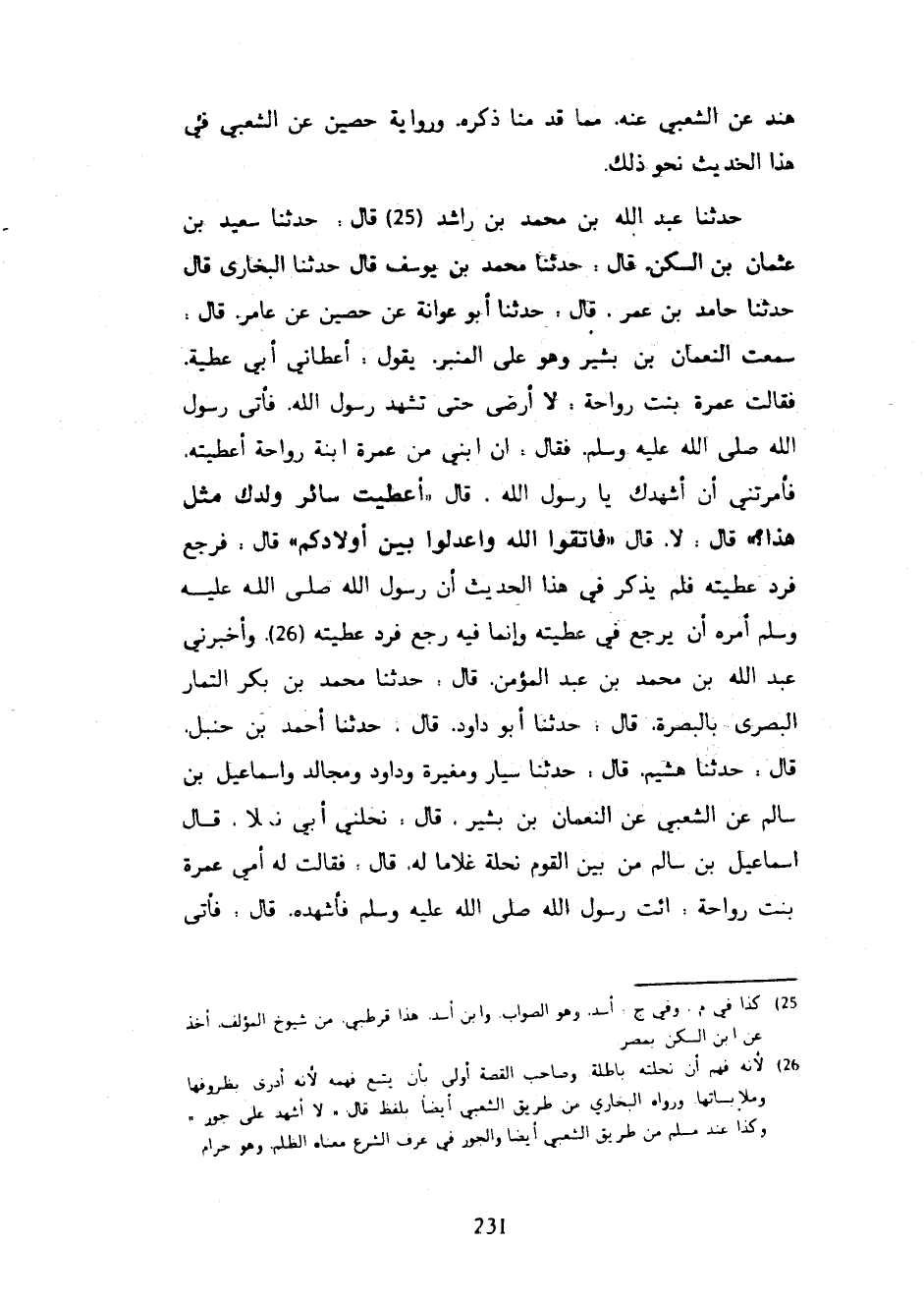 هِنْدٍ عَنِ الشَّعْبِيِّ عَنْهُ مِمَّا قَدَّمْنَا ذِكْرَهُ وَرِوَايَةُ حُصَيْنٍ عَنِ الشَّعْبِيِّ فِي هَذَا الْحَدِيثِ نَحْوُ ذَلِكَ حَدَّثَنَا عَبْدُ اللَّهِ بْنُ مُحَمَّدِ بن رشاد قَالَ حَدَّثَنَا سَعِيدُ بْنُ عُثْمَانَ بْنِ السَّكَنِ قَالَ حَدَّثَنَا مُحَمَّدُ بْنُ يُوسُفَ قَالَ حَدَّثَنَا الْبُخَارِيُّ قَالَ حَدَّثَنَا حَامِدُ بْنُ عُمَرَ قَالَ حَدَّثَنَا أَبُو عَوَانَةَ عَنْ حُصَيْنٍ عَنْ عَامِرٍ قَالَ سَمِعْتُ النُّعْمَانَ بْنَ بَشِيرٍ وَهُوَ عَلَى الْمِنْبَرِ يَقُولُ أَعْطَانِي أَبِي عَطِيَّةً فَقَالَتْ عَمْرَةُ بِنْتُ رَوَاحَةَ لَا أَرْضَى حَتَّى تُشْهِدَ رَسُولَ اللَّهِ فَأُتِيَ رَسُولُ اللَّهِ صَلَّى اللَّهُ عَلَيْهِ وَسَلَّمَ فَقَالَ إِنَّ ابْنِي مِنْ عَمْرَةَ ابْنَةِ رَوَاحَةَ أَعْطَيْتُهُ فَأَمَرَتْنِي أَنْ أُشْهِدَكَ يَا رَسُولَ اللَّهِ قَالَ أَعْطَيْتَ سَائِرَ وَلَدِكَ مِثْلَ هَذَا قَالَ لَا قَالَ فَاتَّقُوا اللَّهَ وَاعْدِلُوا بَيْنَ أَوْلَادِكُمْ قَالَ فَرَجَعَ فَرَدَّ عَطِيَّتَهُ فَلَمْ يَذْكُرْ فِي هَذَا الْحَدِيثِ أَنَّ رَسُولَ اللَّهِ صَلَّى اللَّهُ عَلَيْهِ وَسَلَّمَ أَمَرَهُ أَنْ يَرْجِعَ فِي عَطِيَّتِهِ وَإِنَّمَا فِيهِ رَجَعَ فَرَدَّ عَطِيَّتَهُ وَأَخْبَرَنِي عَبْدُ اللَّهِ بْنُ مُحَمَّدِ بْنِ عَبْدِ الْمُؤْمِنِ قَالَ حَدَّثَنَا مُحَمَّدُ بْنُ بَكْرٍ التَّمَّارُ الْبَصْرِيُّ بِالْبَصْرَةِ قَالَ حَدَّثَنَا أَبُو دَاوُدَ قَالَ حَدَّثَنَا أَحْمَدُ بْنُ حَنْبَلٍ قَالَ حَدَّثَنَا هُشَيْمٌ قَالَ حَدَّثَنَا سَيَّارٌ وَمُغِيرَةُ وَدَاوُدُ وَمُجَالِدٌ وَإِسْمَاعِيلُ بْنُ سَالِمٍ عَنِ الشَّعْبِيِّ عَنِ النُّعْمَانِ بْنِ بَشِيرٍ قَالَ نَحَلَنِي أَبِي نُحْلًا قَالَ إِسْمَاعِيلُ بْنُ سَالِمٍ مِنْ بَيْنِ الْقَوْمِ نِحْلَةً غُلَامًا لَهُ قَالَ فَقَالَتْ لَهُ أُمِّي عَمْرَةُ بِنْتُ رَوَاحَةَ ائْتِ رَسُولَ اللَّهِ صَلَّى اللَّهُ عَلَيْهِ وَسَلَّمَ فَأَشْهِدْهُ قَالَ فَأَتَى