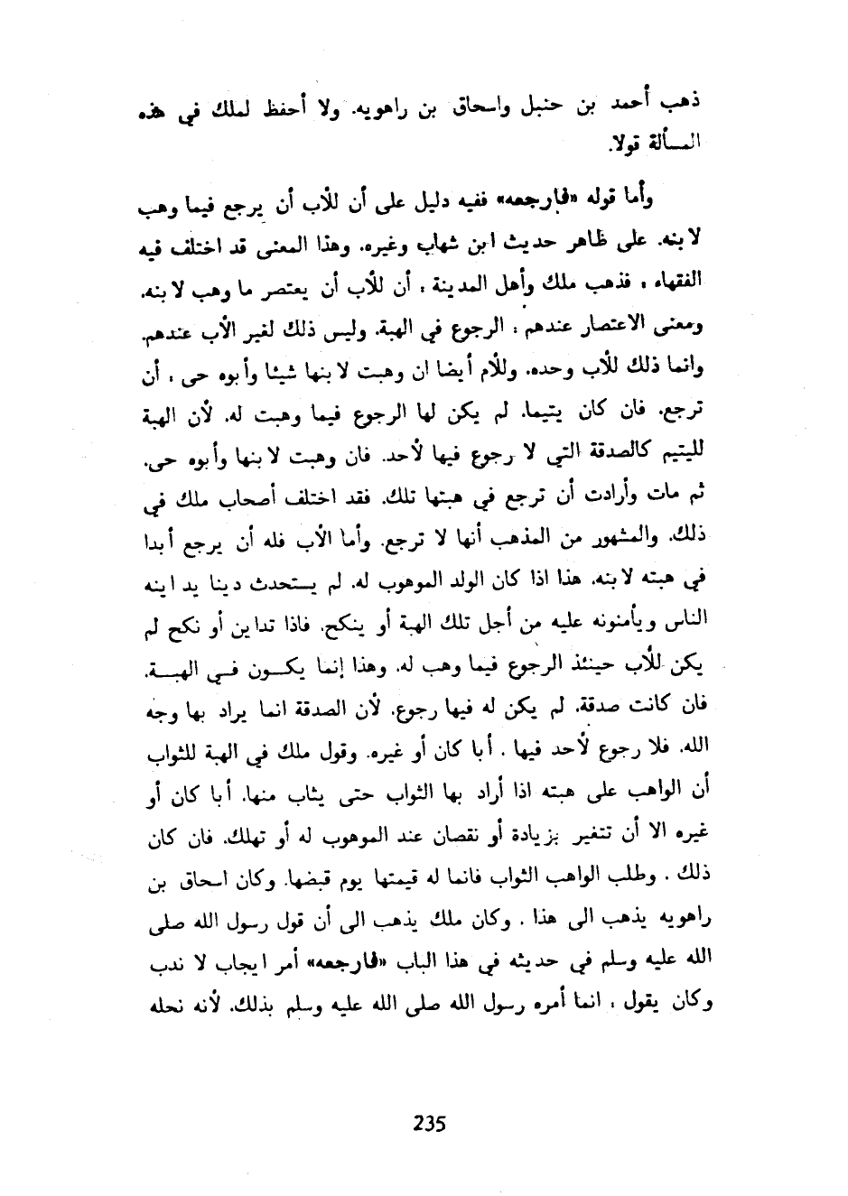 ذَهَبَ أَحْمَدُ بْنُ حَنْبَلٍ وَإِسْحَاقُ بْنُ رَاهَوَيْهِ ولا أحفظ لملك فِي هَذِهِ الْمَسْأَلَةِ قَوْلًا وَأَمَّا قَوْلُهُ فَارْجِعْهُ فَفِيهِ دَلِيلٌ عَلَى أَنَّ لِلْأَبِ أَنْ يَرْجِعَ فِيمَا وَهَبَ لِابْنِهِ عَلَى ظَاهِرِ حَدِيثِ ابْنِ شِهَابٍ وَغَيْرِهِ وَهَذَا الْمَعْنَى قَدِ اخْتَلَفَ فِيهِ الفقهاء فذهب ملك وَأَهْلُ الْمَدِينَةِ أَنَّ لِلْأَبِ أَنْ يَعْتَصِرَ مَا وَهَبَ لِابْنِهِ وَمَعْنَى الِاعْتِصَارِ عِنْدَهُمُ الرُّجُوعُ فِي الْهِبَةِ وَلَيْسَ ذَلِكَ لِغَيْرِ الْأَبِ عِنْدَهُمْ وَإِنَّمَا ذَلِكَ لِلْأَبِ وَحْدَهُ وَلِلْأُمِّ أَيْضًا إِنْ وَهَبَتْ لِابْنِهَا شَيْئًا وَأَبُوهُ حَيٌّ أَنْ تَرْجِعَ فَإِنْ كَانَ يَتِيمًا لَمْ يَكُنْ لَهَا الرُّجُوعُ فِيمَا وَهَبَتْ لَهُ لِأَنَّ الْهِبَةَ لِلْيَتِيمِ كَالصَّدَقَةِ الَّتِي لَا رُجُوعَ فِيهَا لِأَحَدٍ فَإِنْ وَهَبَتْ لِابْنِهَا وَأَبُوهُ حَيٌّ ثُمَّ مَاتَ وَأَرَادَتْ أَنْ تَرْجِعَ في هبتها تلك فقد اختلف أصحاب ملك فِي ذَلِكَ وَالْمَشْهُورُ مِنَ الْمَذْهَبِ أَنَّهَا لَا تَرْجِعُ وَأَمَّا الْأَبُ فَلَهُ أَنْ يَرْجِعَ أَبَدًا فِي هِبَتِهِ لِابْنِهِ هَذَا إِذَا كَانَ الْوَلَدُ الْمَوْهُوبُ لَهُ لَمْ يَسْتَحْدِثْ دَيْنًا يُدَايِنُهُ النَّاسُ وَيَأْمَنُونَهُ عَلَيْهِ مِنْ أَجْلِ تِلْكَ الْهِبَةِ أَوْ يَنْكِحْ فَإِذَا تَدَايَنَ أَوْ نَكَحَ لَمْ يَكُنْ للأب حنيئذ الرُّجُوعُ فِيمَا وَهَبَ لَهُ وَهَذَا إِنَّمَا يَكُونُ فِي الْهِبَةِ فَإِنْ كَانَتْ صَدَقَةً لَمْ يَكُنْ لَهُ فِيهَا رُجُوعٌ لِأَنَّ الصَّدَقَةَ إِنَّمَا يُرَادُ بِهَا وَجْهُ اللَّهِ فَلَا رُجُوعَ لِأَحَدٍ فِيهَا أبا كان أو غيره وقول ملك فِي الْهِبَةِ لِلثَّوَابِ أَنَّ الْوَاهِبَ عَلَى هِبَتِهِ إِذَا أَرَادَ بِهَا الثَّوَابَ حَتَّى يُثَابَ مِنْهَا أَبًا كَانَ أَوْ غَيْرَهُ إِلَّا أَنْ تَتَغَيَّرَ بِزِيَادَةٍ أَوْ نُقْصَانٍ عِنْدَ الْمَوْهُوبِ لَهُ أَوْ تهلك فإن كان ذلك وطلب الواهب الثَّوَابُ فَإِنَّمَا لَهُ قِيمَتُهَا يَوْمَ قَبَضَهَا وَكَانَ إِسْحَاقُ بْنُ رَاهَوَيْهِ يَذْهَبُ إِلَى هَذَا وَكَانَ ملك يَذْهَبُ إِلَى أَنَّ قَوْلَ رَسُولِ اللَّهِ صَلَّى اللَّهُ عَلَيْهِ وَسَلَّمَ فِي حَدِيثِهِ فِي هَذَا الْبَابِ فَارْجِعْهُ أَمْرُ إِيجَابٍ لَا نَدْبٍ وَكَانَ يَقُولُ إِنَّمَا أَمَرَهُ رَسُولُ اللَّهِ صَلَّى اللَّهُ عَلَيْهِ وَسَلَّمَ بِذَلِكَ لِأَنَّهُ نَحَلَهُ