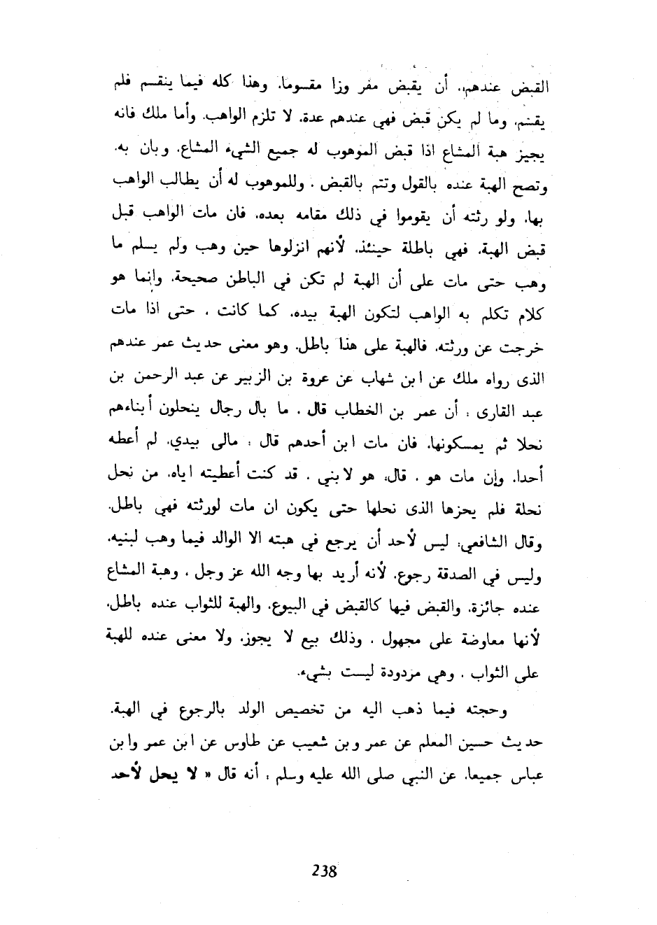 الْقَبْضُ عِنْدَهُمْ أَنْ يُقْبَضَ مَفْرُوزًا مَقْسُومًا وَهَذَا كُلُّهُ فِيمَا يَنْقَسِمُ فَلَمْ يُقَسَّمْ وَمَا لَمْ يَكُنْ قَبْضٌ فَهِيَ عِنْدُهُمْ عِدَةٌ لَا تَلْزَمُ الواهب وأما ملك فَإِنَّهُ يُجِيزُ هِبَةَ الْمَشَاعِ إِذَا قَبَضَ الْمَوْهُوبُ لَهُ جَمِيعَ الشَّيْءِ الْمَشَاعِ وَبَانَ بِهِ وَتَصِحُّ الهبة عنده بالقول وَتَتِمُّ بِالْقَبْضِ وَلِلْمَوْهُوبِ لَهُ أَنْ يُطَالِبَ الْوَاهِبَ بِهَا وَلِوَرَثَتِهِ أَنْ يَقُومُوا فِي ذَلِكَ مَقَامَهُ بعده فإن مات الواهب قبل قبض الهبة فهي باطلة حنيئذ لِأَنَّهُمْ أَنْزَلُوهَا حِينَ وَهَبَ وَلَمْ يُسَلِّمْ مَا وَهَبَ حَتَّى مَاتَ عَلَى أَنَّ الْهِبَةَ لَمْ تَكُنْ فِي الْبَاطِنِ صَحِيحَةً وَإِنَّمَا هُوَ كَلَامٌ تَكَلَّمَ بِهِ الْوَاهِبُ لِتَكُونَ الْهِبَةُ بِيَدِهِ كَمَا كَانَتْ حَتَّى إِذَا مَاتَ خَرَجَتْ عَنْ وَرَثَتِهِ فَالْهِبَةُ عَلَى هَذَا بَاطِلٌ وَهُوَ مَعْنَى حَدِيثِ عمر عندهم الذي رواه ملك عَنِ ابْنِ شِهَابٍ عَنْ عُرْوَةَ بْنِ الزُّبَيْرِ عَنْ عَبْدِ الرَّحْمَنِ بْنِ عَبْدٍ الْقَارِيِّ أَنَّ عُمَرَ بْنَ الْخَطَّابِ قَالَ مَا بَالُ رِجَالٍ يَنْحَلُونَ أَبْنَاءَهُمْ نُحْلًا ثُمَّ يُمْسِكُونَهَا فَإِنْ مَاتَ ابْنُ أَحَدِهِمْ قَالَ مَالِي بِيَدِي لَمْ أُعْطِهِ أَحَدًا وَإِنْ مَاتَ هُوَ قَالَ هُوَ لِابْنِي قَدْ كُنْتُ أُعْطَيْتُهُ إِيَّاهُ مَنْ نَحَلَ نِحْلَةً فَلَمْ يَحُزْهَا الَّذِي نُحِلَهَا حَتَّى يَكُونَ إِنْ مَاتَ لِوَرَثَتِهِ فَهِيَ بَاطِلٌ وَقَالَ الشَّافِعِيُّ لَيْسَ لأحد أن يرجع في هبته إلا الوالد فِيمَا وَهَبَ لِبَنِيهِ وَلَيْسَ فِي الصَّدَقَةِ رُجُوعٌ لِأَنَّهُ أُرِيدَ بِهَا وَجْهُ اللَّهِ عَزَّ وَجَلَّ وَهِبَةُ الْمَشَاعِ عِنْدَهُ جَائِزَةٌ وَالْقَبْضُ فِيهَا كَالْقَبْضِ فِي الْبُيُوعِ وَالْهِبَةُ لِلثَّوَابِ عِنْدَهُ بَاطِلٌ لِأَنَّهَا مُعَاوَضَةٌ عَلَى مَجْهُولٍ وَذَلِكَ بَيْعٌ لَا يَجُوزُ وَلَا مَعْنَى عِنْدَهُ لِلْهِبَةِ عَلَى الثَّوَابِ وَهِيَ مَرْدُودَةٌ لَيْسَتْ بِشَيْءٍ وَحُجَّتُهُ فِيمَا ذَهَبَ إِلَيْهِ مِنْ تَخْصِيصِ الْوَلَدِ بِالرُّجُوعِ فِي الْهِبَةِ حَدِيثُ حُسَيْنٍ الْمُعَلِّمِ عَنْ عَمْرِو بْنِ شُعَيْبٍ عَنْ طَاوُسٍ عَنِ ابْنِ عُمَرَ وَابْنِ عَبَّاسٍ جَمِيعًا عَنِ النَّبِيِّ صَلَّى اللَّهُ عَلَيْهِ وَسَلَّمَ أَنَّهُ قَالَ لَا يَحِلُّ لِأَحَدٍ
