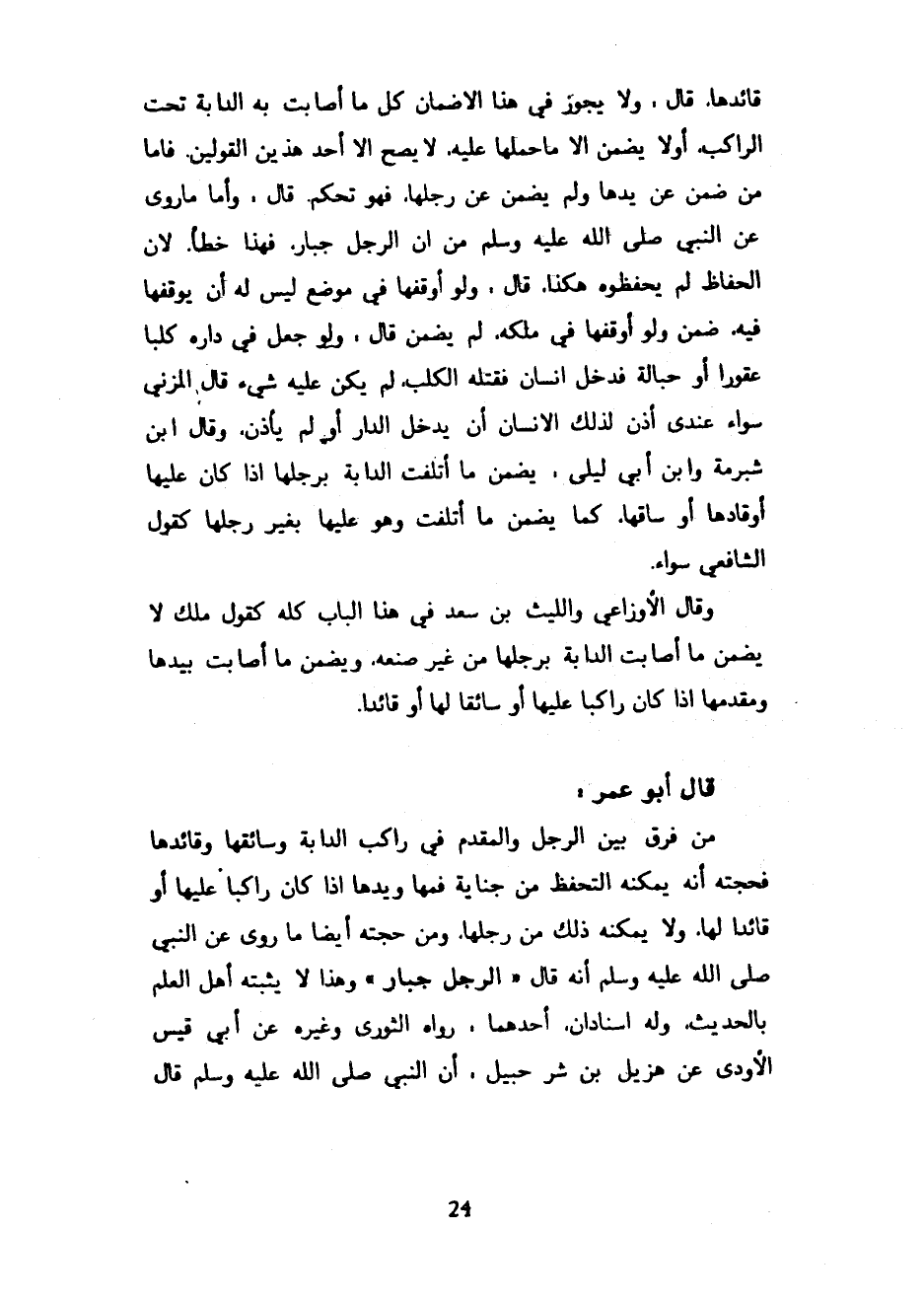 قائدها قال ولا يجوز في هذا الاضمان كُلِّ مَا أَصَابَتْ بِهِ الدَّابَّةُ تَحْتَ الرَّاكِبِ أولا يَضْمَنُ إِلَّا مَا حَمَلَهَا عَلَيْهِ لَا يَصِحُّ إِلَّا أَحَدُ هَذَيْنِ الْقَوْلَيْنِ فَأَمَّا مَنْ ضَمِنَ عَنْ يَدِهَا وَلَمْ يَضْمَنْ عَنْ رِجْلِهَا فَهُوَ تَحَكُّمٌ قَالَ وَأَمَّا مَا رُوِيَ عَنِ النَّبِيِّ صَلَّى اللَّهُ عَلَيْهِ وَسَلَّمَ مِنْ أَنَّ الرِّجْلَ جُبَارٌ فَهَذَا خَطَأٌ لِأَنَّ الْحُفَّاظَ لَمْ يَحْفَظُوهُ هَكَذَا قَالَ وَلَوْ أَوْقَفَهَا فِي مَوْضِعٍ لَيْسَ لَهُ أَنْ يُوقِفَهَا فِيهِ ضَمِنَ وَلَوْ أَوْقَفَهَا فِي مِلْكِهِ لَمْ يَضْمَنْ قَالَ وَلَوْ جَعَلَ فِي دَارِهِ كَلْبًا عَقُورًا أَوْ حُبَالَةً فَدَخَلَ إِنْسَانٌ فَقَتَلَهُ الْكَلْبُ لَمْ يَكُنْ عَلَيْهِ شَيْءٌ قَالَ الْمُزَنِيُّ سَوَاءٌ عِنْدِي أَذِنَ لِذَلِكَ الْإِنْسَانِ أَنْ يَدْخُلَ الدَّارَ أَوْ لَمْ يَأْذَنْ وَقَالَ ابْنُ شُبْرُمَةَ وَابْنُ أَبِي لَيْلَى يَضْمَنُ مَا أتلفت الدابة برجلها إذا كان عليها أوقادها أَوْ سَاقَهَا كَمَا يَضْمَنُ مَا أَتْلَفَتْ وَهُوَ عَلَيْهَا بِغَيْرِ رِجْلِهَا كَقَوْلِ الشَّافِعِيِّ سَوَاءً وَقَالَ الْأَوْزَاعِيُّ وَاللَّيْثُ بْنُ سَعْدٍ فِي هَذَا الْبَابِ كله كقول ملك لَا يَضْمَنُ مَا أَصَابَتِ الدَّابَّةُ بِرِجْلِهَا مِنْ غَيْرِ صُنْعِهِ وَيَضْمَنُ مَا أَصَابَتْ بِيَدِهَا وَمُقَدَّمِهَا إِذَا كَانَ رَاكِبًا عَلَيْهَا أَوْ سَائِقًا لَهَا أَوْ قَائِدًا - قَالَ أَبُو عُمَرَ مَنْ فَرَّقَ بَيْنَ الرِّجْلِ وَالْمُقَدَّمِ فِي رَاكِبِ الدَّابَّةِ وَسَائِقِهَا وَقَائِدِهَا فَحُجَّتُهُ أَنَّهُ يُمْكِنُهُ التَّحَفُّظُ مِنْ جِنَايَةِ فَمِهَا وَيَدِهَا إِذَا كَانَ رَاكِبًا عَلَيْهَا أَوْ قَائِدًا لَهَا وَلَا يُمْكِنُهُ ذَلِكَ مِنْ رِجْلِهَا وَمِنْ حُجَّتِهِ أَيْضًا مَا رُوِيَ عَنِ النَّبِيِّ صَلَّى اللَّهُ عَلَيْهِ وَسَلَّمَ أَنَّهُ قَالَ الرِّجْلُ جُبَارٌ وَهَذَا لَا يُثْبِتُهُ أَهْلُ الْعِلْمِ بِالْحَدِيثِ وَلَهُ إِسْنَادَانِ أَحَدُهُمَا رَوَاهُ الثَّوْرِيُّ وَغَيْرُهُ عَنْ أَبِي قَيْسٍ الْأَوْدِيِّ عَنْ هُزَيْلِ بْنِ شُرَحْبِيلَ أَنَّ النَّبِيَّ صَلَّى اللَّهُ عَلَيْهِ وَسَلَّمَ قَالَ