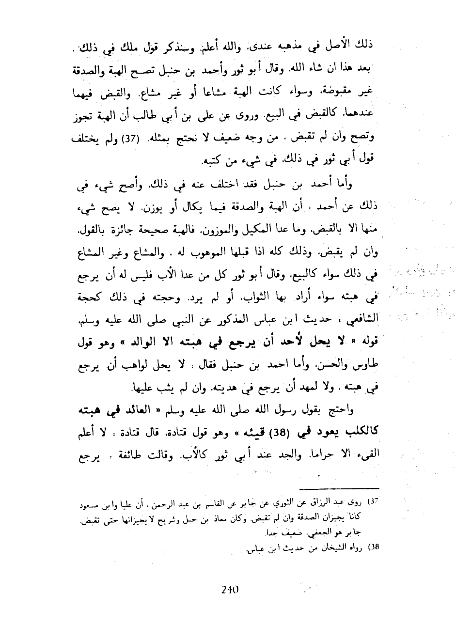 ذَلِكَ الْأَصْلِ فِي مَذْهَبِهِ عِنْدِي وَاللَّهُ أَعْلَمُ وسنذكر قول ملك فِي ذَلِكَ بَعْدَ هَذَا إِنْ شَاءَ اللَّهُ وَقَالَ أَبُو ثَوْرٍ وَأَحْمَدُ بْنُ حَنْبَلٍ تَصِحُّ الْهِبَةُ وَالصَّدَقَةُ غَيْرُ مَقْبُوضَةٍ وَسَوَاءٌ كَانَتِ الْهِبَةُ مَشَاعًا أَوْ غَيْرَ مَشَاعٍ وَالْقَبْضُ فِيهِمَا عِنْدَهُمَا كَالْقَبْضِ فِي الْبَيْعِ وَرُوِيَ عَنْ عَلِيِّ بْنِ أَبِي طَالِبٍ أَنَّ الْهِبَةَ تَجُوزُ وَتَصِحُّ وَإِنْ لَمْ تُقْبَضْ مِنْ وَجْهٍ ضَعِيفٍ لَا نَحْتَجُّ بِمِثْلِهِ وَلَمْ يَخْتَلِفْ قَوْلُ أَبِي ثَوْرٍ فِي ذَلِكَ فِي شَيْءٍ مِنْ كُتُبِهِ وَأَمَّا أَحْمَدُ بْنُ حَنْبَلٍ فَقَدِ اخْتُلِفَ عَنْهُ فِي ذَلِكَ وَأَصَحُّ شَيْءٍ فِي ذَلِكَ عَنْ أَحْمَدَ أَنَّ الْهِبَةَ وَالصَّدَقَةَ فِيمَا يُكَالُ أَوْ يُوزَنُ لَا يَصِحُّ شَيْءٌ مِنْهَا إِلَّا بِالْقَبْضِ وَمَا عَدَا الْمَكِيلَ وَالْمَوْزُونَ فَالْهِبَةُ صَحِيحَةٌ جَائِزَةٌ بِالْقَوْلِ وَإِنْ لَمْ يَقْبِضْ وَذَلِكَ كُلُّهُ إِذَا قَبِلَهَا الْمَوْهُوبُ لَهُ وَالْمَشَاعُ وَغَيْرُ الْمَشَاعِ فِي ذَلِكَ سَوَاءٌ كَالْبَيْعِ وَقَالَ أَبُو ثَوْرٍ كُلُّ مَنْ عَدَا الْأَبَ فَلَيْسَ لَهُ أَنْ يَرْجِعَ فِي هِبَتِهِ سَوَاءً أَرَادَ بِهَا الثَّوَابَ أَوْ لَمْ يُرِدْ وَحُجَّتُهُ فِي ذَلِكَ كَحُجَّةِ الشَّافِعِيِّ حَدِيثُ ابْنِ عَبَّاسٍ الْمَذْكُورِ عَنِ النَّبِيِّ صَلَّى اللَّهُ عَلَيْهِ وَسَلَّمَ قَوْلُهُ لَا يَحِلُّ لِأَحَدٍ أَنْ يَرْجِعَ فِي هِبَتِهِ إِلَّا الْوَالِدَ وَهُوَ قَوْلُ طَاوُسٍ وَالْحَسَنِ وَأَمَّا أَحْمَدُ بْنُ حَنْبَلٍ فَقَالَ لَا يَحِلُّ لِوَاهِبٍ أَنْ يَرْجِعَ فِي هِبَتِهِ وَلَا لِمُهْدٍ أَنْ يَرْجِعَ فِي هَدِيَّتِهِ وَإِنْ لَمْ يُثَبْ عَلَيْهَا وَاحْتَجَّ بِقَوْلِ رَسُولِ اللَّهِ صَلَّى اللَّهُ عَلَيْهِ وَسَلَّمَ الْعَائِدُ فِي هِبَتِهِ كَالْكَلْبِ يَعُودُ فِي قَيْئِهِ وَهُوَ قَوْلُ قَتَادَةَ قَالَ قَتَادَةُ لَا أَعْلَمُ الْقَيْءَ إِلَّا حَرَامًا وَالْجَدُّ عِنْدَ أَبِي ثَوْرٍ كَالْأَبِ وَقَالَتْ طَائِفَةٌ يَرْجِعُ