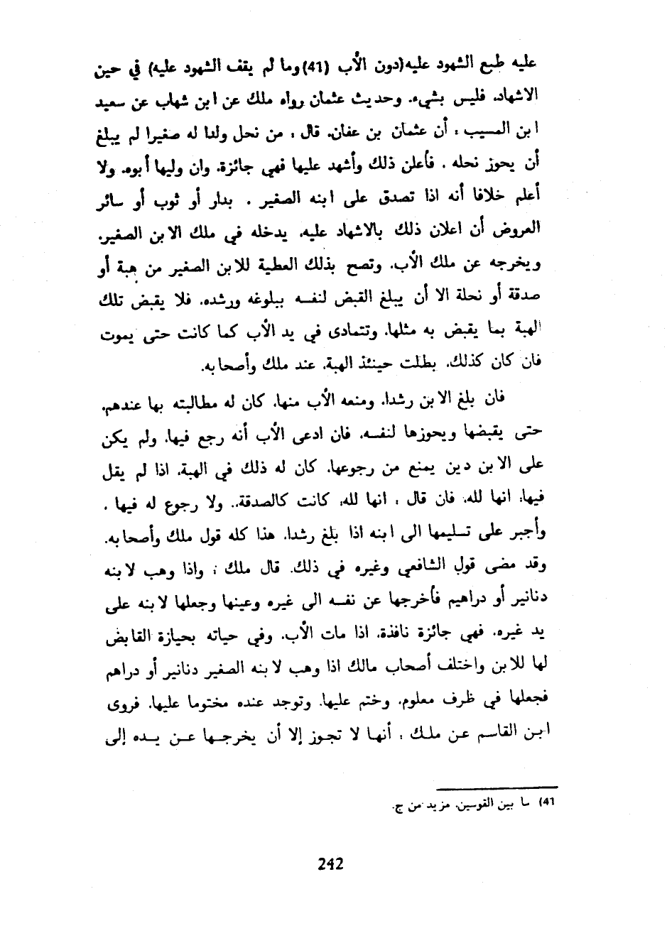 عَلَيْهِ طَبَعَ الشُّهُودُ عَلَيْهِ دُونَ (الْأَبِ (41) وَمَا لَمْ يَقِفِ الشُّهُودُ عَلَيْهِ) فِي حِينِ الْإِشْهَادِ فليس بشيء وحديث عثمان رواه ملك عَنِ ابْنِ شِهَابٍ عَنْ سَعِيدِ بْنِ الْمُسَيَّبِ أَنَّ عُثْمَانَ بْنَ عَفَّانَ قَالَ مَنْ نَحَلَ ولدا له صغيرا لَمْ يَبْلُغْ أَنْ يَحُوزَ نُحْلَهُ فَأَعْلَنَ ذَلِكَ وَأَشْهَدَ عَلَيْهَا فَهِيَ جَائِزَةٌ وَإِنْ وَلِيَهَا أَبُوهُ وَلَا أَعْلَمُ خِلَافًا أَنَّهُ إِذَا تَصَدَّقَ عَلَى ابْنِهِ الصَّغِيرِ بِدَارٍ أَوْ ثَوْبٍ أَوْ سَائِرِ الْعُرُوضِ أَنَّ إِعْلَانَ ذَلِكَ بِالْإِشْهَادِ عَلَيْهِ يُدْخِلُهُ فِي مِلْكِ الِابْنِ الصَّغِيرِ وَيُخْرِجُهُ عَنْ مِلْكِ الْأَبِ وَتَصِحُّ بِذَلِكَ الْعَطِيَّةُ لِلِابْنِ الصَّغِيرِ مِنْ هِبَةٍ أَوْ صَدَقَةٍ أَوْ نُحْلَةٍ إِلَّا أَنْ يَبْلُغَ الْقَبْضُ لِنَفْسِهِ بِبُلُوغِهِ وَرُشْدِهِ فَلَا يَقْبِضُ تلك لهبة بِمَا يَقْبِضُ بِهِ مِثْلَهَا وَتَتَمَادَى فِي يَدِ الْأَبِ كَمَا كَانَتْ حَتَّى يَمُوتَ فَإِنْ كَانَ كذلك بطلت حنيئذ الهبة عند ملك وَأَصْحَابِهِ فَإِنْ بَلَغَ الِابْنُ رُشْدًا وَمَنَعَهُ الْأَبُ مِنْهَا كَانَ لَهُ مُطَالَبَتُهُ بِهَا عِنْدَهُمْ حَتَّى يَقْبِضَهَا وَيَحُوزَهَا لِنَفْسِهِ فَإِنِ ادَّعَى الْأَبُ أَنَّهُ رَجَعَ فِيهَا وَلَمْ يَكُنْ عَلَى الِابْنِ دَيْنٌ يَمْنَعُ مِنْ رُجُوعِهَا كَانَ لَهُ ذَلِكَ فِي الْهِبَةِ إِذَا لَمْ يَقُلْ فِيهَا إِنَّهَا لِلَّهِ فَإِنْ قَالَ إِنَّهَا لِلَّهِ كَانَتْ كَالصَّدَقَةِ وَلَا رُجُوعَ لَهُ فِيهَا وَأُجْبِرَ عَلَى تَسْلِيمِهَا إِلَى ابْنِهِ إِذَا بَلَغَ رُشْدًا هَذَا كُلُّهُ قَوْلُ ملك وَأَصْحَابِهِ وَقَدْ مَضَى قَوْلُ الشَّافِعِيِّ وَغَيْرِهِ فِي ذلك قال ملك وَإِذَا وَهَبَ لِابْنِهِ دَنَانِيرَ أَوْ دَرَاهِيمَ فَأَخْرَجَهَا عَنْ نَفْسِهِ إِلَى غَيْرِهِ وَعَيَّنَهَا وَجَعَلَهَا لِابْنِهِ عَلَى يَدِ غَيْرِهِ فَهِيَ جَائِزَةٌ نَافِذَةٌ إِذَا مَاتَ الْأَبُ وَفِي حَيَاتِهِ بِحِيَازَةِ الْقَابِضِ لَهَا لِلِابْنِ وَاخْتَلَفَ أَصْحَابُ مَالِكٍ إِذَا وَهَبَ لِابْنِهِ الصَّغِيرِ دَنَانِيرَ أَوْ دَرَاهِمَ فَجَعَلَهَا فِي ظَرْفٍ مَعْلُومٍ وَخَتَمَ عَلَيْهَا وَتُوجَدُ عِنْدَهُ مَخْتُومًا عَلَيْهَا فروى ابن القاسم عن ملك أَنَّهَا لَا تَجُوزُ إِلَّا أَنْ يُخْرِجَهَا عَنْ يده إلى