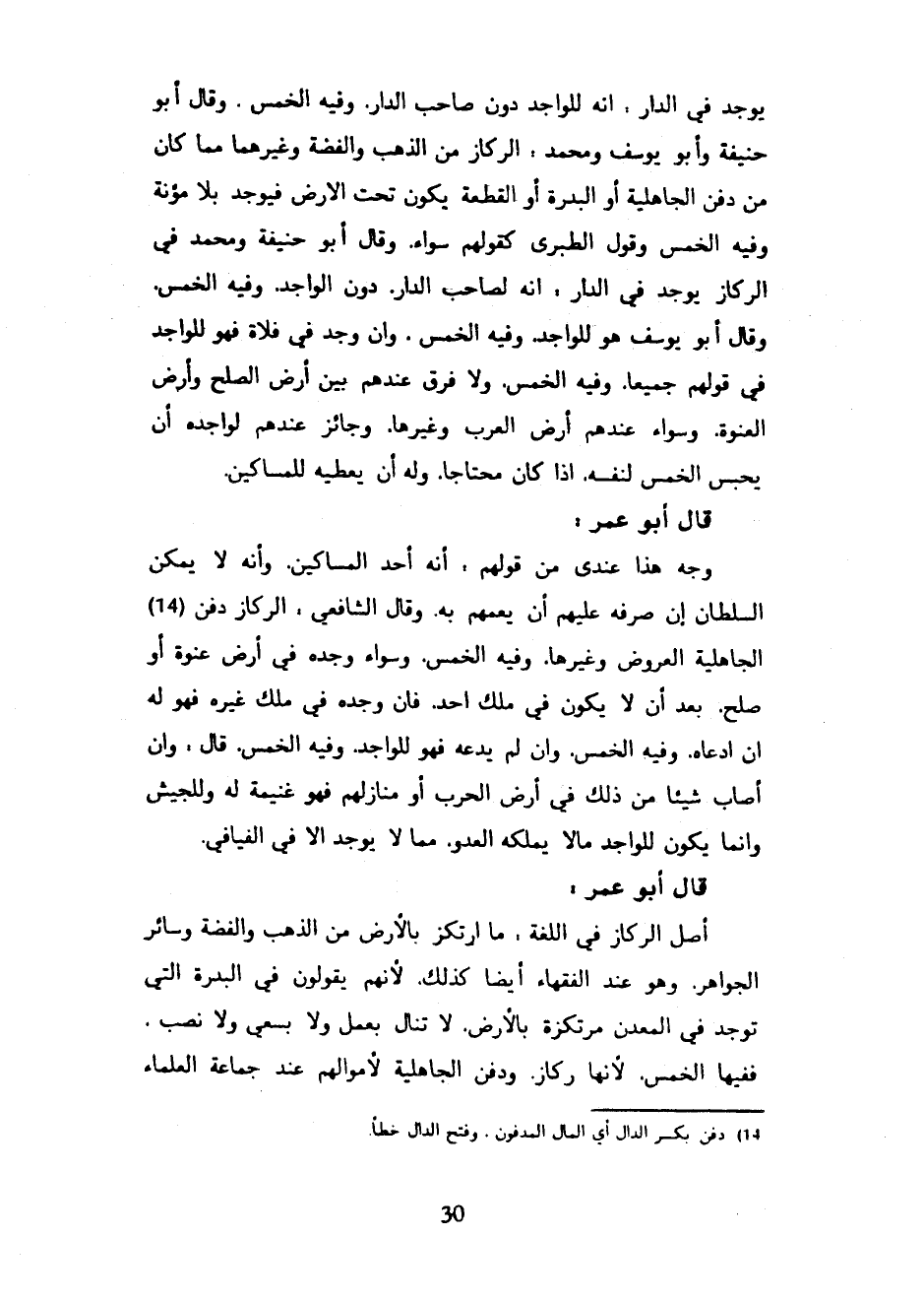 يُوجَدُ فِي الدَّارِ أَنَّهُ لِلْوَاجِدِ دُونَ صَاحِبِ الدَّارِ وَفِيهِ الْخُمُسُ وَقَالَ أَبُو حَنِيفَةَ وَأَبُو يُوسُفَ وَمُحَمَّدٌ الرِّكَازُ مِنَ الذَّهَبِ وَالْفِضَّةِ وَغَيْرِهِمَا مِمَّا كَانَ مِنْ دَفْنِ الْجَاهِلِيَّةِ أَوِ الْبَدْرَةِ أَوِ الْقِطْعَةِ يَكُونُ تَحْتَ الْأَرْضِ فَيُوجَدُ بِلَا مُؤْنَةٍ وَفِيهِ الْخُمُسُ وَقَوْلُ الطَّبَرِيِّ كَقَوْلِهِمْ سَوَاءً وَقَالَ أَبُو حَنِيفَةَ وَمُحَمَّدٌ فِي الرِّكَازِ يُوجَدُ فِي الدَّارِ إِنَّهُ لِصَاحِبِ الدَّارِ دُونَ الْوَاجِدِ وَفِيهِ الْخُمُسُ وَقَالَ أَبُو يُوسُفَ هُوَ لِلْوَاجِدِ وَفِيهِ الْخُمُسُ وَإِنْ وُجِدَ فِي فَلَاةٍ فَهُوَ لِلْوَاجِدِ فِي قَوْلِهِمْ جَمِيعًا وَفِيهِ الْخُمُسُ وَلَا فَرْقَ عِنْدَهُمْ بَيْنَ أَرْضِ الصُّلْحِ وَأَرْضِ الْعَنْوَةِ وَسَوَاءٌ عِنْدَهُمْ أَرْضُ الْعَرَبِ وَغَيْرُهَا وَجَائِزٌ عِنْدَهُمْ لِوَاجِدِهِ أَنْ يَحْبِسَ الْخُمُسَ لِنَفْسِهِ إِذَا كَانَ مُحْتَاجًا وَلَهُ أَنْ يُعْطِيَهُ لِلْمَسَاكِينِ - قَالَ أَبُو عُمَرَ وَجْهُ هَذَا عِنْدِي مِنْ قَوْلِهِمْ أَنَّهُ أَحَدُ الْمَسَاكِينِ وَأَنَّهُ لَا يُمْكِنُ السُّلْطَانَ إِنْ صَرَفَهُ عَلَيْهِمْ أَنْ يَعُمَّهُمْ بِهِ وَقَالَ الشَّافِعِيُّ الرِّكَازُ دَفْنُ الْجَاهِلِيَّةِ الْعَرُوضَ وَغَيْرَهَا وَفِيهِ الْخُمُسُ وَسَوَاءٌ وَجَدَهُ فِي أَرْضِ عَنْوَةٍ أَوْ صُلْحٍ بَعْدَ أَنْ لَا يَكُونَ فِي مِلْكِ أَحَدٍ فَإِنْ وَجَدَهُ فِي مِلْكِ غَيْرِهِ فَهُوَ لَهُ إِنِ ادَّعَاهُ وَفِيهِ الْخُمُسُ وَإِنْ لَمْ يَدَّعِهِ فَهُوَ لِلْوَاجِدِ وَفِيهِ الْخُمُسُ قَالَ وَإِنْ أَصَابَ شَيْئًا مِنْ ذَلِكَ فِي أَرْضِ الْحَرْبِ أَوْ مَنَازِلِهِمْ فَهُوَ غَنِيمَةٌ لَهُ وَلِلْجَيْشِ وَإِنَّمَا يَكُونُ لِلْوَاجِدِ مَا لَا يَمْلِكُهُ الْعَدُوُّ مِمَّا لَا يُوجَدُ إِلَّا فِي الْفَيَافِي - قَالَ أَبُو عُمَرَ أَصْلُ الرِّكَازِ فِي اللُّغَةِ مَا ارْتَكَزَ بِالْأَرْضِ مِنَ الذَّهَبِ وَالْفِضَّةِ وَسَائِرِ الْجَوَاهِرِ وَهُوَ عِنْدَ الْفُقَهَاءِ أَيْضًا كَذَلِكَ لِأَنَّهُمْ يَقُولُونَ فِي الْبَدْرَةِ الَّتِي تُوجَدُ فِي الْمَعْدِنِ مُرْتَكِزَةً بِالْأَرْضِ لَا تُنَالُ بِعَمَلٍ وَلَا بِسَعْيٍ وَلَا نَصَبٍ فَفِيهَا الْخُمُسُ لِأَنَّهَا رِكَازٌ وَدَفْنُ الْجَاهِلِيَّةِ لِأَمْوَالِهِمْ عِنْدَ جماعة العلماء