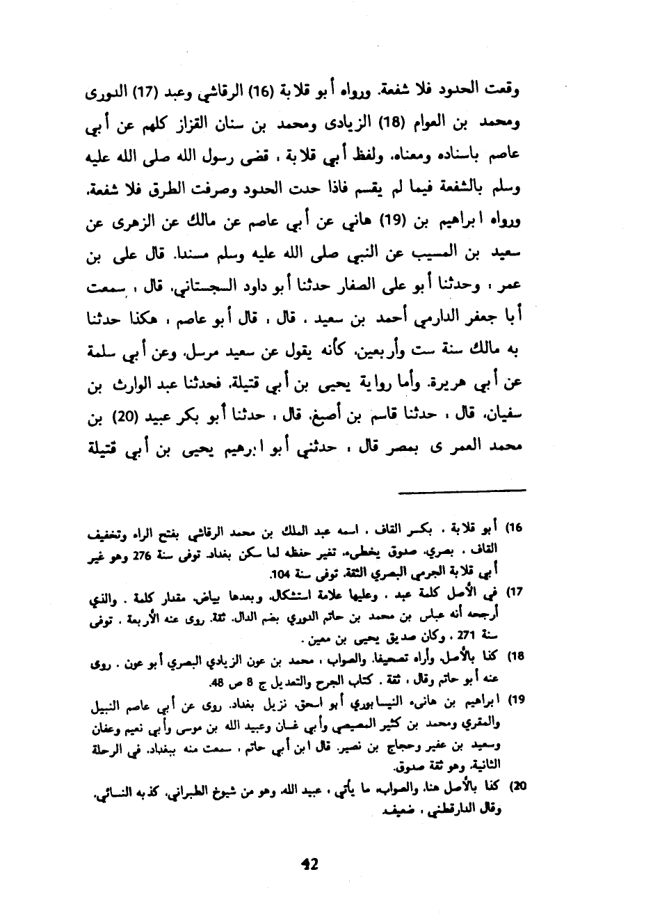 وَقَعَتِ الْحُدُودُ فَلَا شُفْعَةَ وَرَوَاهُ أَبُو قِلَابَةَ الرَّقَاشِيُّ وَعَبْدٌ الدُّورِيُّ وَمُحَمَّدُ بْنُ الْعَوَّامِ الزِّيَادِيُّ وَمُحَمَّدُ بْنُ سِنَانٍ الْقَزَّازُ كُلُّهُمْ عَنْ أَبِي عَاصِمٍ بِإِسْنَادِهِ وَمَعْنَاهُ وَلَفْظُ أَبِي قِلَابَةَ قَضَى رَسُولُ اللَّهِ صَلَّى اللَّهُ عَلَيْهِ وَسَلَّمَ بالشفعة فِيمَا لَمْ يُقْسَمْ فَإِذَا حُدَّتِ الْحُدُودُ وَصُرِفَتِ الطُّرُقُ فَلَا شُفْعَةَ وَرَوَاهُ إِبْرَاهِيمُ بْنُ هَانِي عَنْ أَبِي عَاصِمٍ عَنْ مَالِكٌ عَنِ الزُّهْرِيِّ عَنْ سَعِيدِ بْنِ الْمُسَيَّبِ عَنِ النَّبِيِّ صَلَّى اللَّهُ عَلَيْهِ وَسَلَّمَ مُسْنَدًا قَالَ عَلِيُّ بْنُ عُمَرَ وَحَدَّثَنَا أَبُو عَلِيٍّ الصَّفَّارُ حَدَّثَنَا أَبُو دَاوُدَ السِّجِسْتَانِيُّ قَالَ سَمِعْتُ أَبَا جَعْفَرٍ الدَّارِمِيَّ أَحْمَدَ بْنَ سَعِيدٍ قَالَ قَالَ أَبُو عَاصِمٍ هَكَذَا حَدَّثَنَا بِهِ مَالِكٌ سَنَةَ سِتٍّ وَأَرْبَعِينَ كَأَنَّهُ يَقُولُ عَنْ سَعِيدٍ مُرْسَلٌ وَعَنْ أَبِي سَلَمَةَ عَنْ أَبِي هُرَيْرَةَ وَأَمَّا رِوَايَةُ يَحْيَى بْنِ أَبِي قُتَيْلَةَ فَحَدَّثَنَا عَبْدُ الْوَارِثِ بْنُ سُفْيَانَ قَالَ حَدَّثَنَا قَاسِمُ بْنُ أَصْبَغَ قَالَ حَدَّثَنَا أَبُو بَكْرٍ عُبَيْدُ بْنُ مُحَمَّدٍ الْعُمَرِيُّ بِمِصْرَ قَالَ حَدَّثَنِي أَبُو إِبْرَاهِيمَ يَحْيَى بْنُ أبي قتيلة
