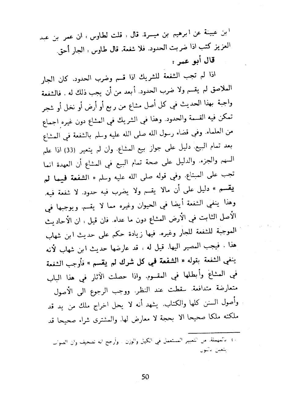 ابْنُ عُيَيْنَةَ عَنْ إِبْرَاهِيمَ بْنِ مَيْسَرَةَ قَالَ قُلْتُ لِطَاوُسٍ إِنَّ عُمَرَ بْنَ عَبْدِ الْعَزِيزِ كَتَبَ إِذَا ضُرِبَتِ الْحُدُودُ فَلَا شُفْعَةَ قَالَ طَاوُسٌ الْجَارُ أَحَقُّ - قَالَ أَبُو عُمَرَ إِذَا لَمْ تَجِبِ الشُّفْعَةُ لِلشَّرِيكِ إِذَا قَسَّمَ وَضَرَبَ الْحُدُودَ كَانَ الْجَارُ الْمُلَاصِقُ لَمْ يُقْسَمْ وَلَا ضَرَبَ الْحُدُودَ أَبْعَدَ مِنْ أَنْ يَجِبَ ذَلِكَ لَهُ فَالشُّفْعَةُ وَاجِبَةٌ بِهَذَا الْحَدِيثِ فِي كُلِّ أَصْلٍ مَشَاعٍ مِنْ رَبْعٍ أَوْ أَرْضٍ أَوْ نَخْلٍ أَوْ شَجَرٍ تَمْكُنُ فِيهِ الْقِسْمَةُ وَالْحُدُودُ وَهَذَا فِي الشَّرِيكِ فِي الْمَشَاعِ دُونَ غَيْرِهِ إِجْمَاعٌ مِنَ الْعُلَمَاءِ وَفِي قَضَاءُ رَسُولِ اللَّهِ صَلَّى اللَّهُ عَلَيْهِ وَسَلَّمَ بالشفعة فِي الْمَشَاعِ بَعْدَ تَمَامِ الْبَيْعِ دَلِيلٌ عَلَى جَوَازِ بَيْعِ الْمَشَاعِ وَإِنْ لَمْ يَتَغَيَّرْ! إِذَا عُلِمَ السَّهْمُ وَالْجُزْءُ وَالدَّلِيلُ عَلَى صِحَّةِ تَمَامِ الْبَيْعِ فِي الْمَشَاعِ أَنَّ الْعُهْدَةَ إِنَّمَا تَجِبُ عَلَى الْمُبْتَاعِ وَفِي قَوْلِهِ صَلَّى اللَّهُ عَلَيْهِ وَسَلَّمَ الشُّفْعَةُ فِيمَا لَمْ يُقْسَمْ دَلِيلٌ عَلَى أن مالا يُقْسَمْ وَلَا يُضْرَبُ فِيهِ حُدُودٌ لَا شُفْعَةَ فِيهِ وَهَذَا يَنْفِي الشُّفْعَةَ أَيْضًا فِي الْحَيَوَانِ وَغَيْرِهِ مِمَّا لَا يُقْسَمْ وَيُوجِبُهَا فِي الْأَصْلِ الثَّابِتِ فِي الْأَرْضِ الْمَشَاعِ دُونَ مَا عَدَاهُ فَإِنْ قِيلَ إِنَّ الْأَحَادِيثَ الْمُوجِبَةَ لِلشُّفْعَةِ لِلْجَارِ وَغَيْرِهِ فِيهَا زِيَادَةُ حُكْمٍ عَلَى حَدِيثِ ابْنِ شِهَابٍ هَذَا فَيَجِبُ الْمَصِيرُ إِلَيْهَا قِيلَ لَهُ قَدْ عَارَضَهَا حَدِيثُ ابْنِ شِهَابٍ لِأَنَّهُ يَنْفِي الشُّفْعَةَ بِقَوْلِهِ الشُّفْعَةُ فِي كُلِّ شِرْكٍ لَمْ يُقْسَمْ فَأَوْجَبَ الشُّفْعَةَ فِي الْمَشَاعِ وَأَبْطَلَهَا فِي الْمَقْسُومِ وَإِذَا حَصَلَتِ الْآثَارُ فِي هَذَا الْبَابِ مُتَعَارِضَةً مُتَدَافِعَةً سَقَطَتْ عِنْدَ النَّظَرِ وَوَجَبَ الرُّجُوعُ إِلَى الْأُصُولِ وَأُصُولُ السُّنَنِ كُلُّهَا وَالْكِتَابُ يَشْهَدُ أَنَّهُ لَا يَحِلُّ إِخْرَاجُ مِلْكٍ مِنْ يَدٍ قَدْ مَلَكَتْهُ مِلْكًا صَحِيحًا إِلَّا بِحُجَّةٍ لَا مُعَارِضَ لَهَا وَالْمُشْتَرِي شِرَاءً صَحِيحًا قَدْ