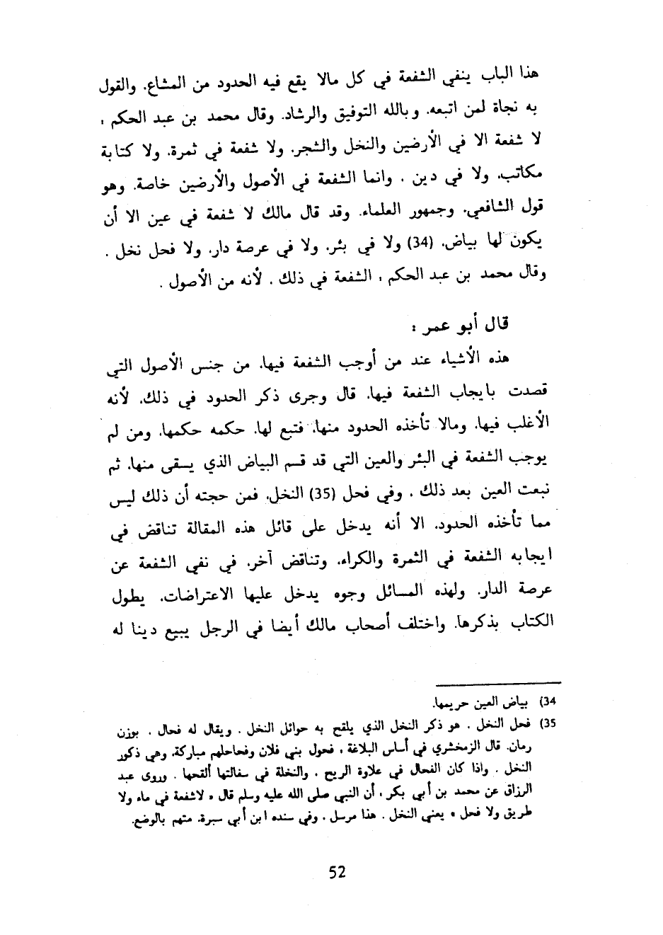 هذا الباب ينفي الشفعة في كل مالا يَقَعُ فِيهِ الْحُدُودُ مِنَ الْمَشَاعِ وَالْقَوْلُ بِهِ نَجَاةٌ لِمَنِ اتَّبَعَهُ وَبِاللَّهِ التَّوْفِيقُ وَالرَّشَادُ وَقَالَ مُحَمَّدُ بْنُ عَبْدِ الْحَكَمِ لَا شُفْعَةَ إِلَّا فِي الْأَرْضِينَ وَالنَّخْلِ وَالشَّجَرِ وَلَا شُفْعَةَ فِي ثَمَرَةٍ وَلَا كِتَابَةِ مُكَاتِبٍ وَلَا فِي دَيْنٍ وَإِنَّمَا الشُّفْعَةُ فِي الْأُصُولِ وَالْأَرْضِينَ خَاصَّةً وَهُوَ قَوْلُ الشَّافِعِيِّ وَجُمْهُورِ الْعُلَمَاءِ وَقَدْ قَالَ مَالِكٌ لَا شُفْعَةَ فِي عَيْنٍ إِلَّا أَنْ يَكُونَ لَهَا بَيَاضٌ وَلَا فِي بِئْرٍ وَلَا فِي عَرْصَةِ دَارٍ وَلَا فَحْلِ نَخْلٍ وَقَالَ مُحَمَّدُ بْنُ عَبْدِ الْحَكَمِ الشُّفْعَةُ فِي ذَلِكَ لِأَنَّهُ مِنَ الْأُصُولِ - قَالَ أَبُو عُمَرَ هَذِهِ الْأَشْيَاءُ عِنْدَ مَنْ أَوْجَبَ الشُّفْعَةَ فِيهَا مِنْ جِنْسِ الْأُصُولِ الَّتِي قُصِدَتْ بِإِيجَابِ الشُّفْعَةِ فِيهَا قَالَ وَجَرَى ذِكْرُ الْحُدُودِ فِي ذَلِكَ لِأَنَّهُ الْأَغْلَبُ فِيهَا وَمَا لَا تَأْخُذُهُ الْحُدُودُ مِنْهَا فَتَبَعٌ لَهَا حُكْمُهُ حُكْمُهَا وَمَنْ لَمْ يُوجِبِ الشُّفْعَةَ فِي الْبِئْرِ وَالْعَيْنِ الَّتِي قَدْ قُسِّمَ الْبَيَاضُ الَّذِي يُسْقَى مِنْهَا ثُمَّ نَبَعَتِ الْعَيْنُ بَعْدَ ذَلِكَ وَفِي فَحْلِ النَّخْلِ فَمِنْ حُجَّتِهِ أَنَّ ذَلِكَ لَيْسَ مِمَّا تَأْخُذُهُ الْحُدُودُ إِلَّا أَنَّهُ يَدْخُلُ عَلَى قَائِلِ هَذِهِ الْمَقَالَةِ تَنَاقُضٌ فِي إِيجَابِهِ الشُّفْعَةَ فِي الثَّمَرَةِ وَالْكِرَاءِ وَتَنَاقُضٌ آخَرُ فِي نَفْيِ الشُّفْعَةِ عَنْ عَرْصَةِ الدَّارِ وَلِهَذِهِ الْمَسَائِلِ وُجُوهٌ يَدْخُلُ عَلَيْهَا الِاعْتِرَاضَاتُ يَطُولُ الْكِتَابُ بِذِكْرِهَا وَاخْتَلَفَ أَصْحَابُ مَالِكٍ أَيْضًا فِي الرَّجُلِ يَبِيعُ دَيْنًا لَهُ