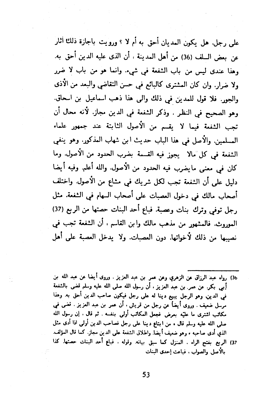 عَلَى رَجُلٍ هَلْ يَكُونُ الْمِدْيَانُ أَحَقَّ بِهِ أم لا ورويت بإجازة ذلك آثار بَعْضِ السَّلَفِ مِنْ أَهْلِ الْمَدِينَةِ أَنَّ الَّذِي عَلَيْهِ الدَّيْنُ أَحَقُّ بِهِ وَهَذَا عِنْدِي لَيْسَ مِنْ بَابِ الشُّفْعَةِ فِي شَيْءٍ وَإِنَّمَا هُوَ مِنْ بَابِ لَا ضَرَرَ وَلَا ضِرَارَ وَإِنْ كَانَ الْمُشْتَرِي كَالْبَائِعِ فِي حُسْنِ التَّقَاضِي وَالْبُعْدِ مِنَ الْأَذَى وَالْجَوْرِ فَلَا قَوْلَ لِلْمَدِينِ فِي ذَلِكَ وَإِلَى هَذَا ذَهَبَ إِسْمَاعِيلُ بْنُ إِسْحَاقَ وَهُوَ الصَّحِيحُ فِي النَّظَرِ وَذِكْرُ الشُّفْعَةِ فِي الدَّيْنِ مَجَازٌ لِأَنَّهُ مُحَالٌ أَنْ تَجِبَ الشُّفْعَةُ فِيمَا لَا يُقْسَمْ مِنَ الْأُصُولِ الثَّابِتَةِ عِنْدَ جُمْهُورِ عُلَمَاءِ الْمُسْلِمِينَ وَالْأَصْلُ فِي هَذَا الْبَابِ حَدِيثُ ابْنِ شِهَابٍ الْمَذْكُورُ وَهُوَ يَنْفِي الشُّفْعَةَ فِي كُلِّ مَا لَا يَجُوزُ فِيهِ الْقِسْمَةُ بِضَرْبِ الْحُدُودِ مِنَ الْأُصُولِ وَمَا كَانَ فِي مَعْنَى مَا يُضْرَبُ فِيهِ الْحُدُودُ مِنَ الْأُصُولِ وَاللَّهُ أَعْلَمُ وَفِيهِ أَيْضًا دَلِيلٌ عَلَى أَنَّ الشُّفْعَةَ تَجِبُ لِكُلِّ شَرِيكٍ فِي مَشَاعٍ مِنَ الْأُصُولِ وَاخْتَلَفَ أَصْحَابُ مَالِكٍ فِي دُخُولِ الْعَصَبَاتِ عَلَى أَصْحَابِ السِّهَامِ فِي الشُّفْعَةِ مِثْلُ رَجُلٌ تُوُفِّيَ وَتَرَكَ بَنَاتٍ وَعَصَبَةً فَبَاعَ أَحَدُ الْبَنَاتِ حِصَّتَهَا مِنَ الرُّبْعِ الْمَوْرُوثِ فَالْمَشْهُورُ مِنْ مَذْهَبِ مَالِكٍ وَابْنِ الْقَاسِمِ أَنَّ الشُّفْعَةَ تَجِبُ فِي نَصِيبِهَا مِنْ ذَلِكَ لِأَخَوَاتِهَا دُونَ الْعَصَبَاتِ وَلَا يَدْخُلُ الْعَصَبَةُ عَلَى أَهْلِ